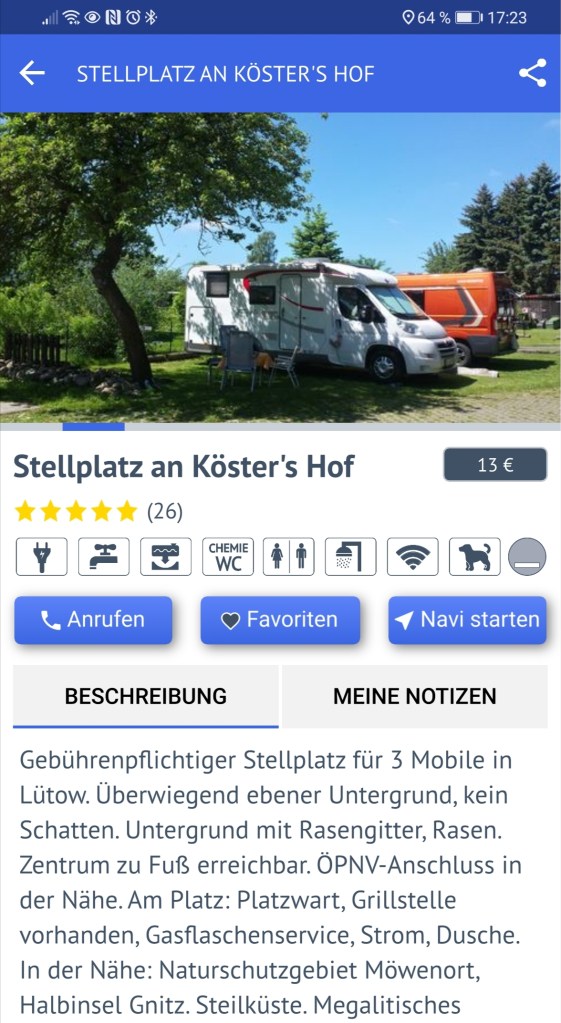 Wir fahren erst einmal zum „Runterkommen“ nach Usedom. Kathleen war vor einigen Wochen zu Besuch dort und hat sich verschiedene Camping- und Stellplätze angeschaut. Aber so richtig überzeugt hat uns das alles nicht. Durch Zufall erfuhren wir über die „Stellplatz-Radar-App“ von Promobil vom kleinen Stellplatz „Köster´s Hof“ auf der Halbinsel Gnitz. Hier haben 3 Mobile Platz – das ist etwas für uns…