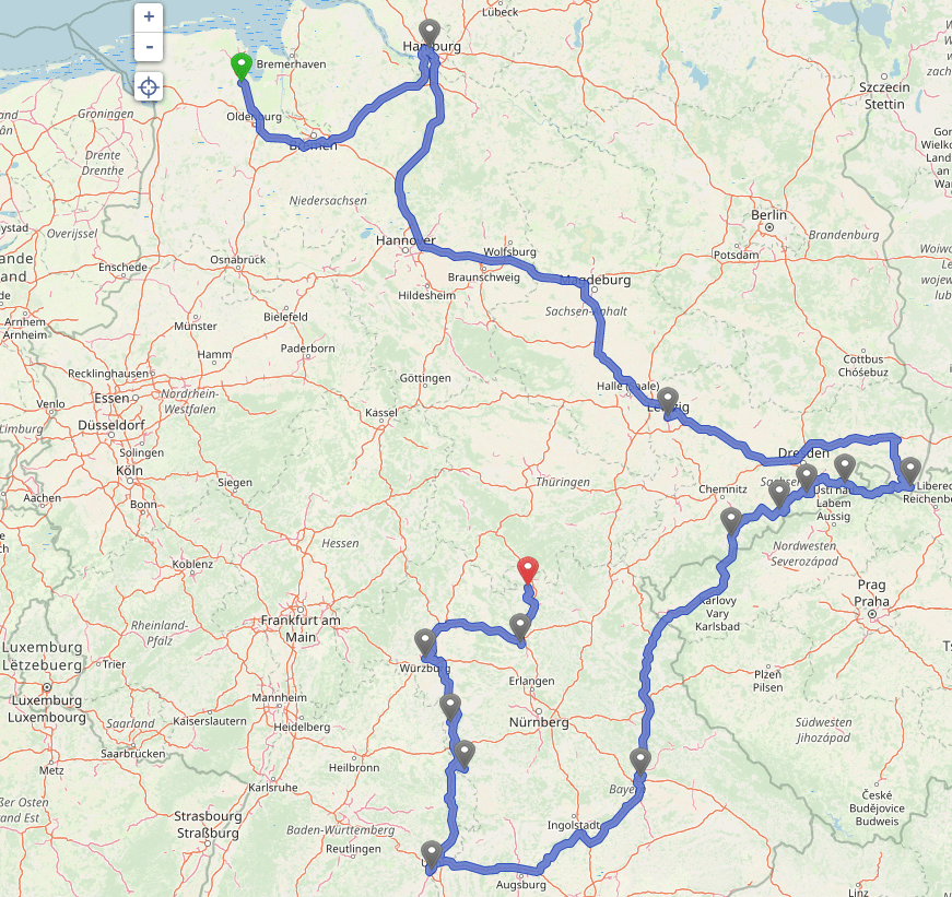 Nach unserer Entspannungsphase auf Usedom wollen wir in den Süd-Osten unserer Republik. Einige Ideen haben wir bereits zusammengetragen. Die Punkte auf der Route haben wir aufgrund der besseren Übersicht in die Nähe der größeren Städte gesetzt.