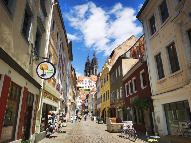 Nach etwa 45 Minuten war der Gang erledigt und wir machten uns auf den Weg nach Meißen. Wir wollten am Elbufer stehen, in die City laufen um uns ein Bild zu machen und gegen Nachmittag zu den „Weinterassen Kämpfe“ fahren, um dort kostenlos zu übernachten (wir fanden „Kämpfe“ als einzigen Vertreter in der Region <Sächsische Weinstraße> im Winzeratlas). Eine vorherige Anmeldung per Telefon offenbarte uns jedoch schon, dass es die – im Winzeratlas angepriesene – Winzerplatte mit kleiner Weinprobe nicht geben würde. So entschlossen wir beim örtlichen Asia-Snack eine kleine „Nudel-Pfanne“ einzunehmen, da es im wirklich traumhaften Innenstadt-Bereich von Meißen nur original sächsische Mittagsspeisen mit Klößen, Soße und viel Rotkraut gab (nicht unbedingt unser Begehr bei 29 Grad Temperatur gegen Mittag war).
