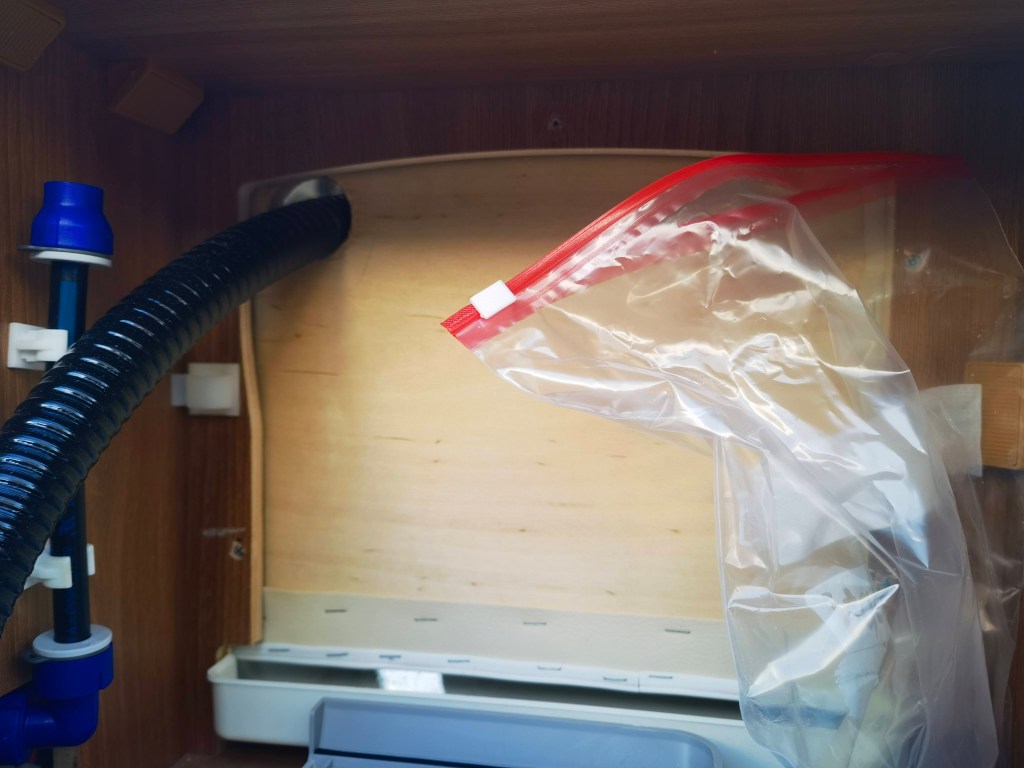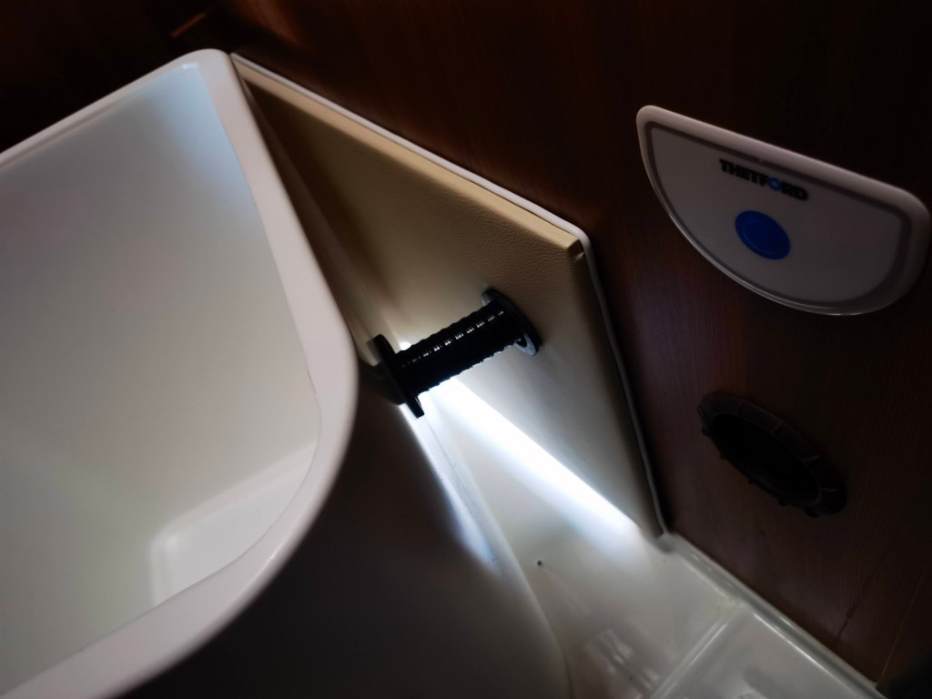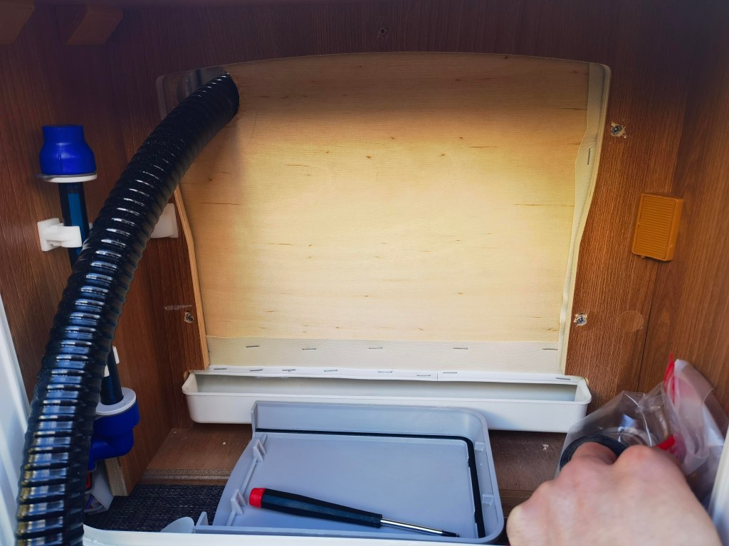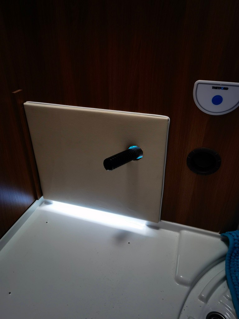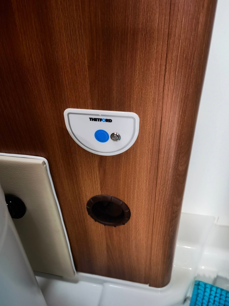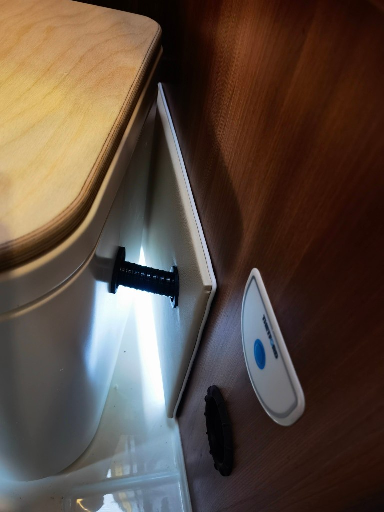 Bilder sagen mehr als Worte, also hier eine kleine „Diashow“ des Umbaus. Die Toilette hatte ich Anfang Januar „auf blauen Dunst“ bestellt, sie war bis dato nur ein gerendertes Bild und es gab keine echten Bilder. Allerdings war von vornherein klar, dass diese Toilette die Einzige sein würde, die wir nehmen konnten, da sie die maximalen Abmessungen nicht überschreiten würde. Es dauerte tatsächlich 11 Wochen, bis das Paket ankam und ich die neue Toilette einbauen konnte. Der Ausbau der Thetford Kassettentoilette war schnell und sauber gemacht (ca. 30 Minuten). Die überflüssige Abzweigung der Spülwasserleitung verschloss ich mit einem Blindstopfen und das original Panel mit dem Spültaster erweiterte ich um den Knopf für die Lüftung. Weiter bekam die Öffnung / Klappe in der Außenwand noch eine Bohrung für den Lüfter und das SOG-Filtergehäuse.