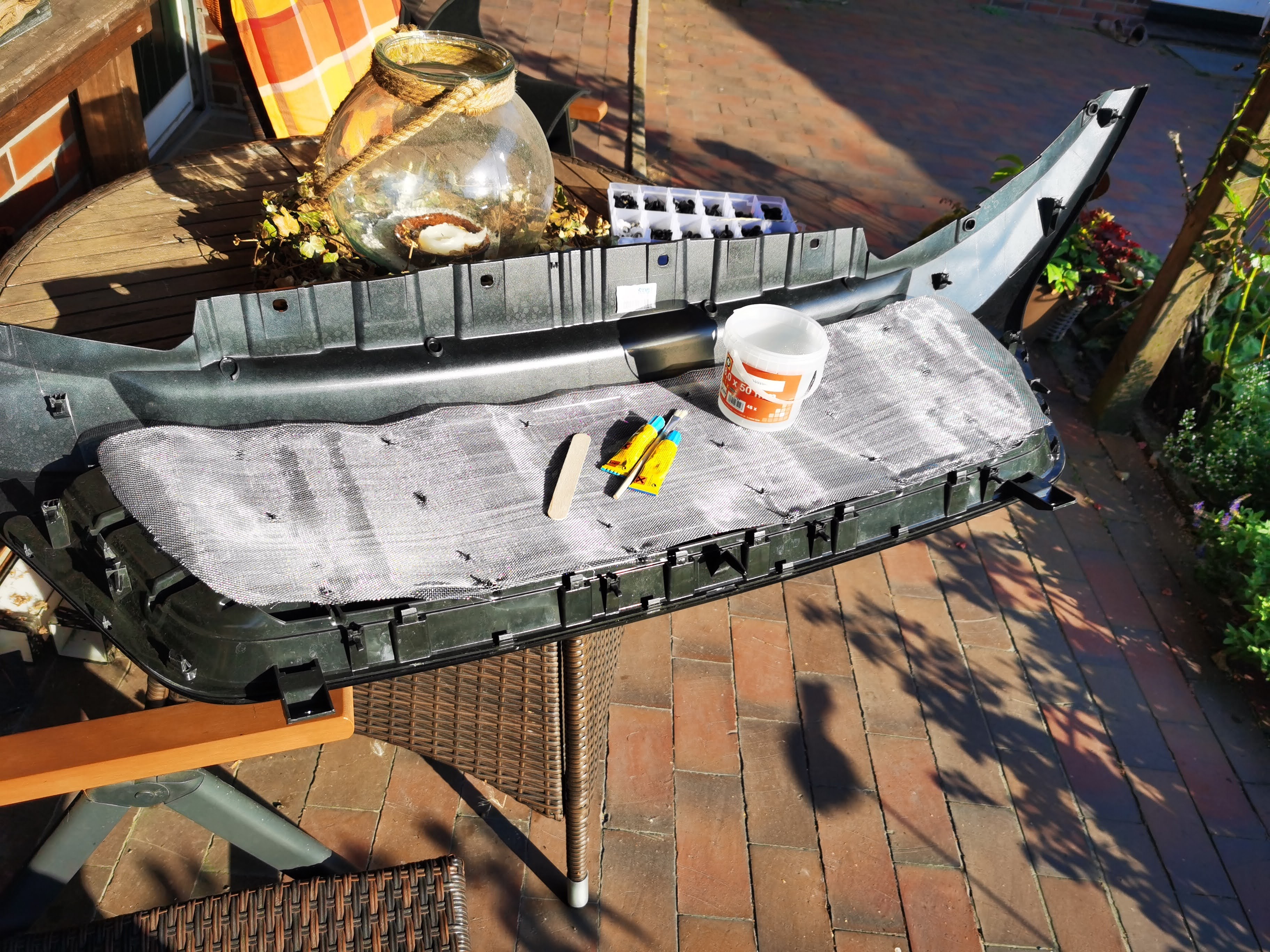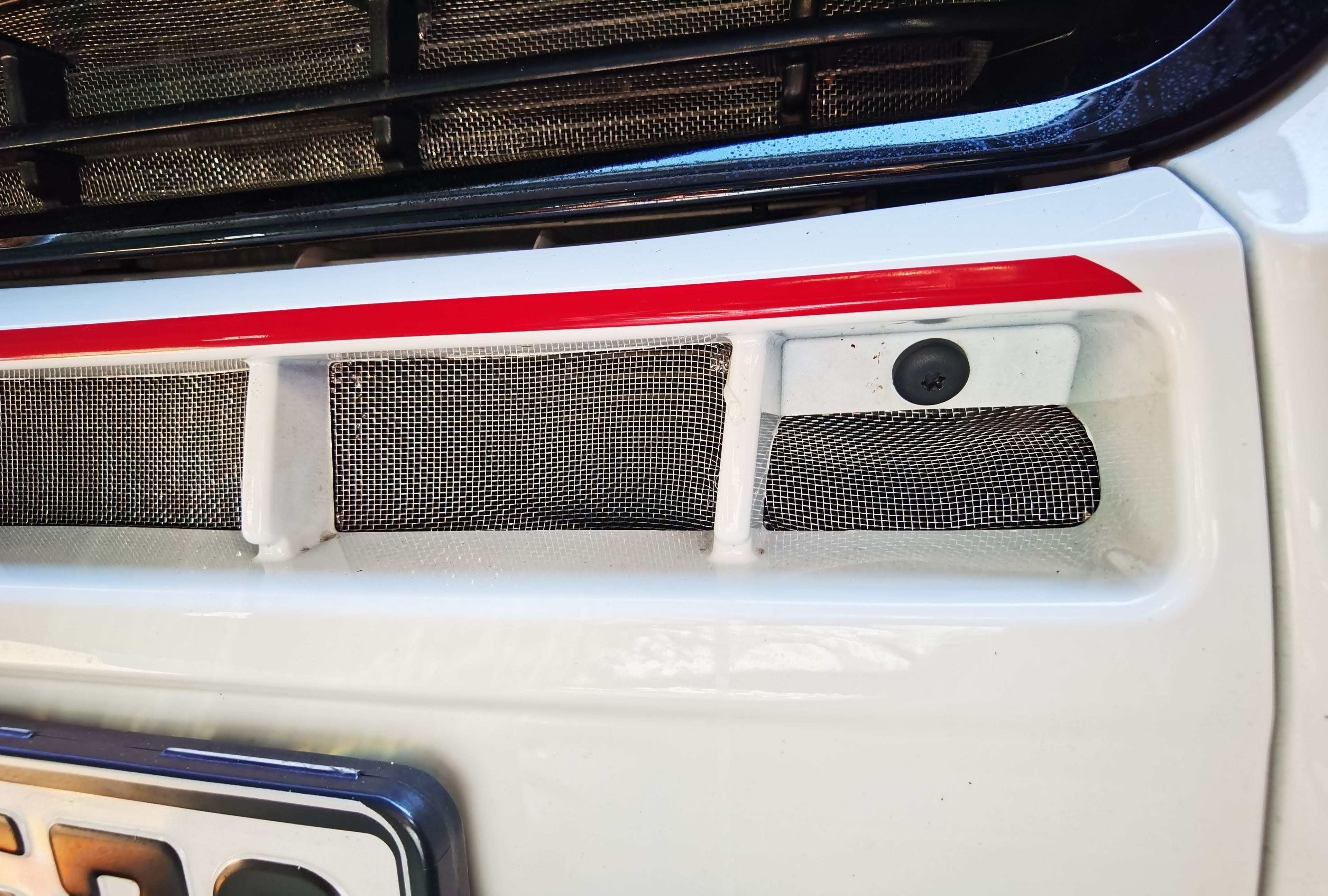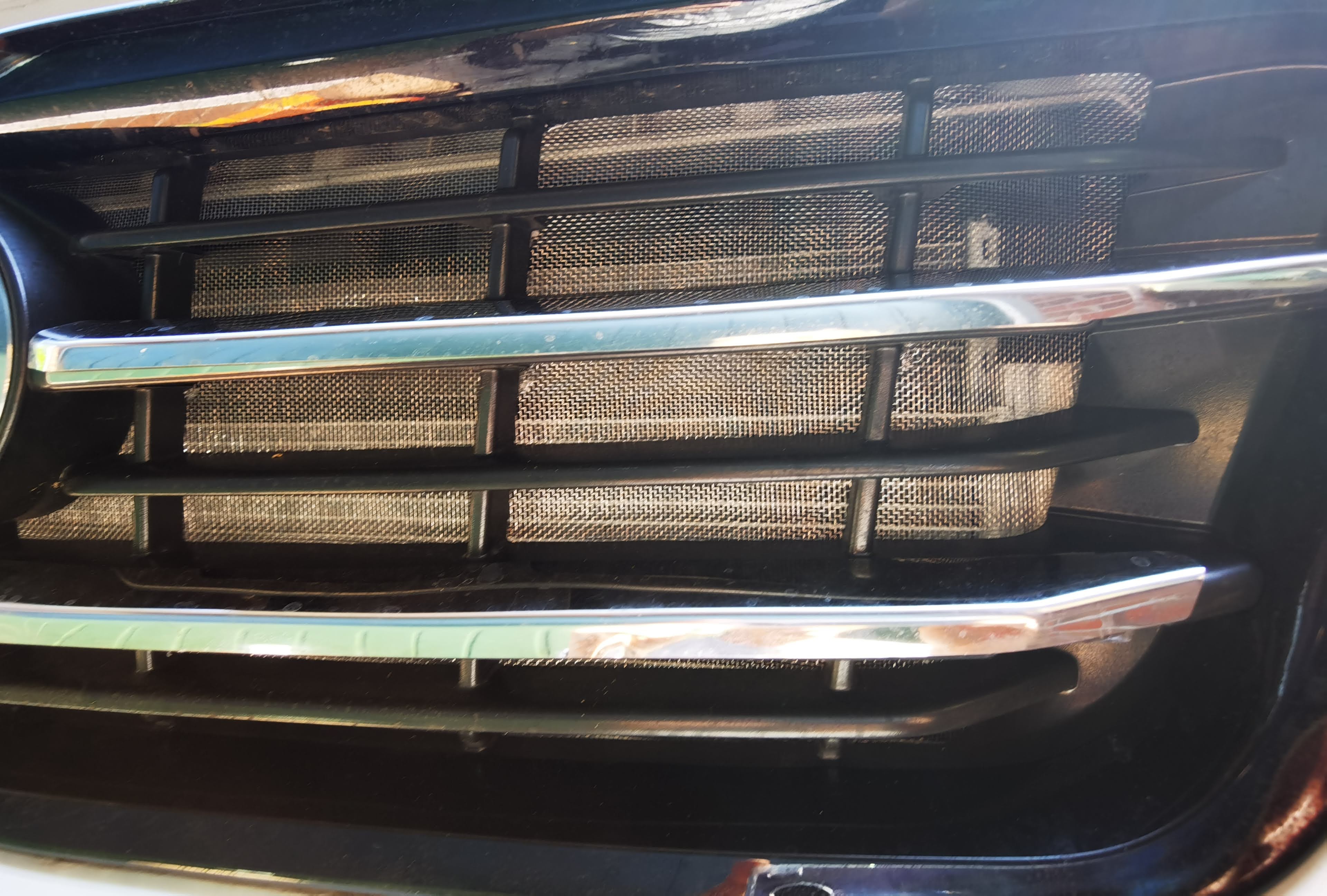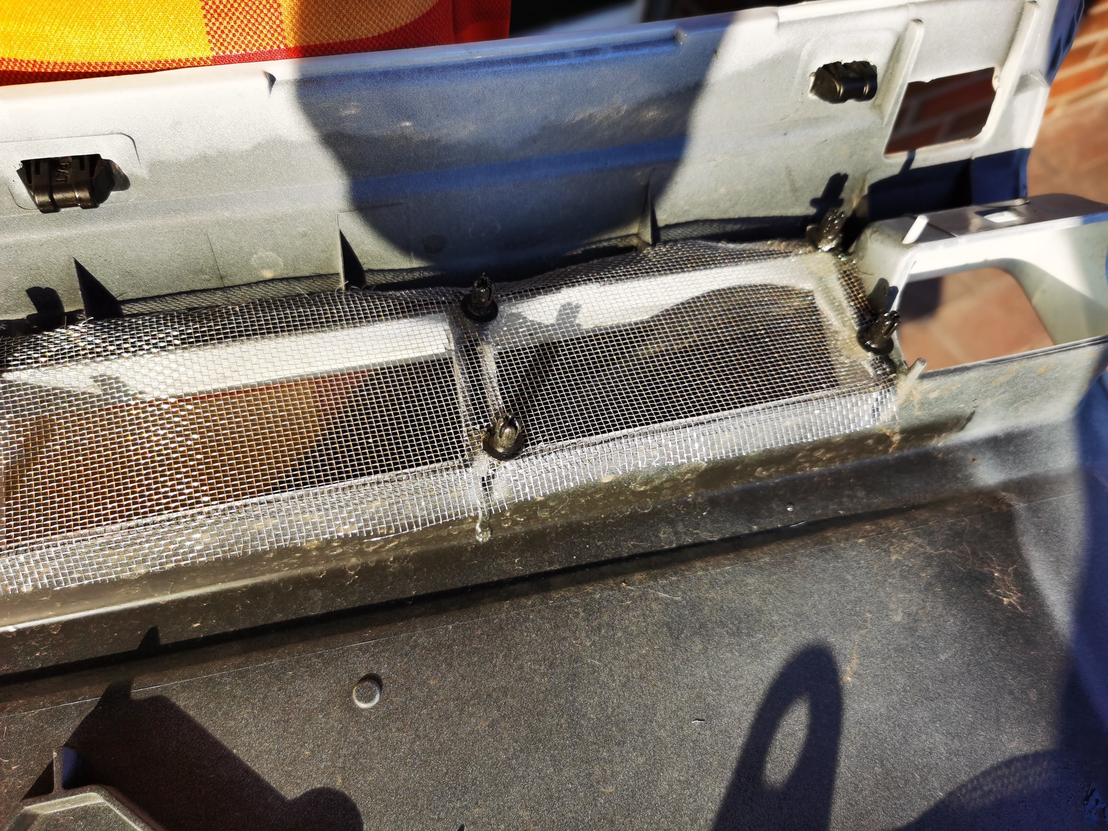 Horst war es auch, der mich auf die bereits vorhanden verbogenen Lamellen an beiden Kühlern aufmerksam machte. Mann – o – mann! Nach nur (damals) knapp 4000km – schon viele umgebogene Lamellen. Aber auch hier verriet Horst mir, dass die verbauten Verkleidungen beim Fiat schon mit Aufnahme-„Nupsis“ versehen sind und man nur ein passendes Gitter anbringen müsste. Meine Recherche im Netz brachte jedoch keine passenden Teile (die angebotenen Gitter in konfektionierter Größe, waren mit so großen Löchern ausgestattet, dass man Golfbälle durchwerfen hätte können). Ich bestellte kurzerhand ein Abdeckgitter für einen Kellerschacht aus Aluminium bei einem großen Versandhaus im Netz und freute mich für 8€ über ein echt gutes Ausgangsmaterial! Der Ausbau der vorderen Front wirkte erst befremdlich, da man doch eine ganze Menge Teile abbauen musste. Ist schon irgendwie unentspannt, bei einem 5 Monate alten Fahrzeug die komplette Front zu demontieren..