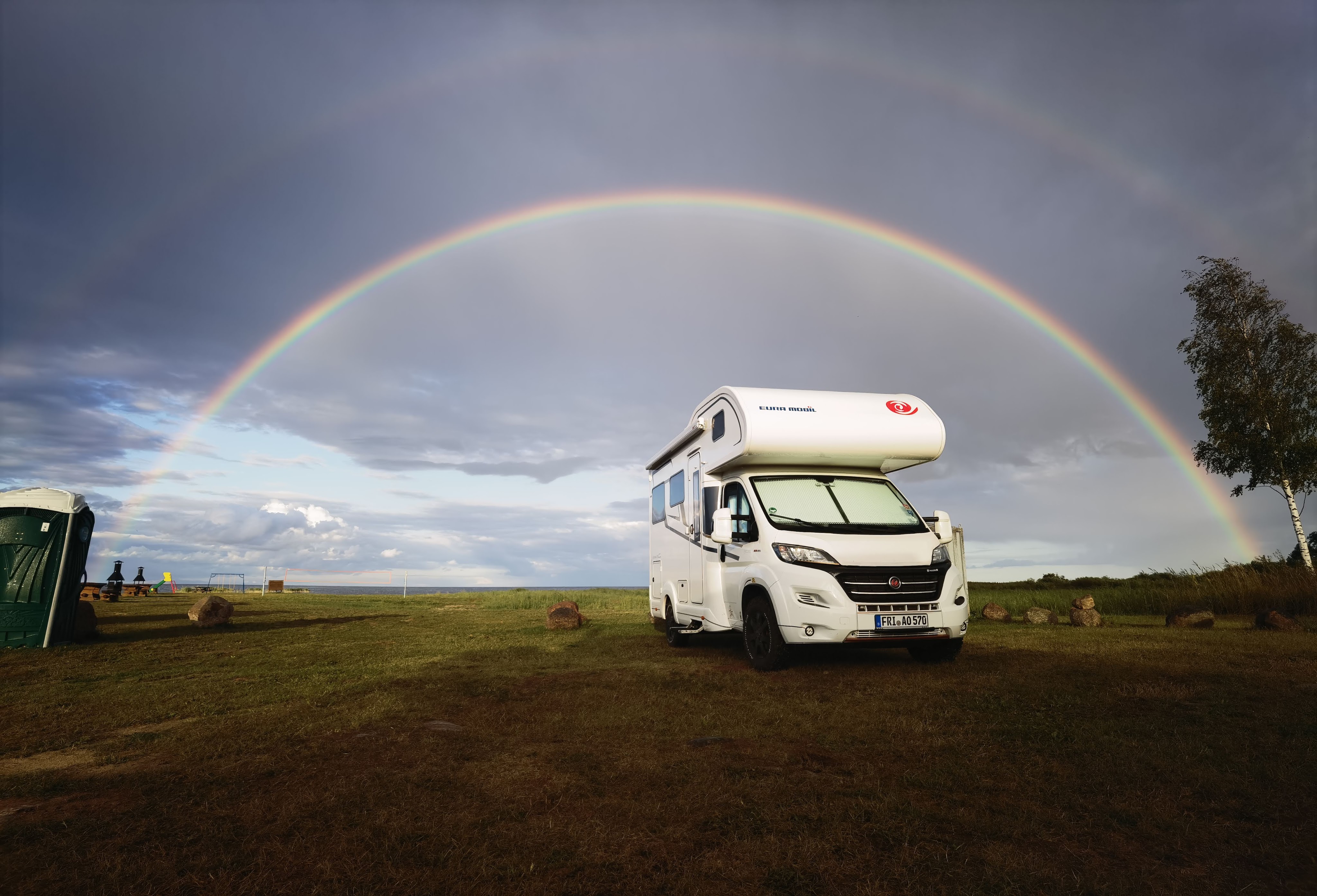 Der richtige Augenblick, denn mit der untergehenden Sonne im Rücken und der Regenfront über Russland, wurden wir Zeugen des wahrhaftig tollsten Regenbogen, den wir jemals bis dato gesehen hatten. Eigentlich waren es zwei Regenbögen und beide wirklich von Anfang bis Ende sichtbar. Wahnsinn.