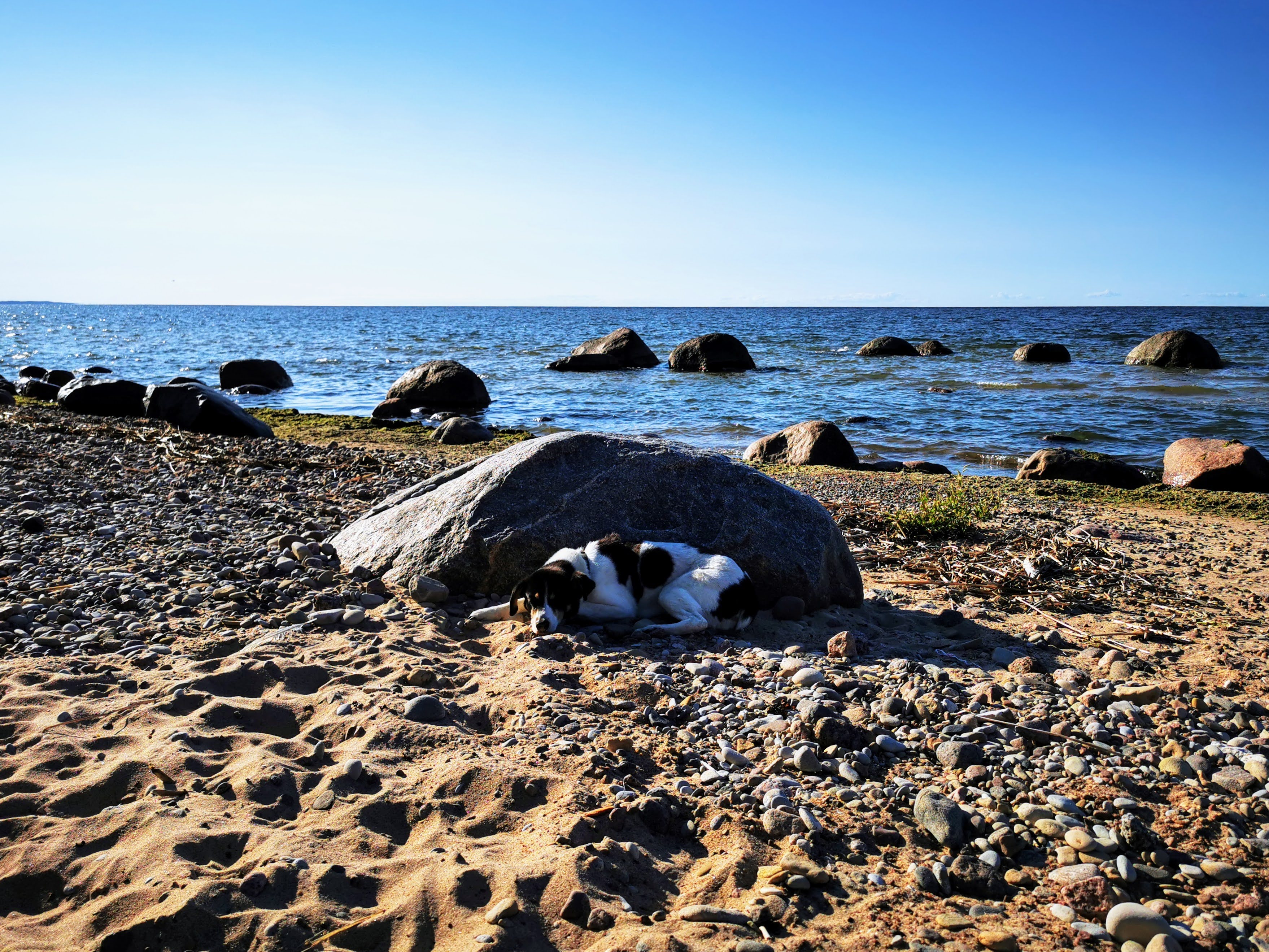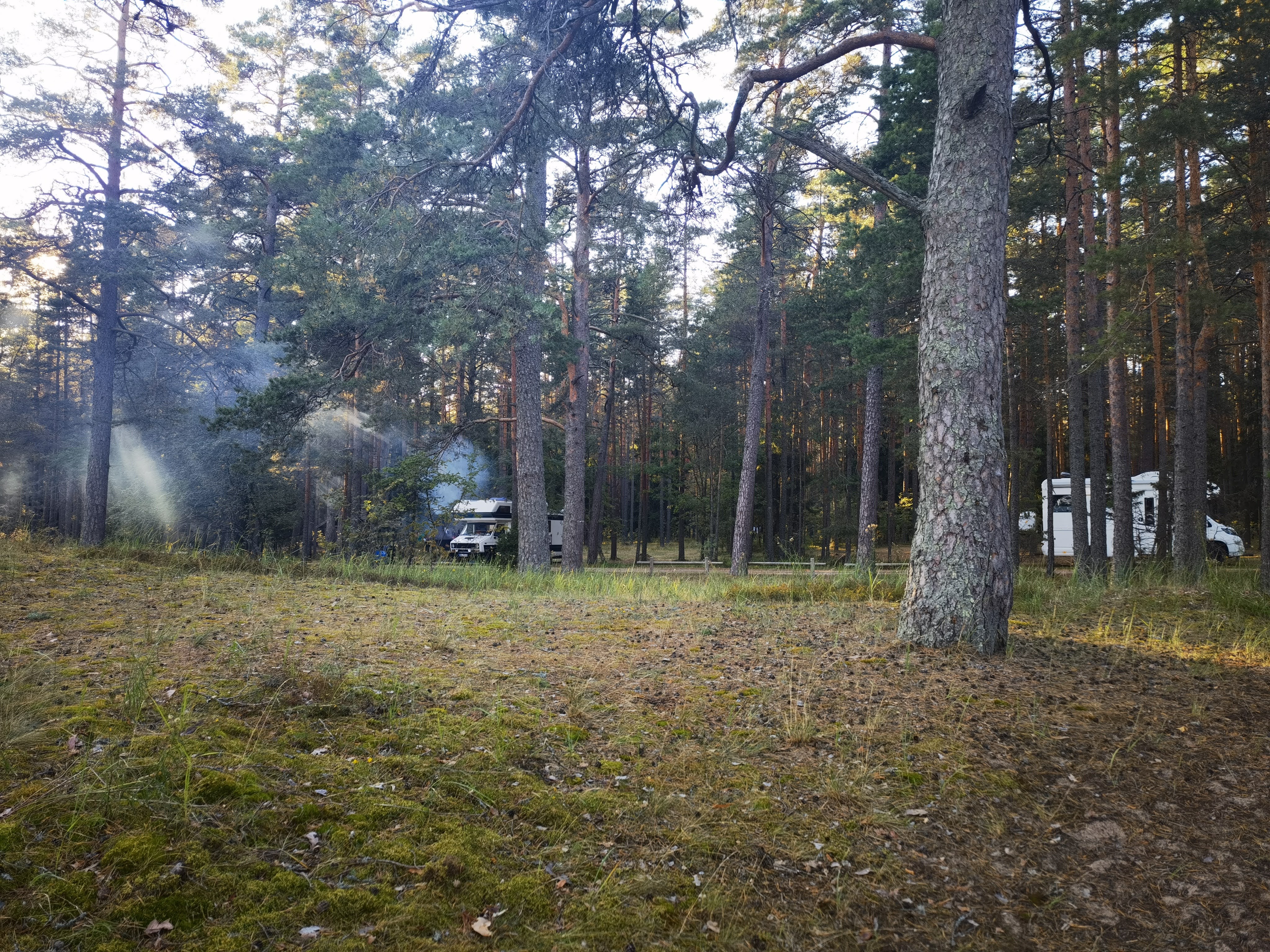 Der Abend im Wald auf dem RMK-Grill/Zeltplatz war super ruhig. Auf der einen Seite grillte eine 6 köpfige Familie ihr Abendessen und auf der anderen Seite (aber wesentlich weiter weg) standen 3 estnische Wohnwagen und man machte spät am Abend ein Lagerfeuer. Zu hören war von alledem nichts…Ich ging mit Frau Hund früh an den Strand um zu schauen, wie das Licht wohl morgens über dem Peipus See wirken würde, aber es war schon zu spät, die Sonne stand schon zu hoch.