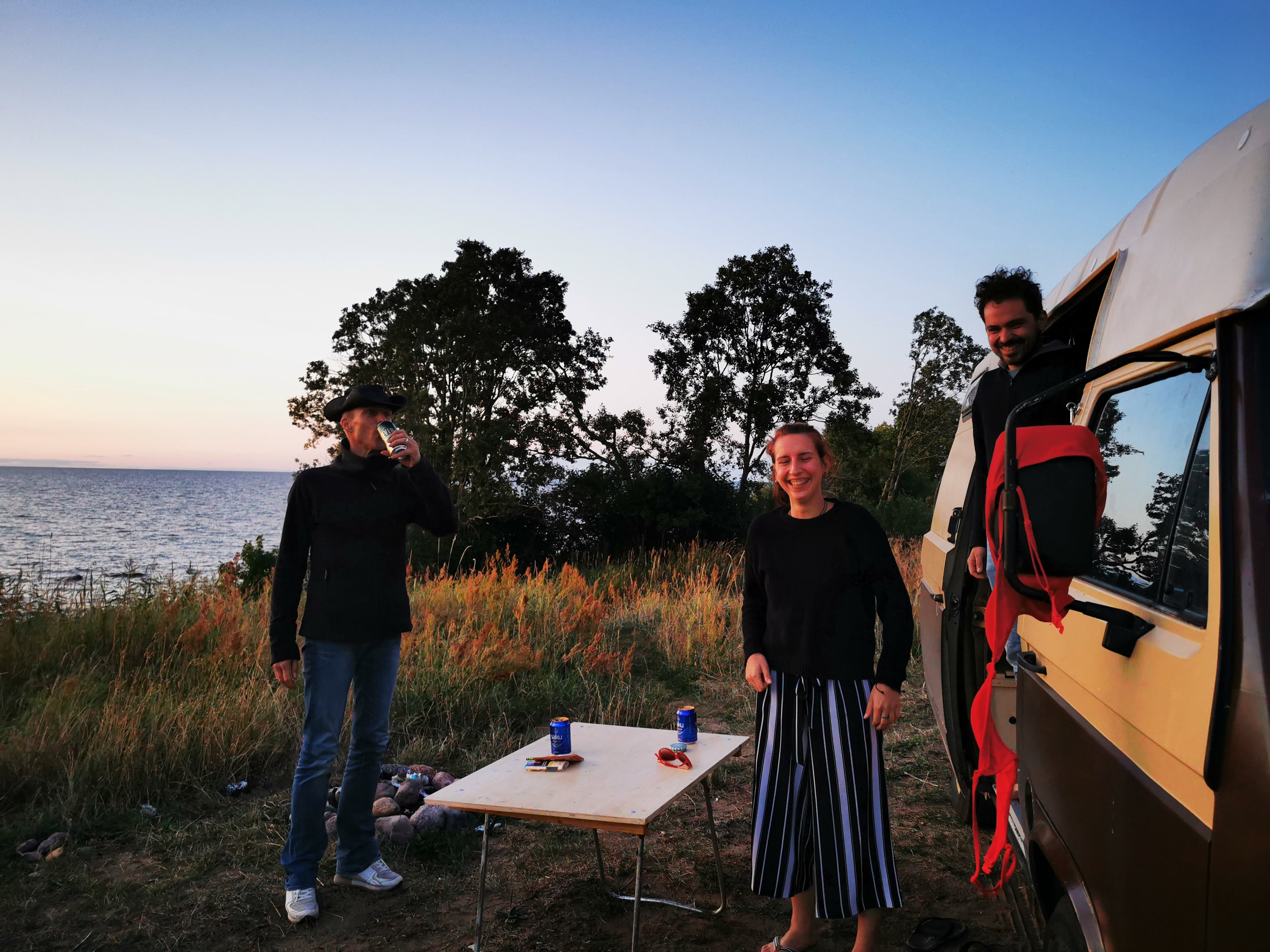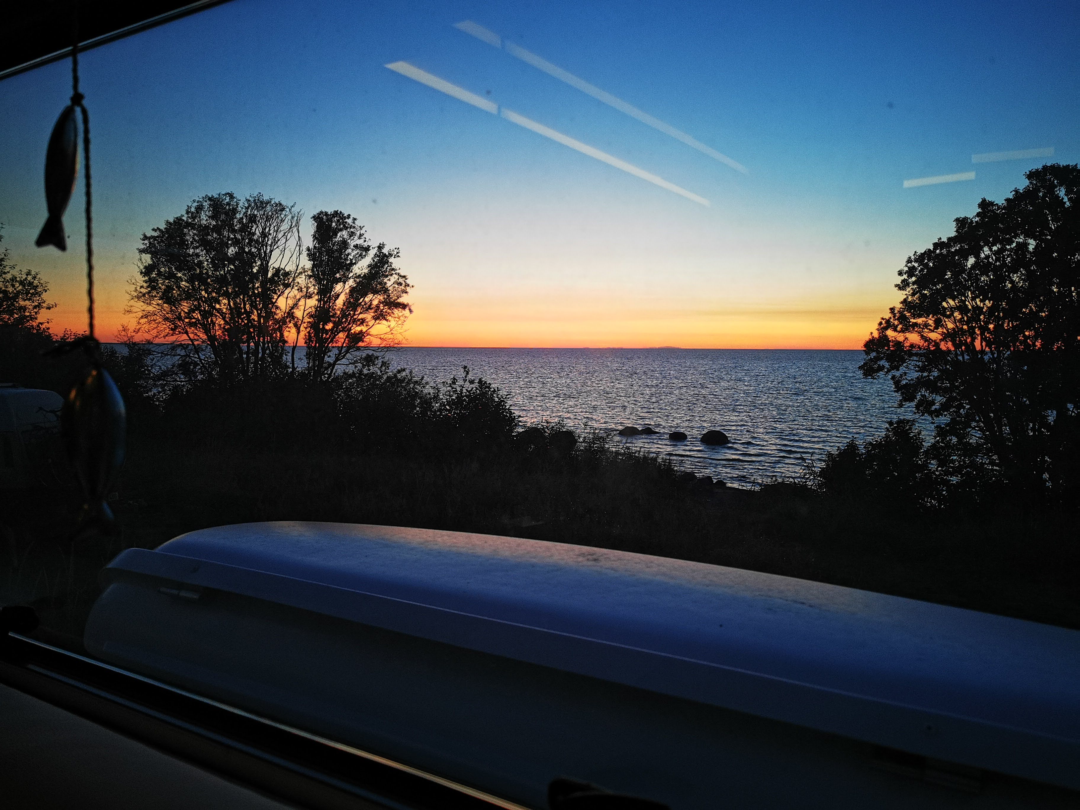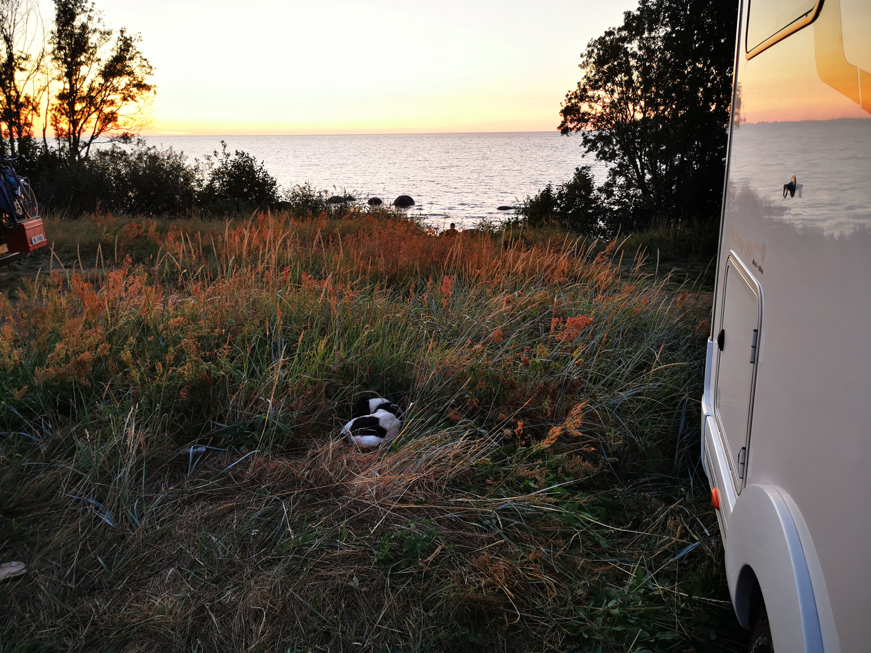 Also, auf zum nächsten Platz. Er wirkte erst unspektakulär, wir sellten unser Mobil auf einem Wiesenparkplatz bei zwei weiteren PKWs ab und wollten zu Fuß erkunden, ob wir irgendwie noch näher an den Strand kommen würden, oder zumindest ein Plateau erreichen könnten, so dass wir aus unserer Hecksitzgruppe mit ihren geliebten Panorama-Fenstern auf den Finnischen Meerbusen schauen könnten. Das es hier nachher einen phänomenalen Sonnenuntergang geben würde, war bei dem Wetter jetzt schon klar.