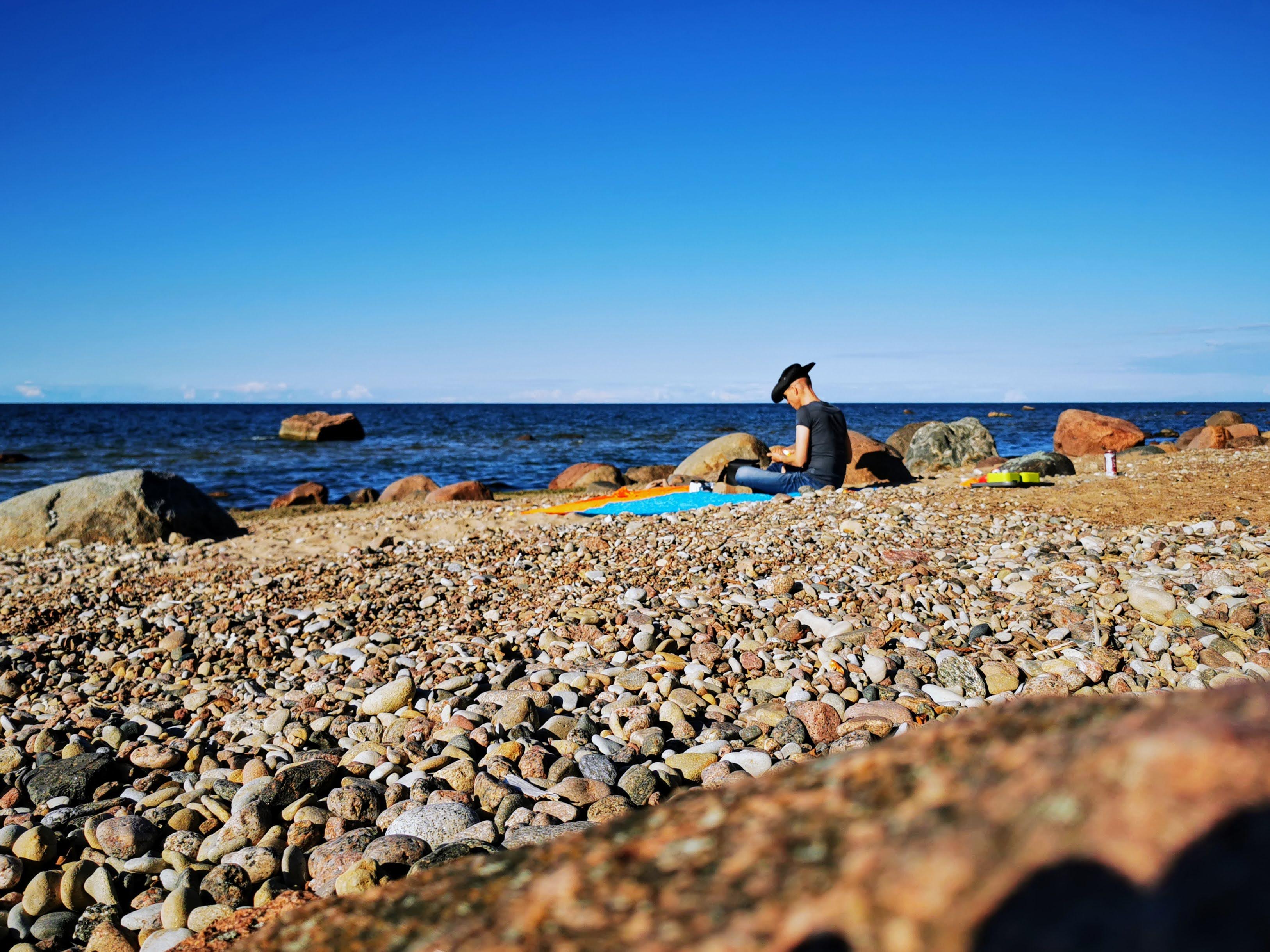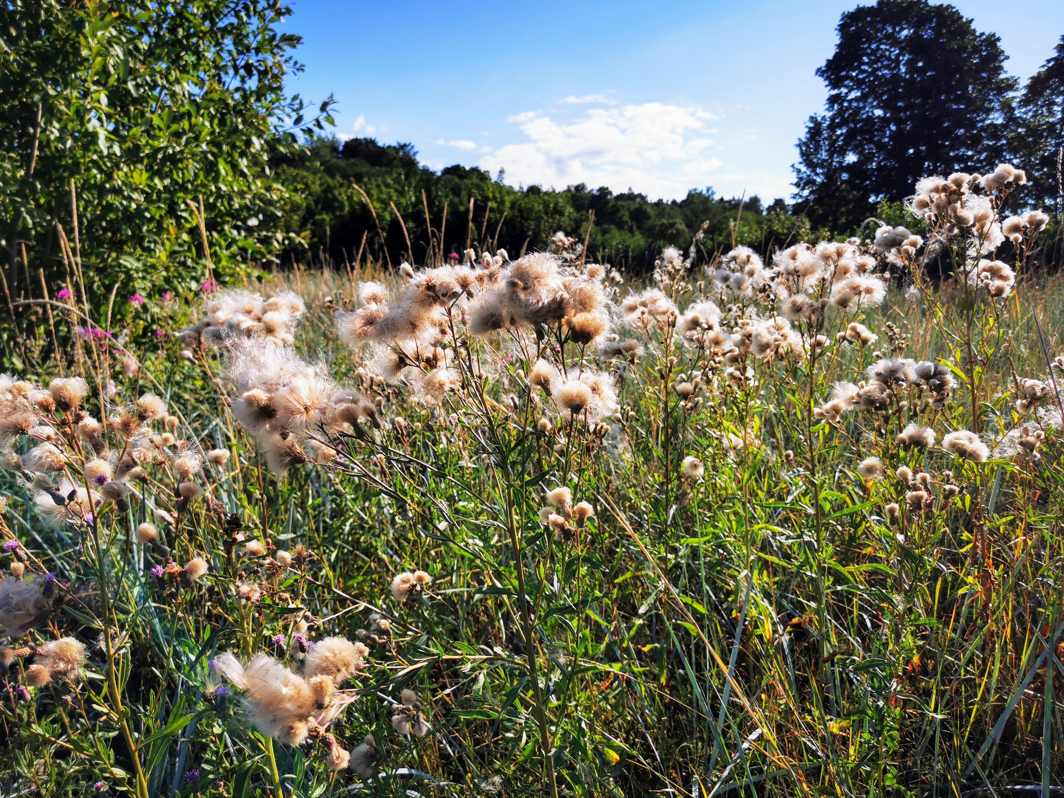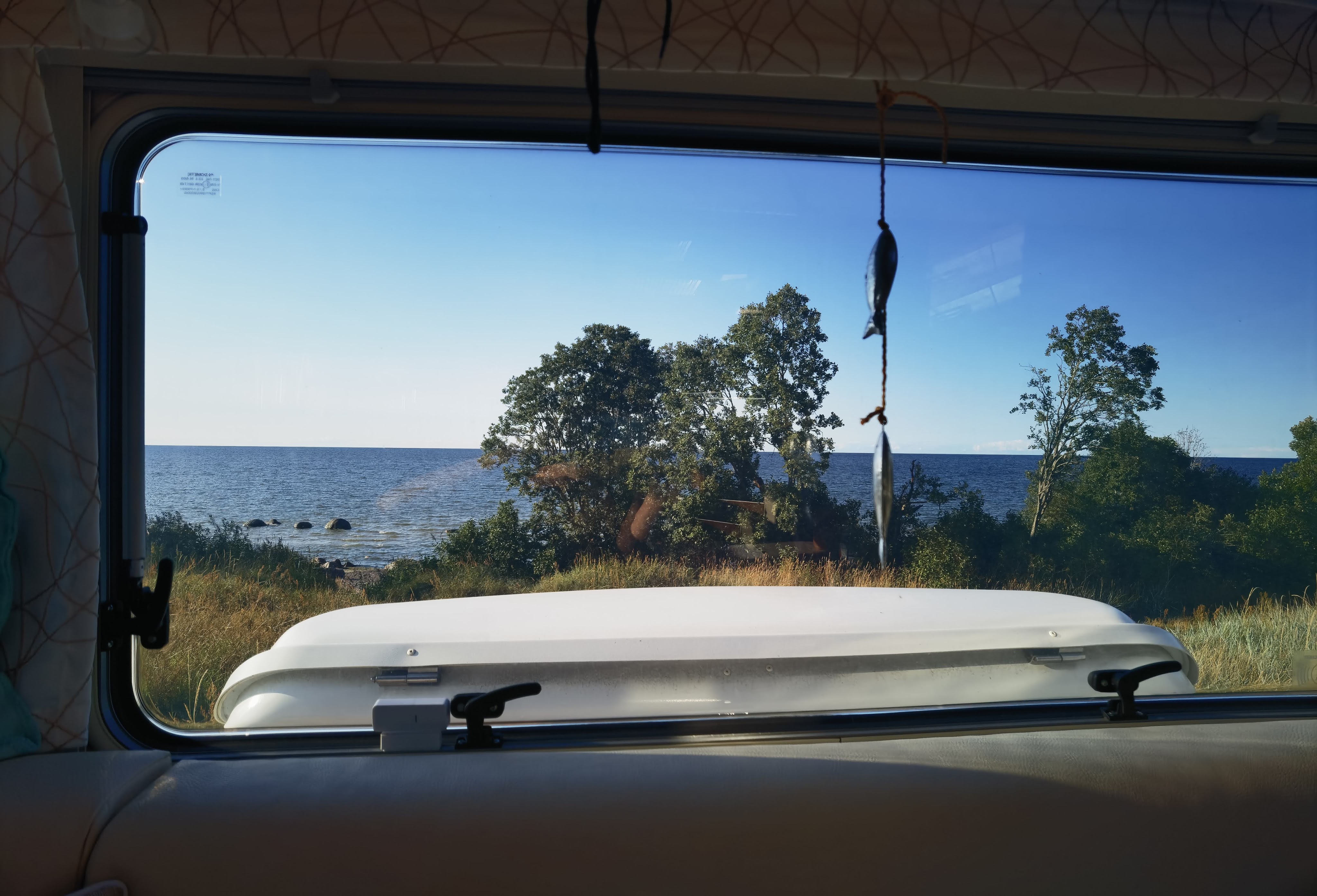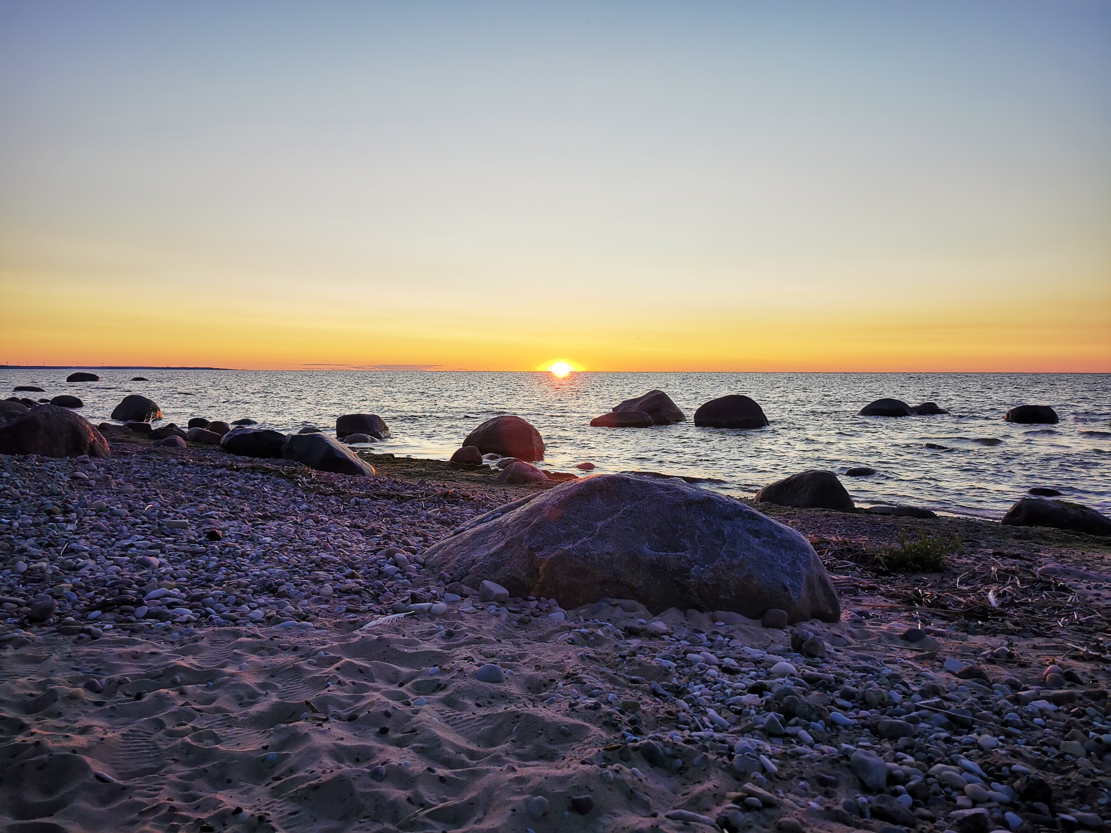 Also, auf zum nächsten Platz. Er wirkte erst unspektakulär, wir sellten unser Mobil auf einem Wiesenparkplatz bei zwei weiteren PKWs ab und wollten zu Fuß erkunden, ob wir irgendwie noch näher an den Strand kommen würden, oder zumindest ein Plateau erreichen könnten, so dass wir aus unserer Hecksitzgruppe mit ihren geliebten Panorama-Fenstern auf den Finnischen Meerbusen schauen könnten. Das es hier nachher einen phänomenalen Sonnenuntergang geben würde, war bei dem Wetter jetzt schon klar.