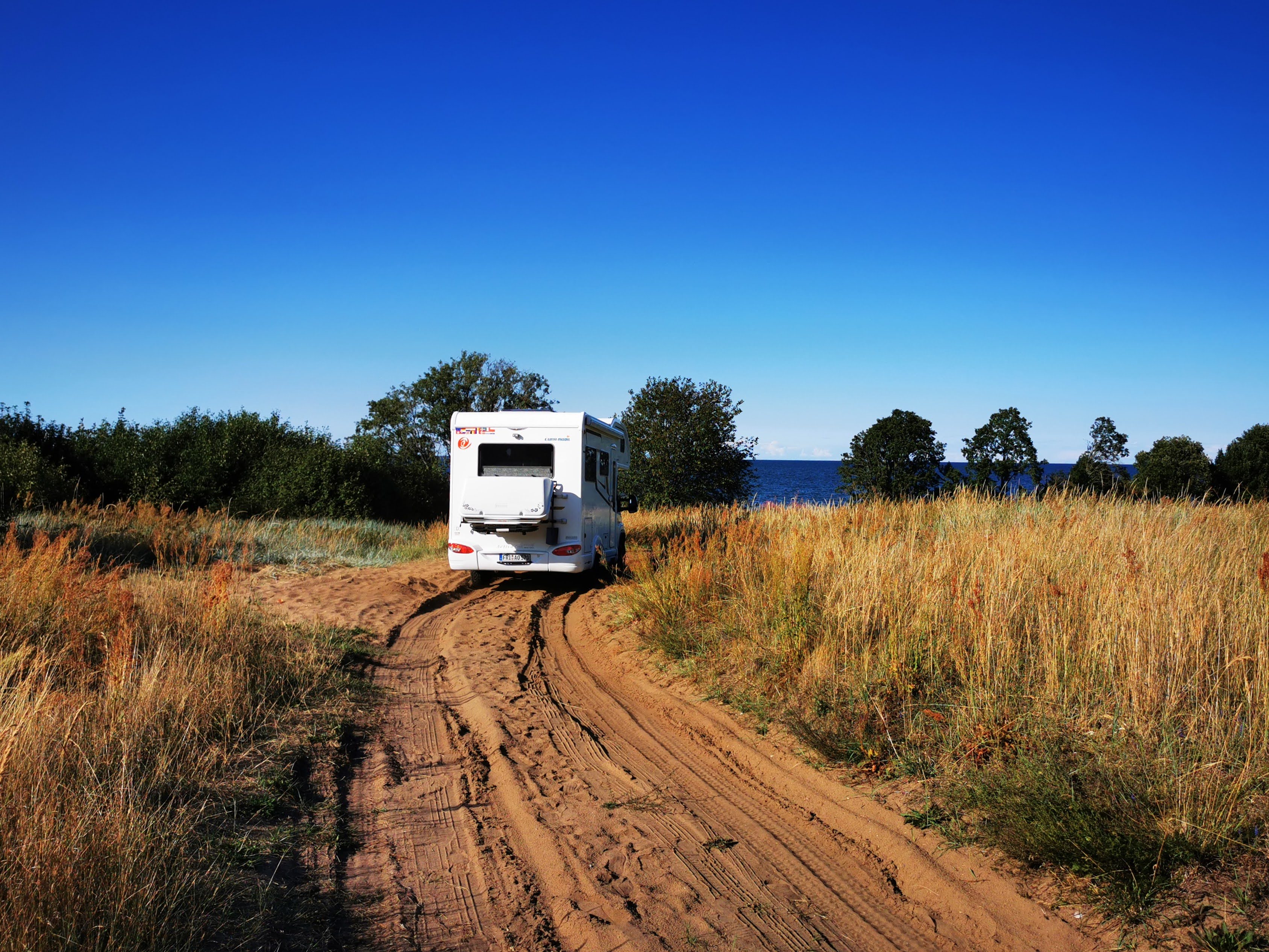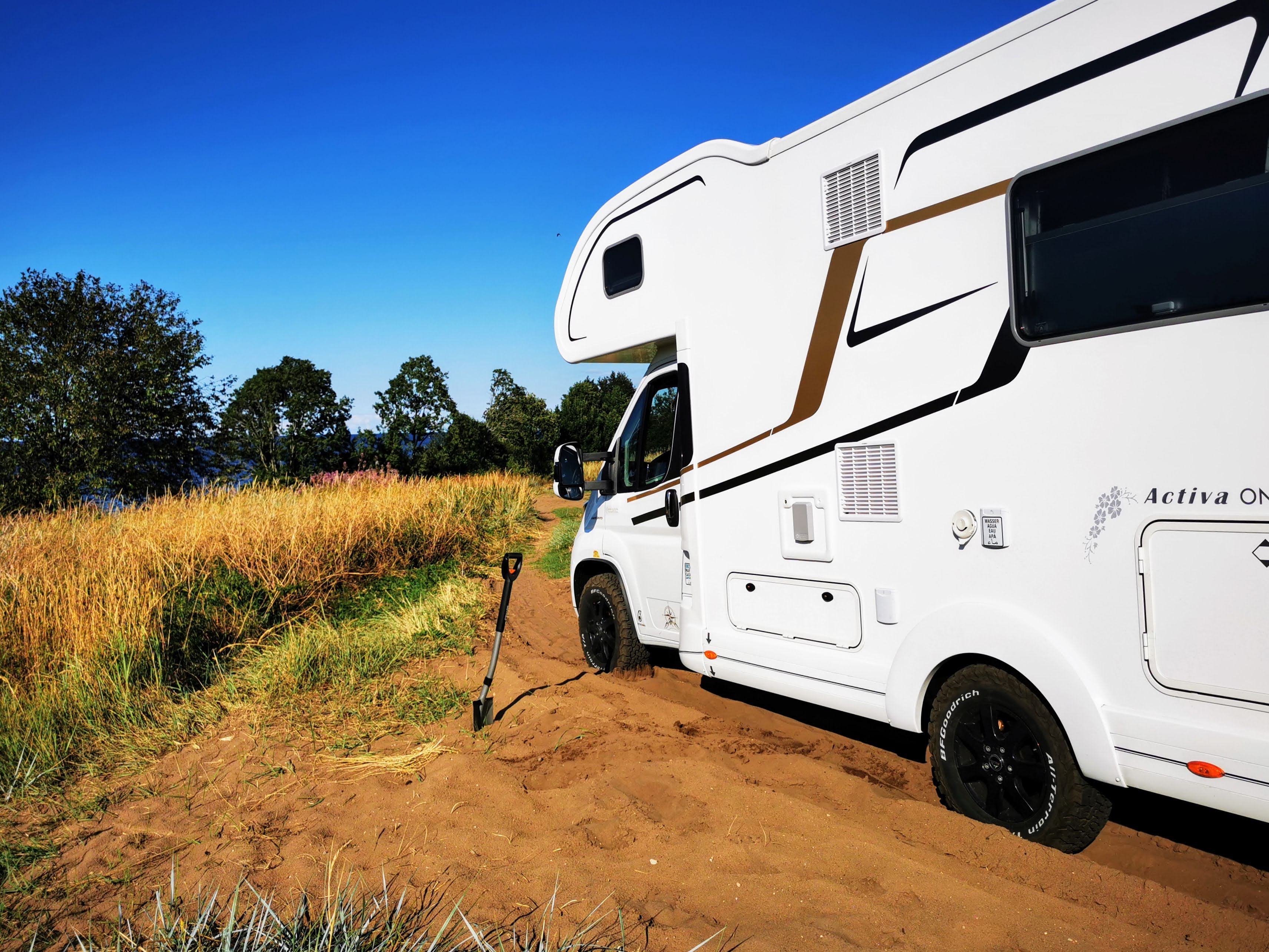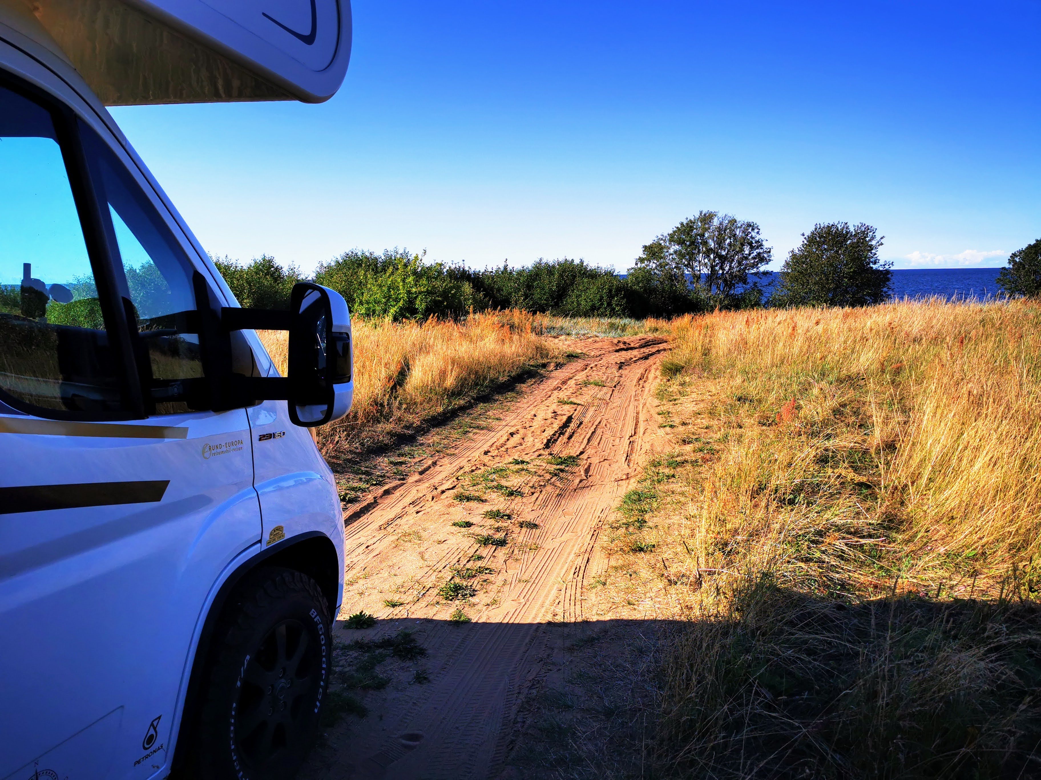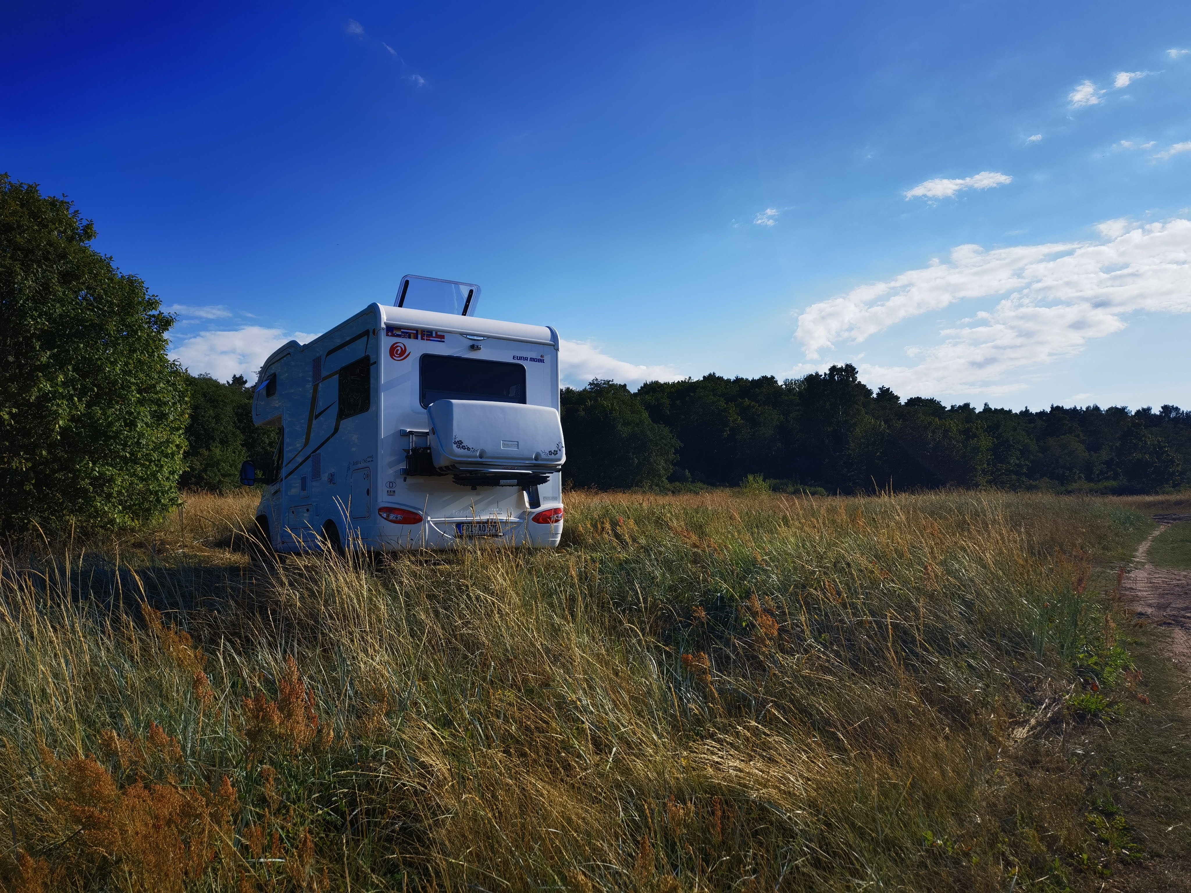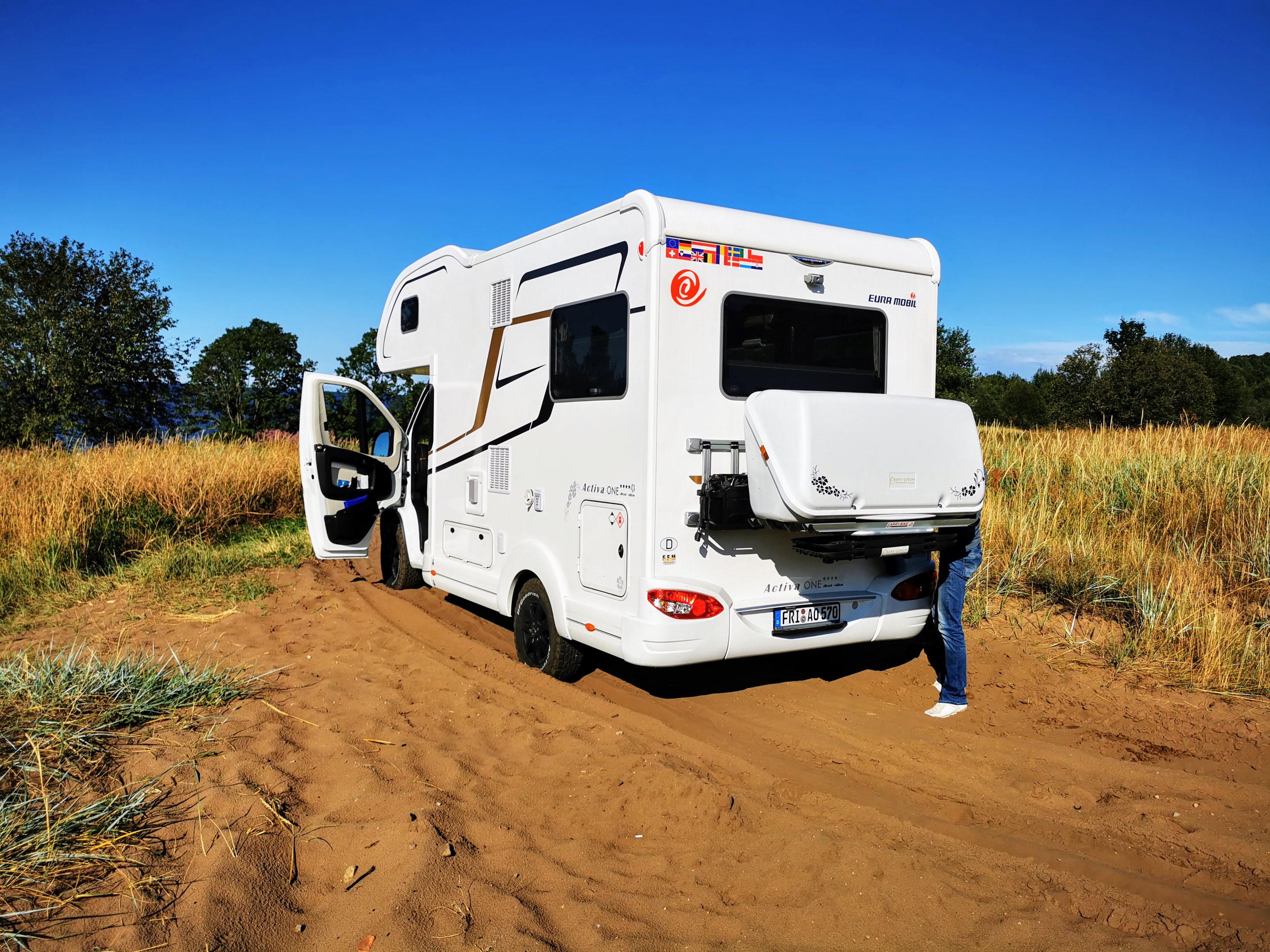 Wir gingen als ca. 15 Minuten durch die Gegend und fanden tatsächlich einen Spot. Kathleen wollte mit Cindy zu Fuß dorthin, ich holte das Reisemobil. Eine sandige Kurve galt es zu meistern, die einzig wirklich schwer einzuschätzende Stelle. Lasse ich Druck aus den Reifen? Oder nehme ich einfach genug Fahrt auf und versuche, da so durchzubrackern… Ich entschloss mich für die zweite Variante und scheiterte…