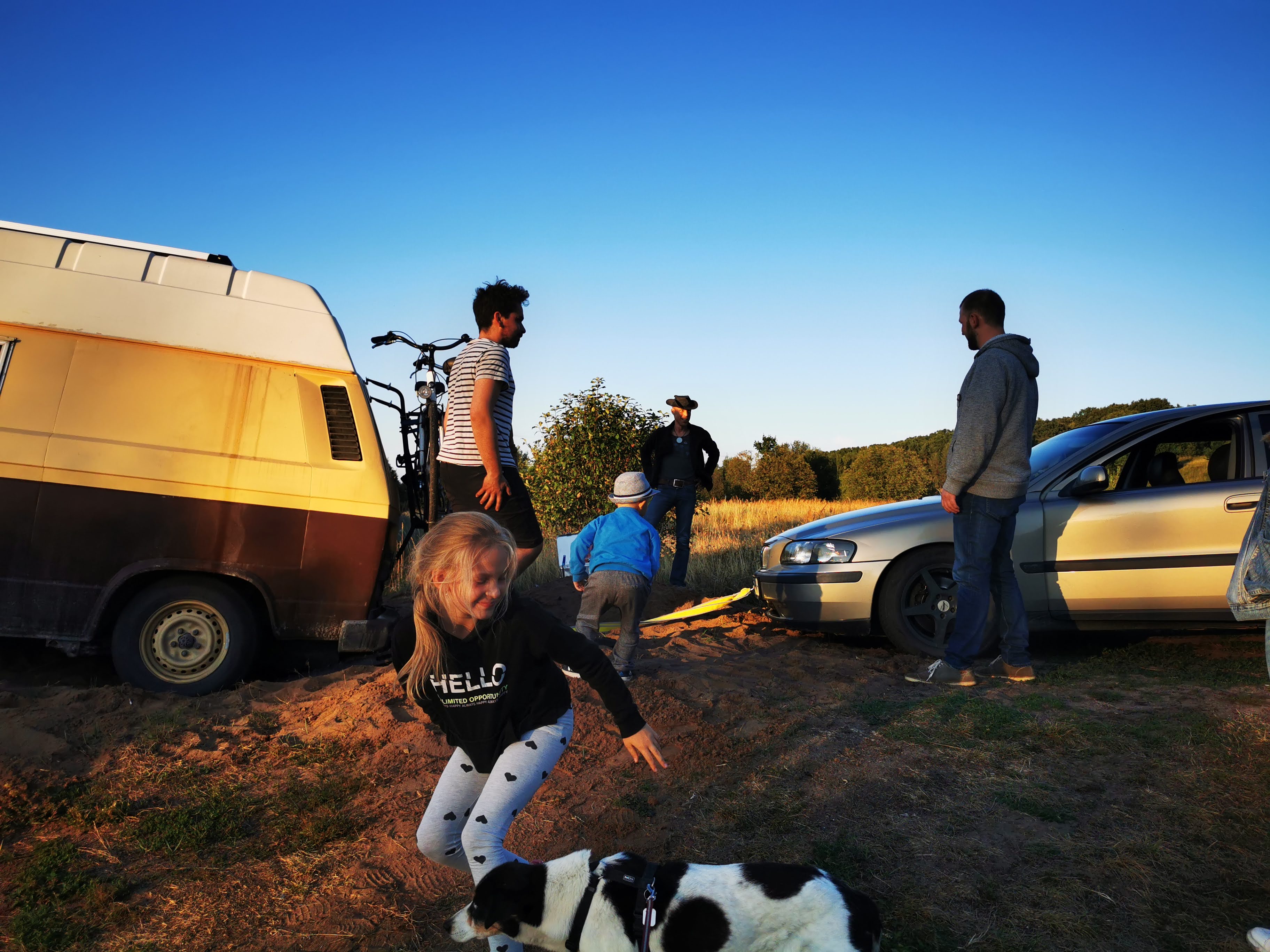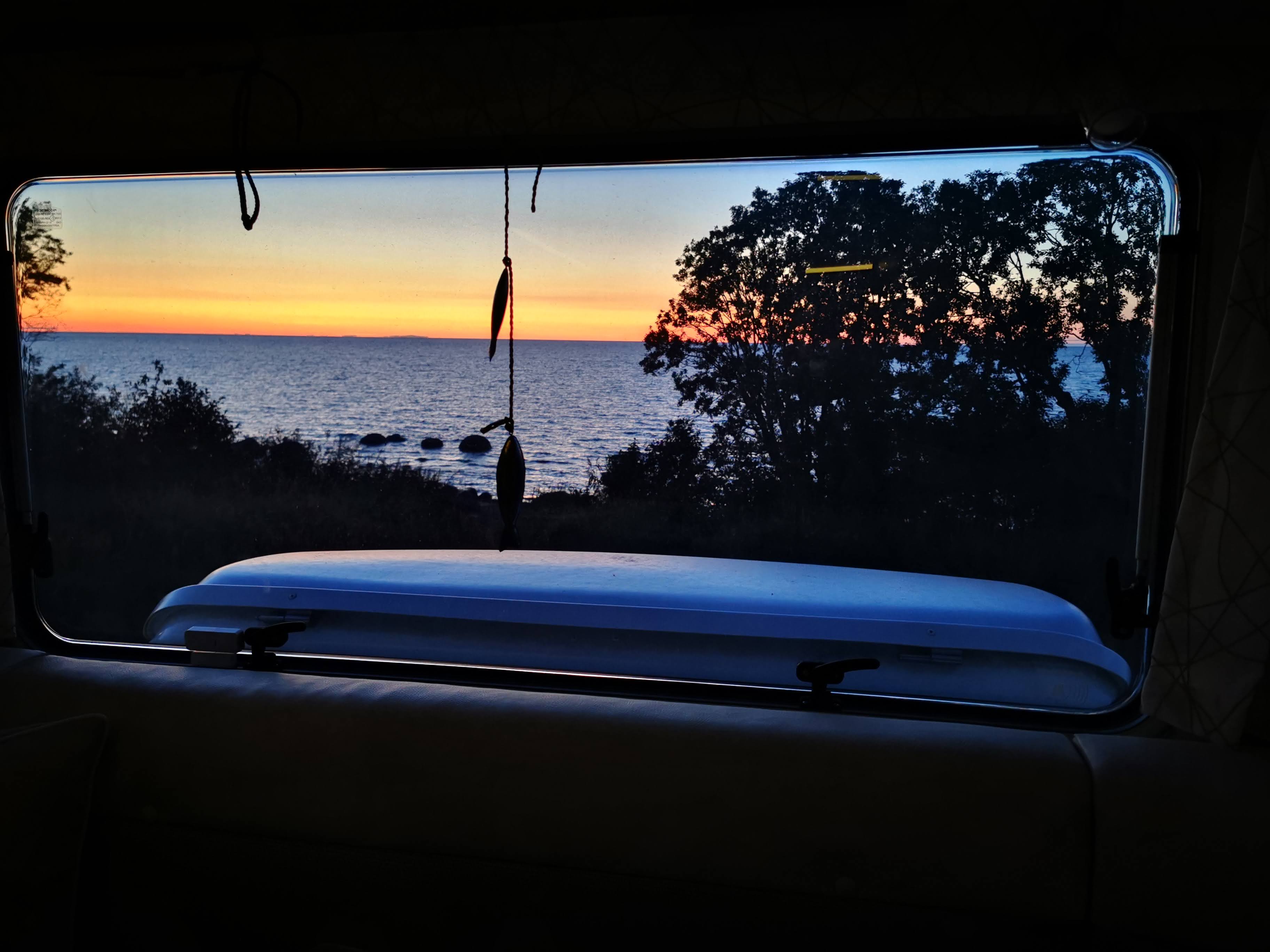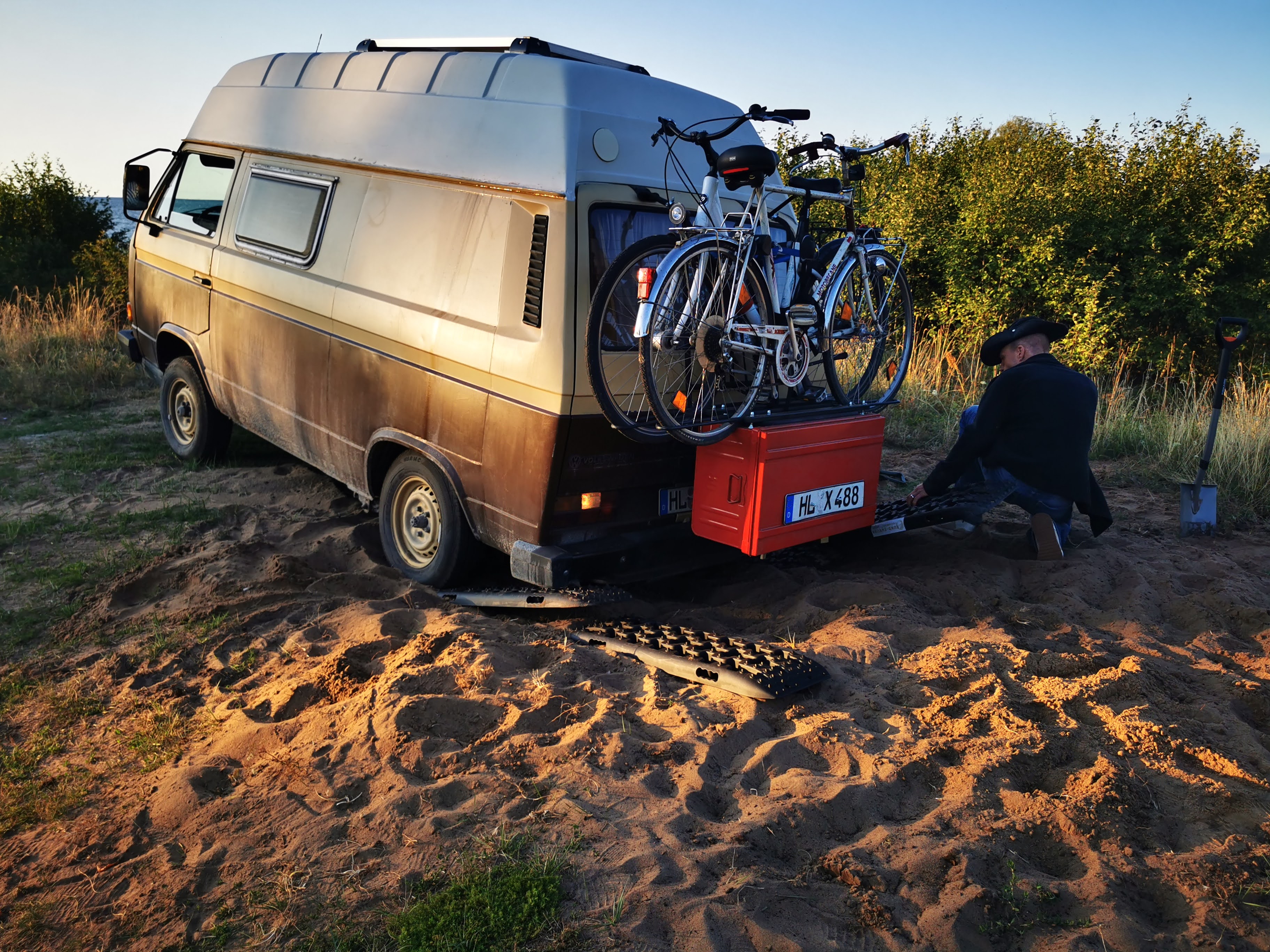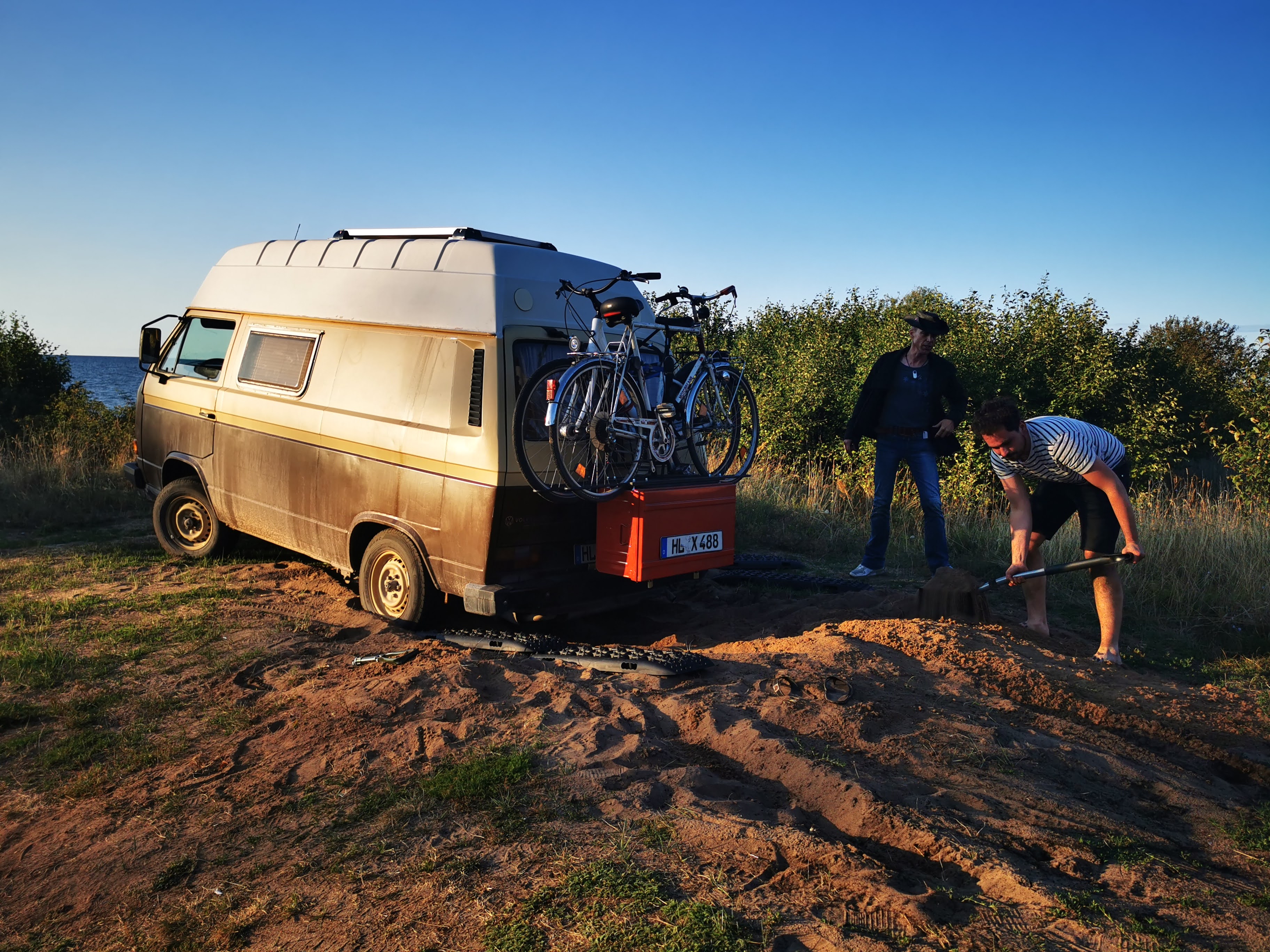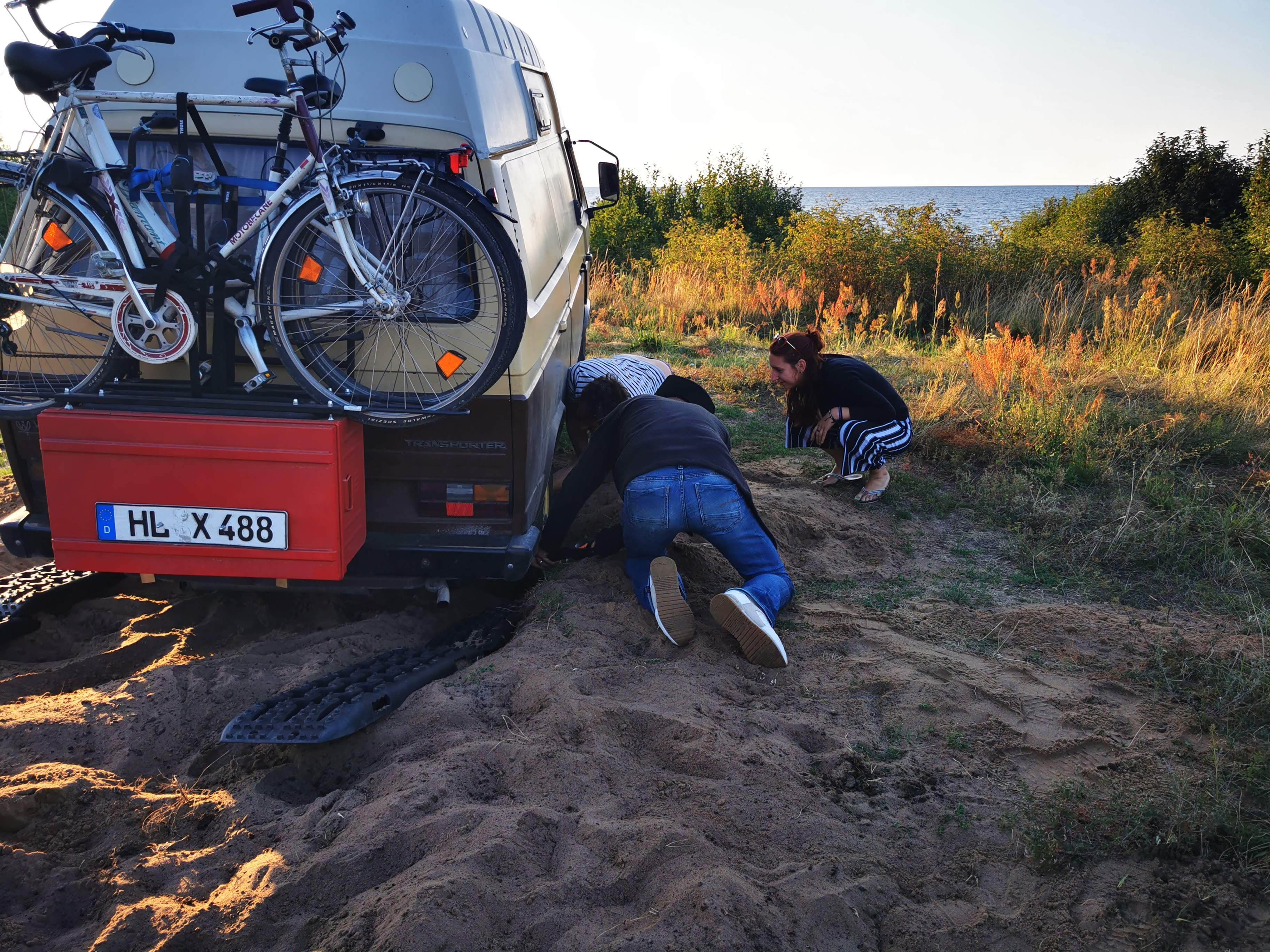 Als wir im Heck saßen und so aufs Wasser schauten, hörten wir von weitem schon, dass ein VW Transporter in unsere Nähe fuhr. Es war ein älterer T3 und die beiden Besatzungsmitglieder suchten – ähnlich wie wir vor ca. einer Stunde – einen guten Platz. In 100m Entfernung fuhr der Bulli immer näher an den Strand. Wir hörten den Motor ein paar mal aufheulen, aber Bewegung war dann keine mehr zu sehen. Die haben sich festgefahren…. Ich schaute aus dem Fenster und sah unsere Vermutung bestätigt.