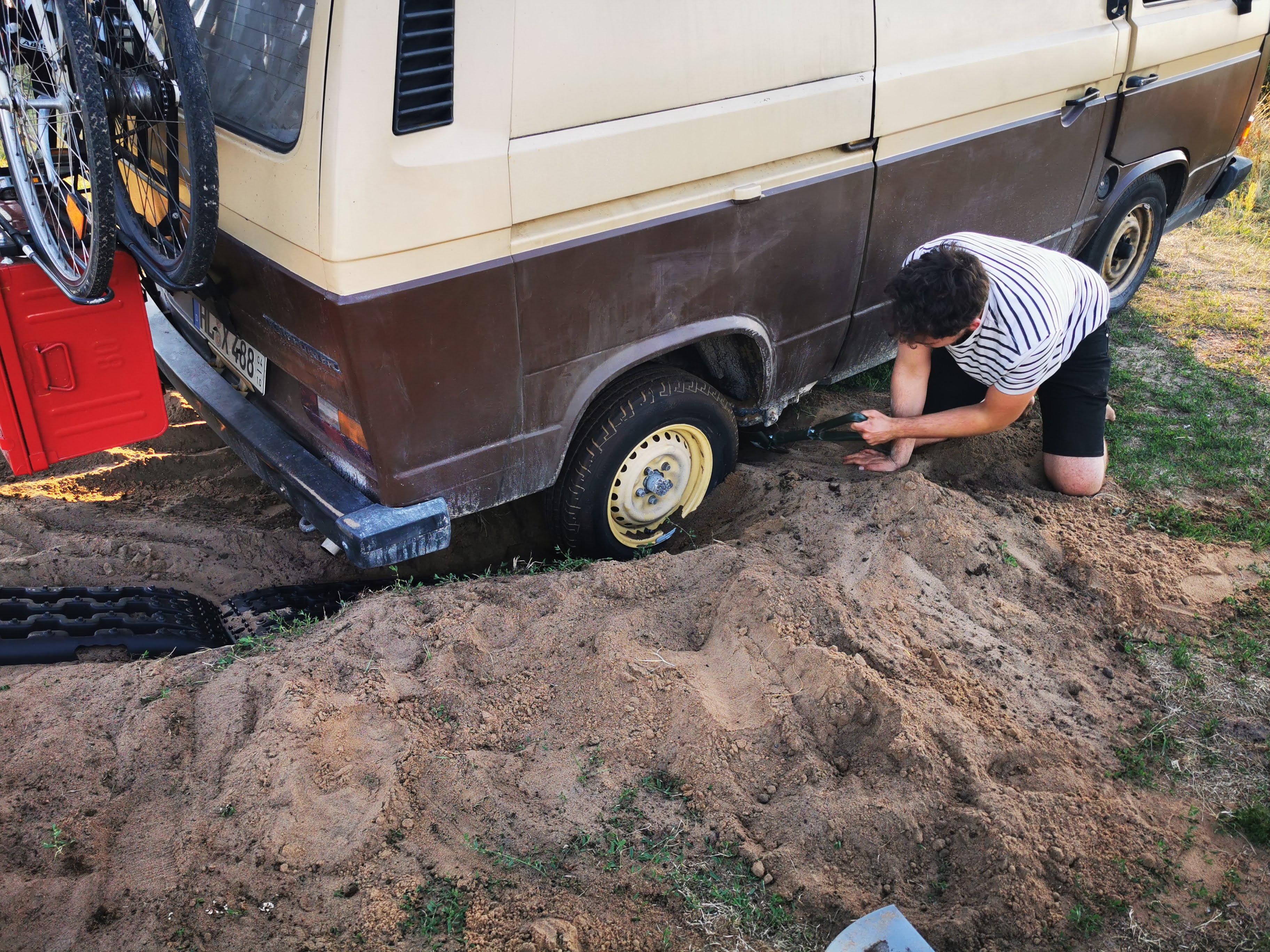 Der Versuch loszufahren klappte jedoch nicht, weil der Achssträger schon auf Sand auflag und die Reifen unsere Boards somit gar nicht zu fassen bekamen. Wir buddelten noch weiter und versuchten es ein zweites Mal. Fehlanzeige. Meine Idee war, dass wir unser Mobil holen und mit Abstand auf den „festen“ Boden stellen. Somit könnten wir unsere Winde benutzen, um den VW Camper dann zu ziehen. Die Winde würde das viel materialschonender machen, als wenn wir direkt mit einem Bergegurt ziehen würden.