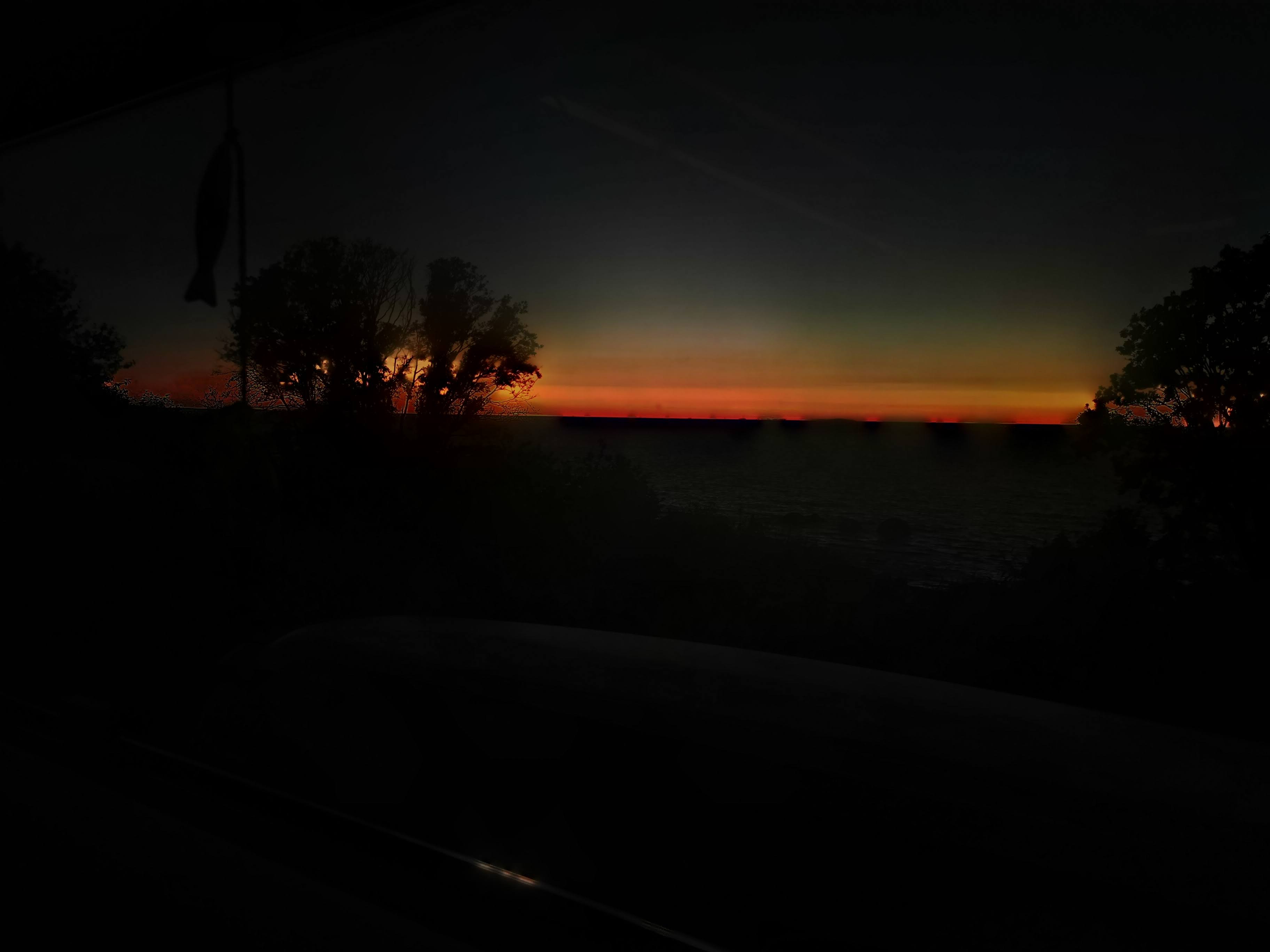 Der Sonnenuntergang war wirklich großartig und nachdem es auf dem Kies dann zu kalt wurde, gingen wir zurück zum Auto. Die VW-Besatzung bot uns noch eine aus der Heimat mitgebrachte Dose Jever an. Wir tranken zusammen noch ein Bier und gingen dann ins Mobil. Auch hier konnten wir noch eine halbe Stunde von unserem Panorama Wohnzimmer in einen traumhaften Abendhimmel schauen.