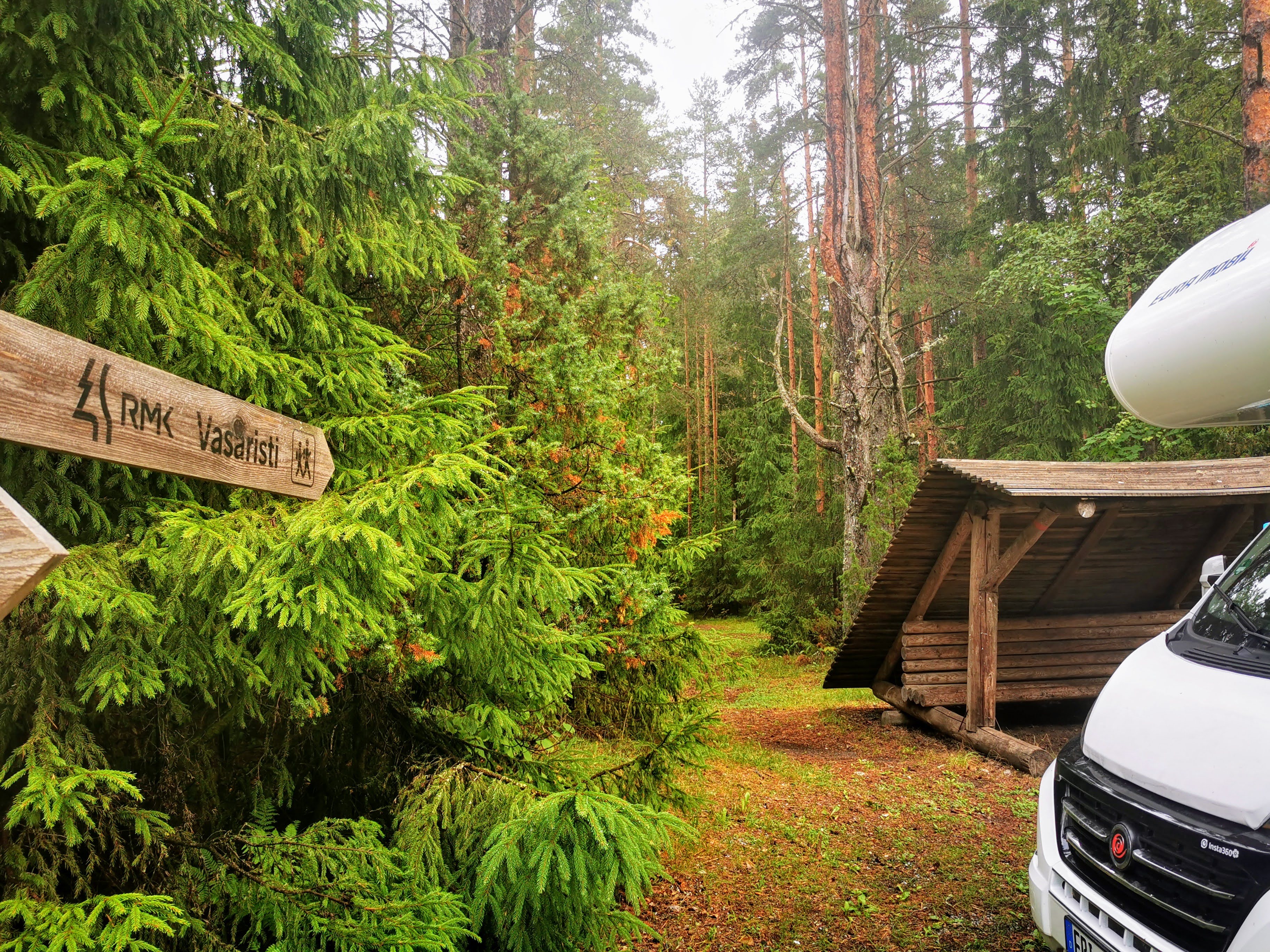 Gegen 1330 hatten wir dann noch einen kleinen Einkauf für die nächsten Tage getätigt und fuhren – nachdem wir noch schnell bei der besagten Tankstellen-Kette mit dem großen „K“ ver-/entsorgt hatten – unsere nächsten Stellplätze an. Sie lagen etwa 60 Kilometer vor Tallin. Also etwa eine Stunde gemütliche Fahrt. Wir hatten wieder mehrere Stellen herausgesucht, weil schon im Vorfeld klar war, dass sie wohl nicht so einfach anzufahren seien. Zumindest nicht mit einem 4×2 Alkovenmobil. Tief hängende dicke Äste und steile sandige Fahrtwege hatten so manchem Vorgänger wohl den Spaß und einem fast sogar das gesamte Mobil genommen.