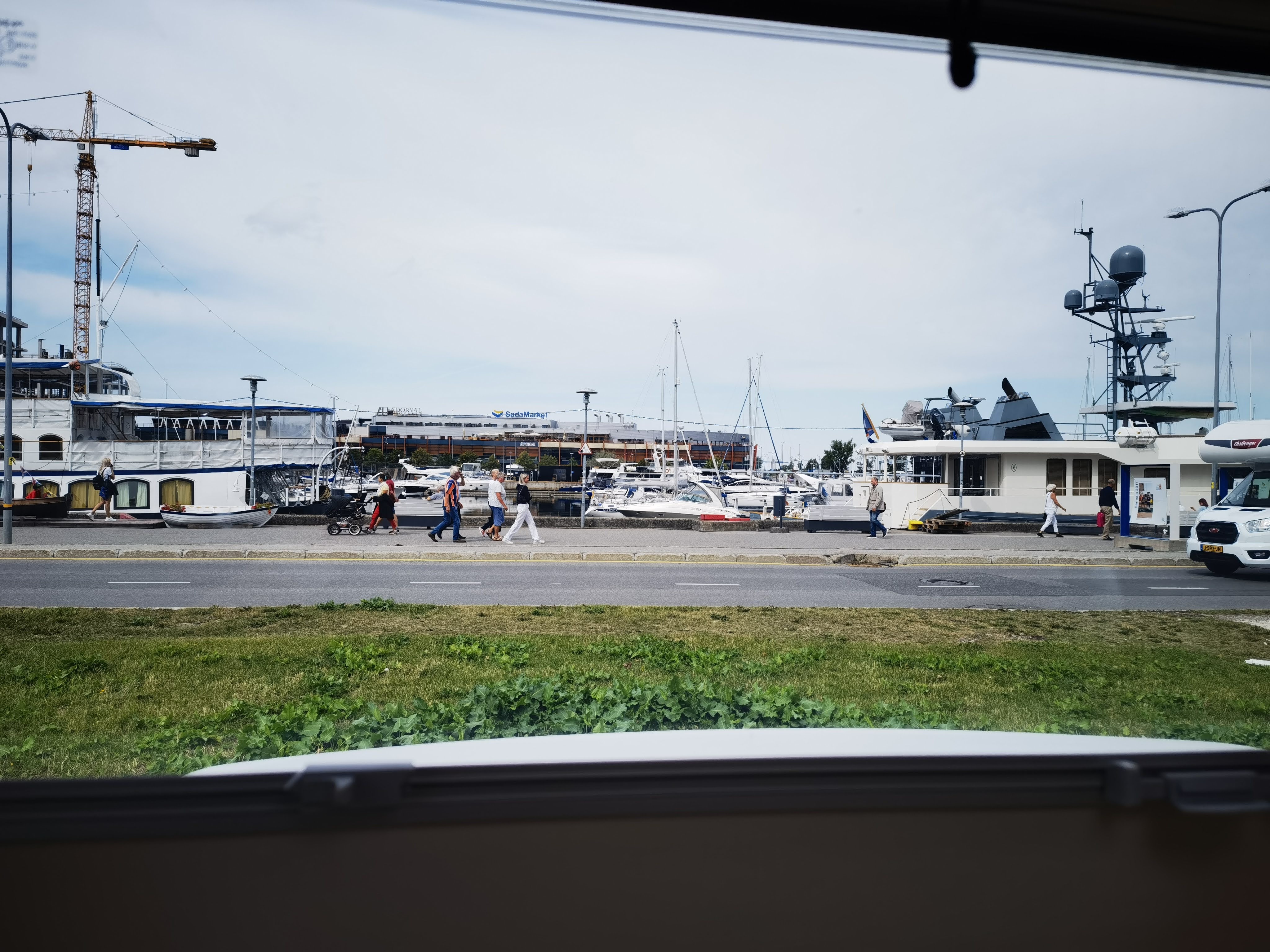 Die Einfahrt in die Stadt war – obwohl es die Hauptstadt ist – entspannt, aber bald wurde unsere vorgeschlagene Route abrupt beendet. In Tallin war am Sonntag irgendein Sportereignis – wir vermuten einen Lauf, oder Marathon. Es waren also viele Straßen rund um das Zentrum gesperrt, oder zu Einbahnstraßen umgebaut. Mehrfach umkreisten wir unseren ersten Parkplatz, der aus der „Ferne“ schon ganz gut aussah. Nach ein paar Anläufen fanden wir eine Möglichkeit zwischen den Absperrungen und Umleitungen die Zufahrt zum Parkplatz anzufahren. Guter Platz: Im hinteren Bereich (ruhiger, da fast an der Hafenkante) noch viele Plätze frei, Kameraüberwachung und 4€ Gebühren für 24 Stunden.