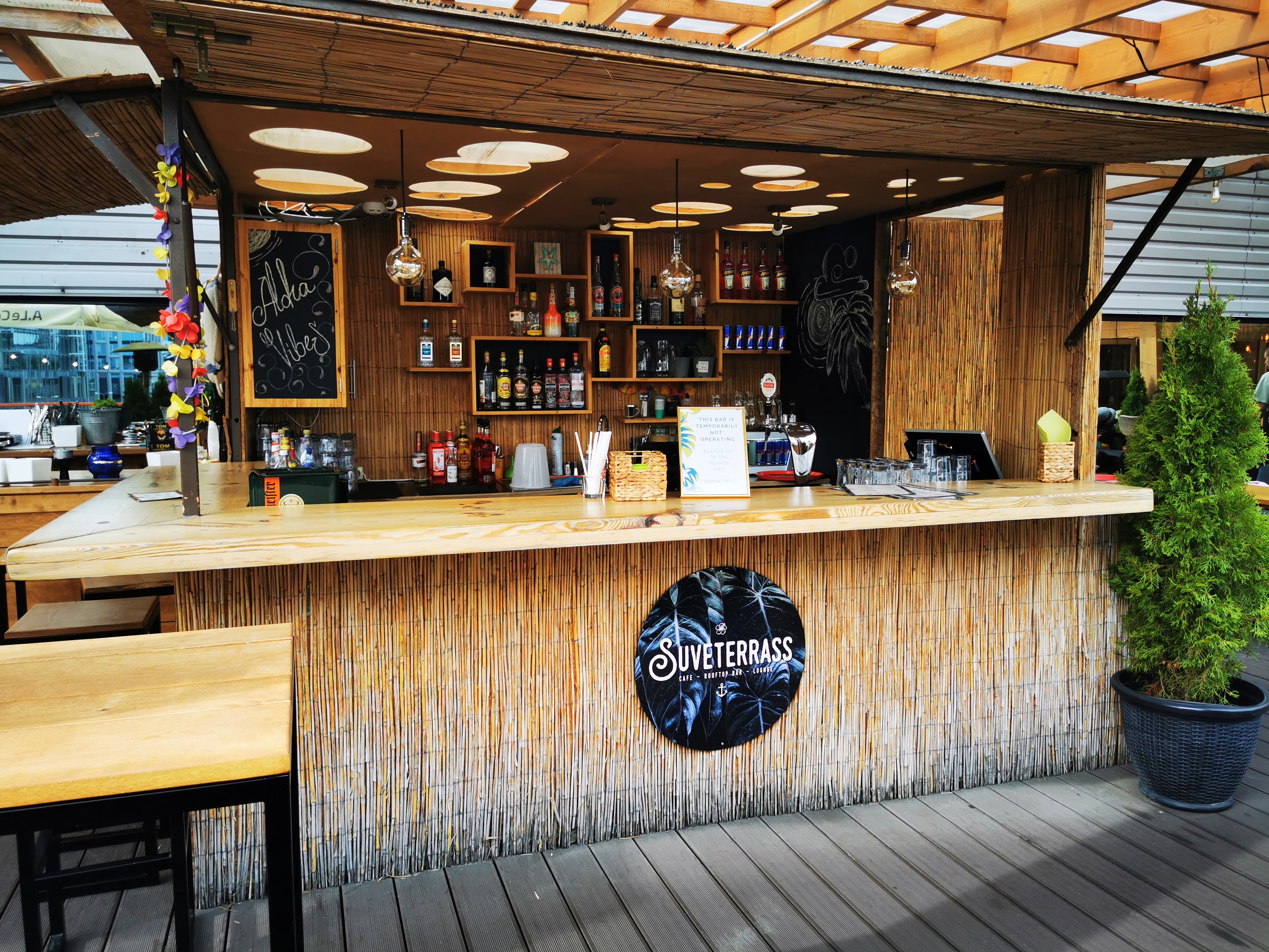 Während ich die Maschine drehen ließ, suchte Kate noch eine Überraschung für mich raus. Sie hatte beim Befahren des Parkplatzes gesehen, dass es im gegenüberliegenden Kreuzfahrtterminal-Hafen eine Sommerdachterasse „Suveterass“ gab und fand heraus, dass sie eine Weinkarte vorhielten.
