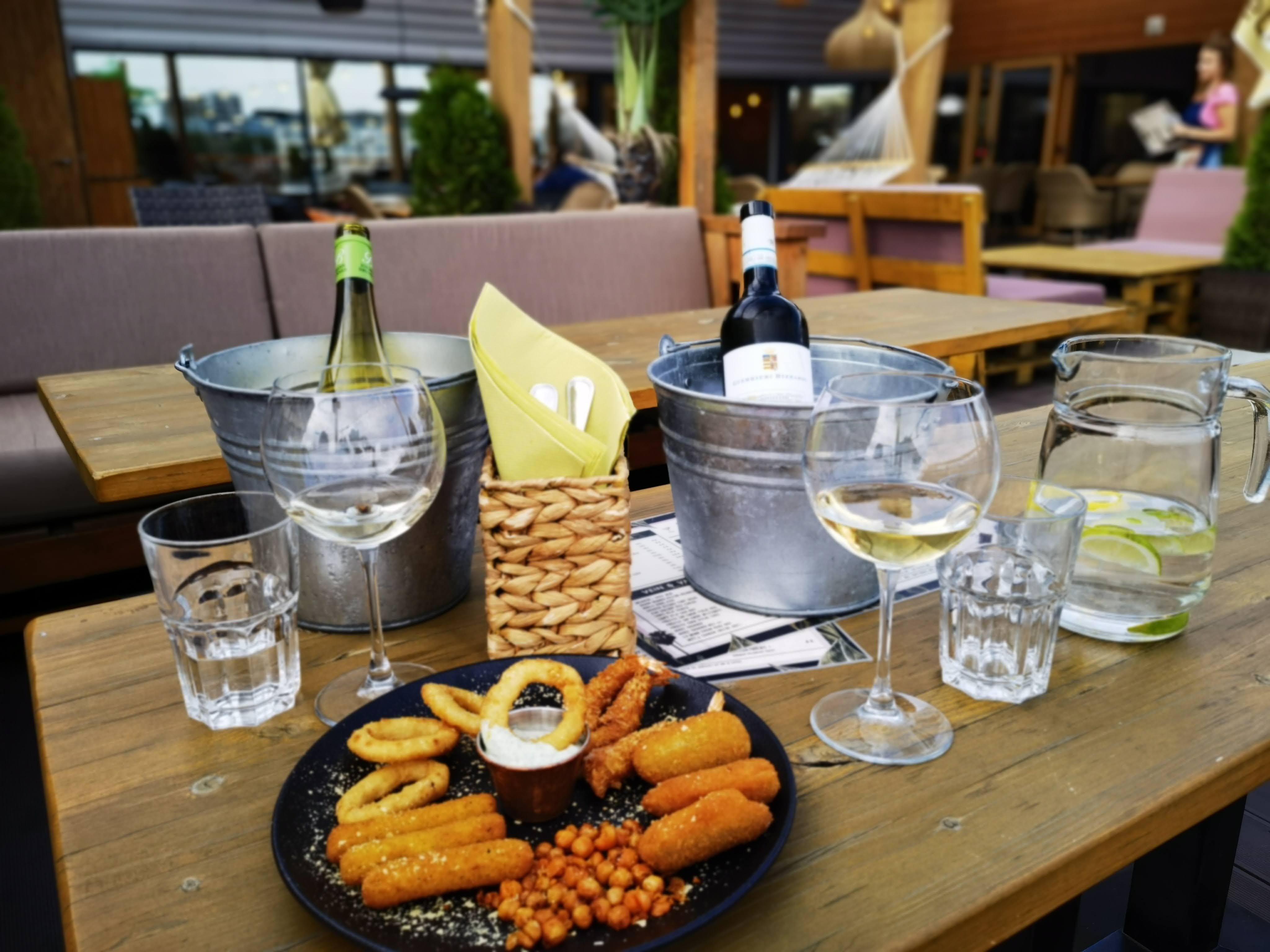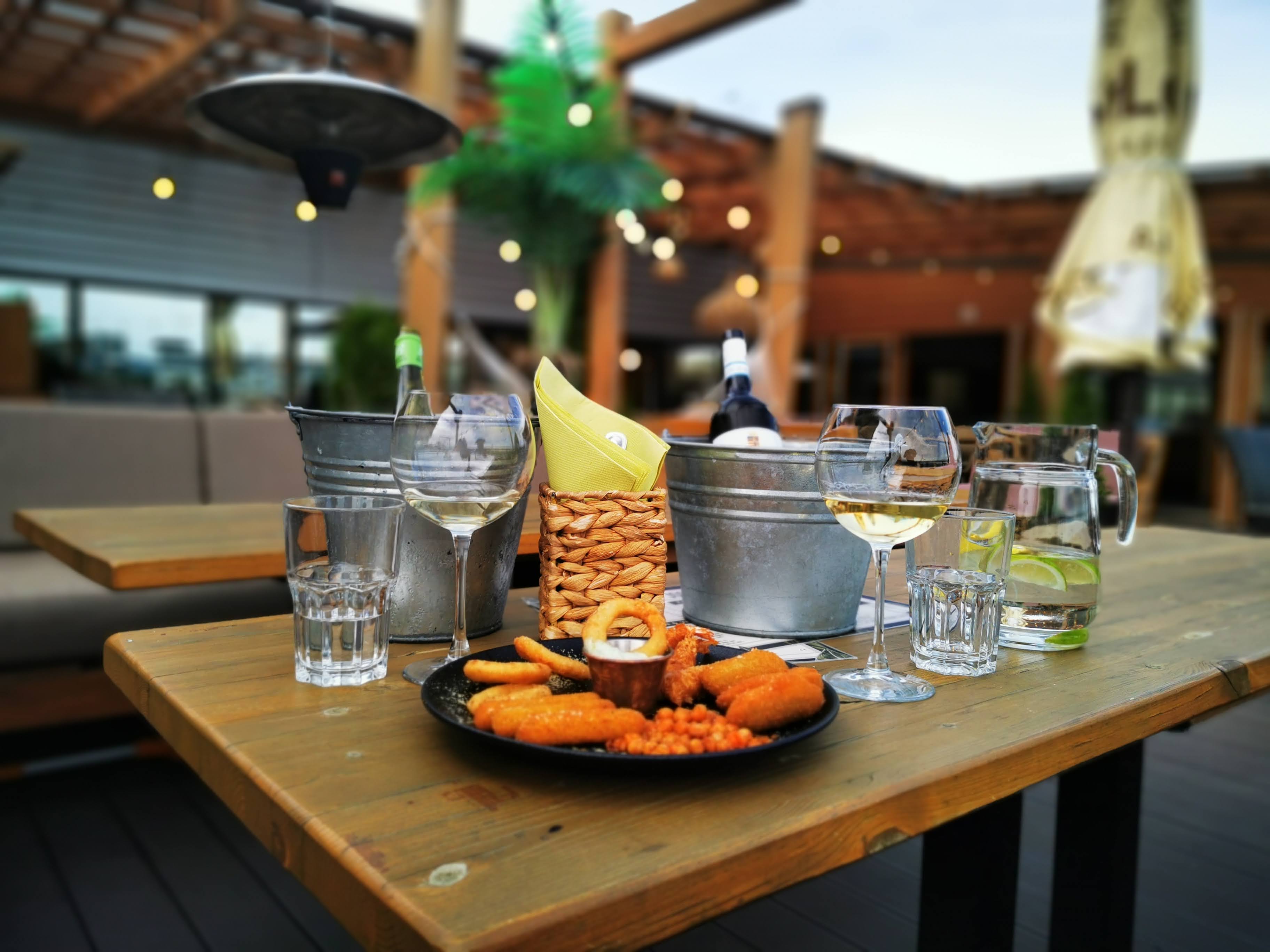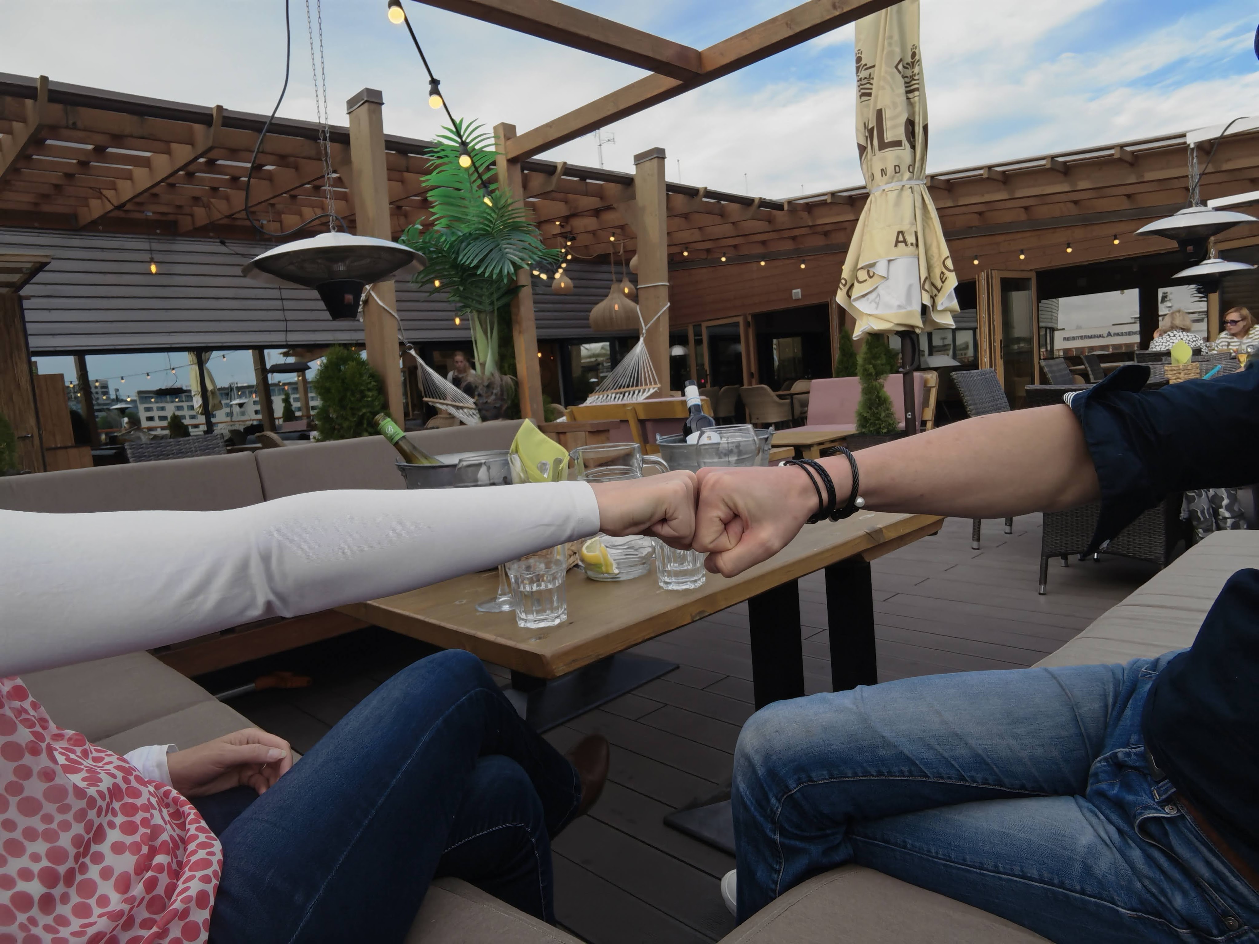 Der Dachterassenbereich war gegen ca. 17Uhr noch fast ohne Gäste und wir suchten uns eine tolle Sitzgruppe aus. Kate bestellte sich eine Flasche halbtrockenen Riesling und ich eine Flasche trockenen Pinot Grigio. So ließen wir es uns gut gehen, schauten zu unserem Reisemobil auf dem Parkplatz rüber und freuten uns, dass wir noch nicht einmal die Hälfte unserer Reise rum und schon so viel tolle Dinge erlebt hatten. Wir informierten uns auf vistittallin.ee über die morgen zu besuchenden Sehenswürdigkeiten und bestellten uns noch eine „warm snack platter“ mit einer Variation an Fingerfood.
