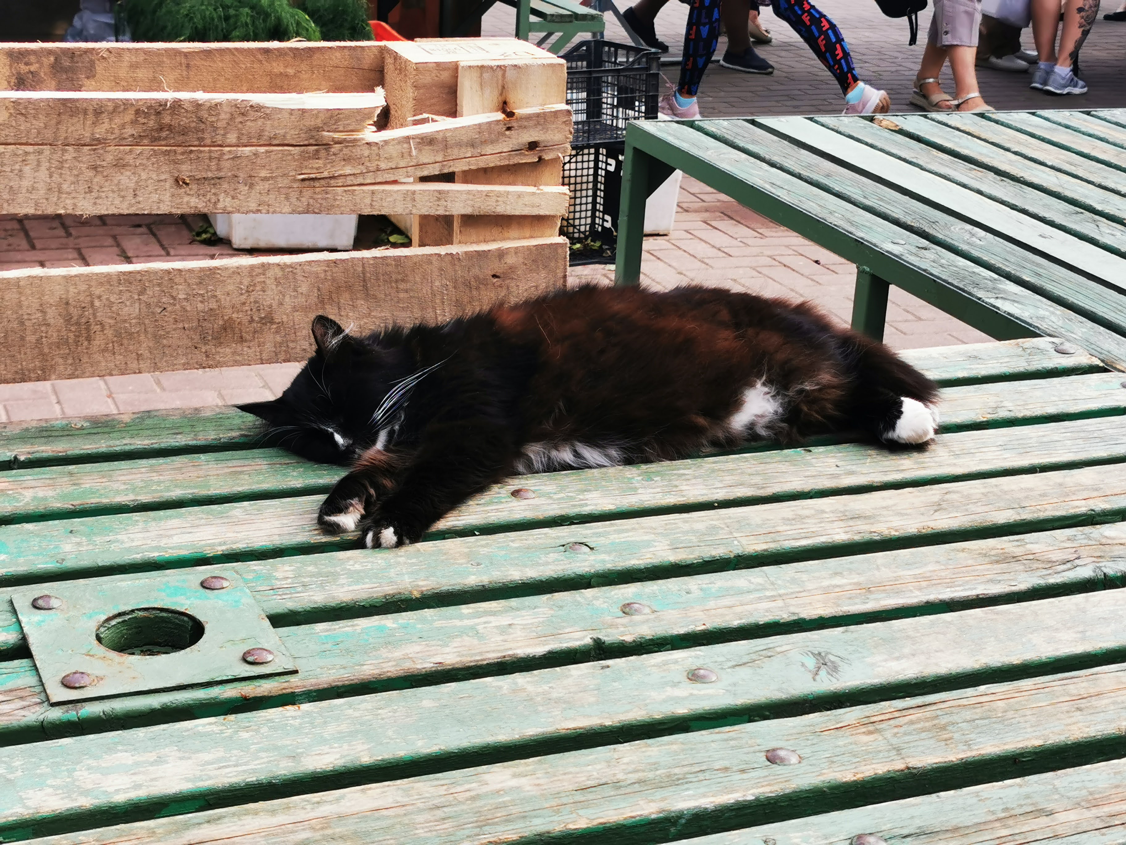 In den Hallen haben wir nur mit der kleinen „Insta Go Kamera“ gefilmt und nicht fotografiert, weil es im Innenbereich eigentlich verboten ist, Bild- und Tonaufnahmen zu machen. Die Katze ist – haben wir gecheckt – nicht tot, sondern schläft in Mitten des Trubels auf einem leeren Markttisch.