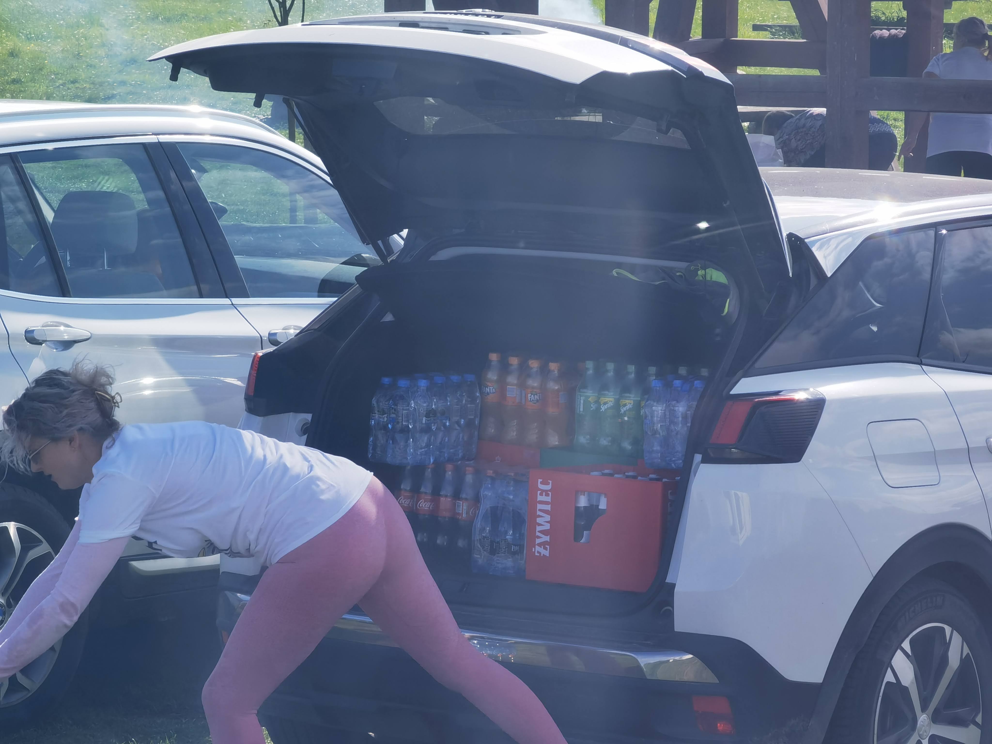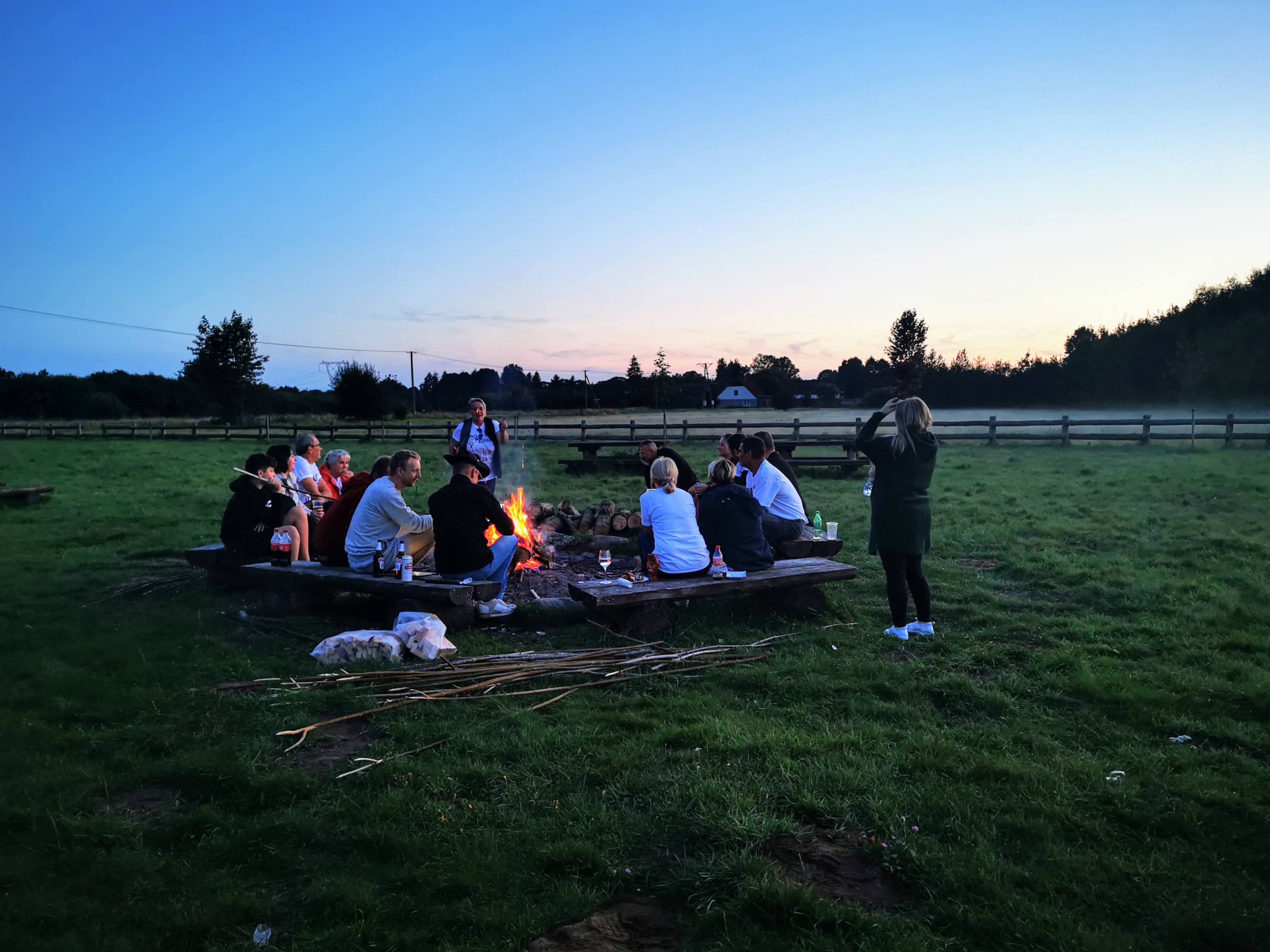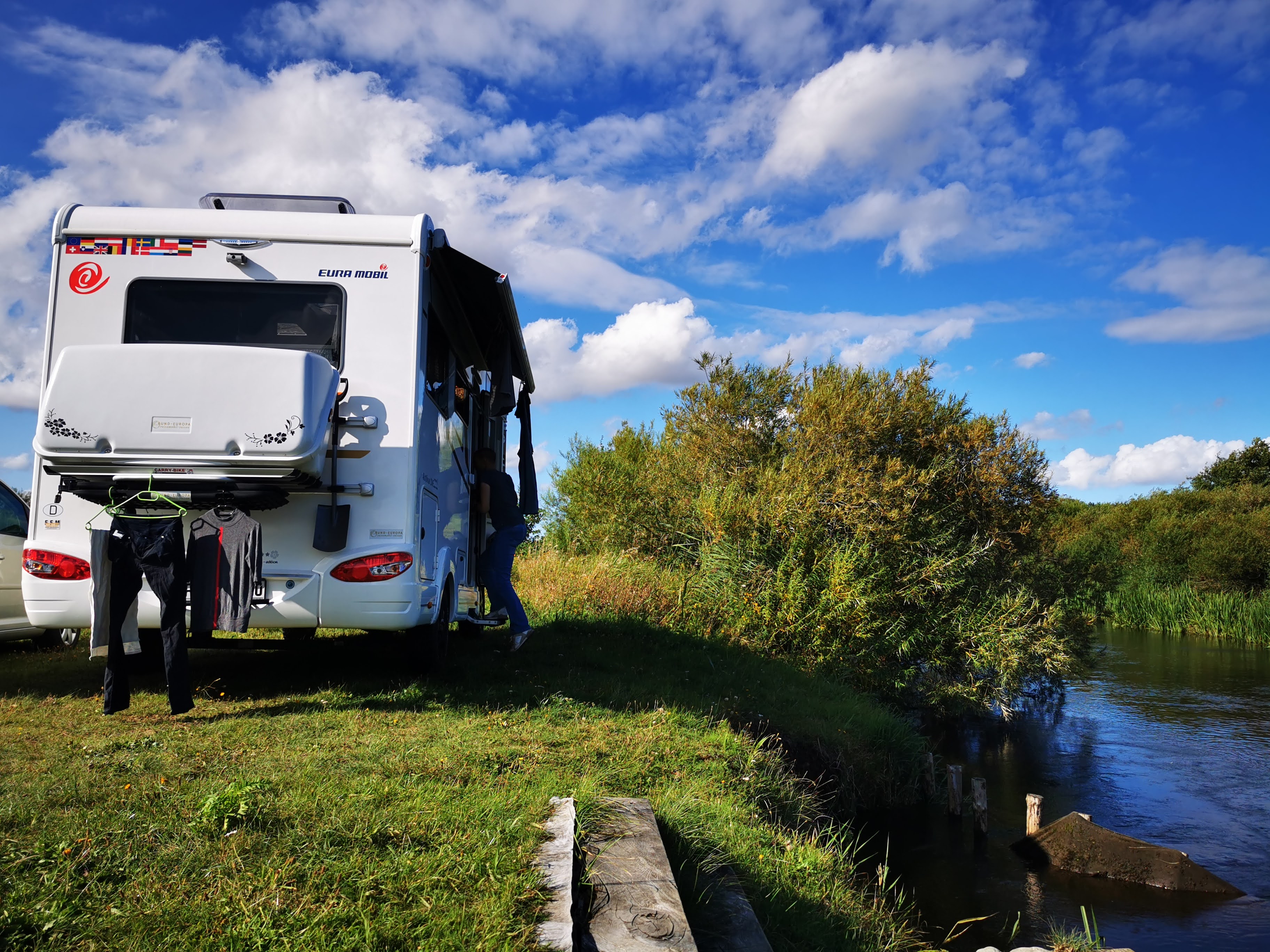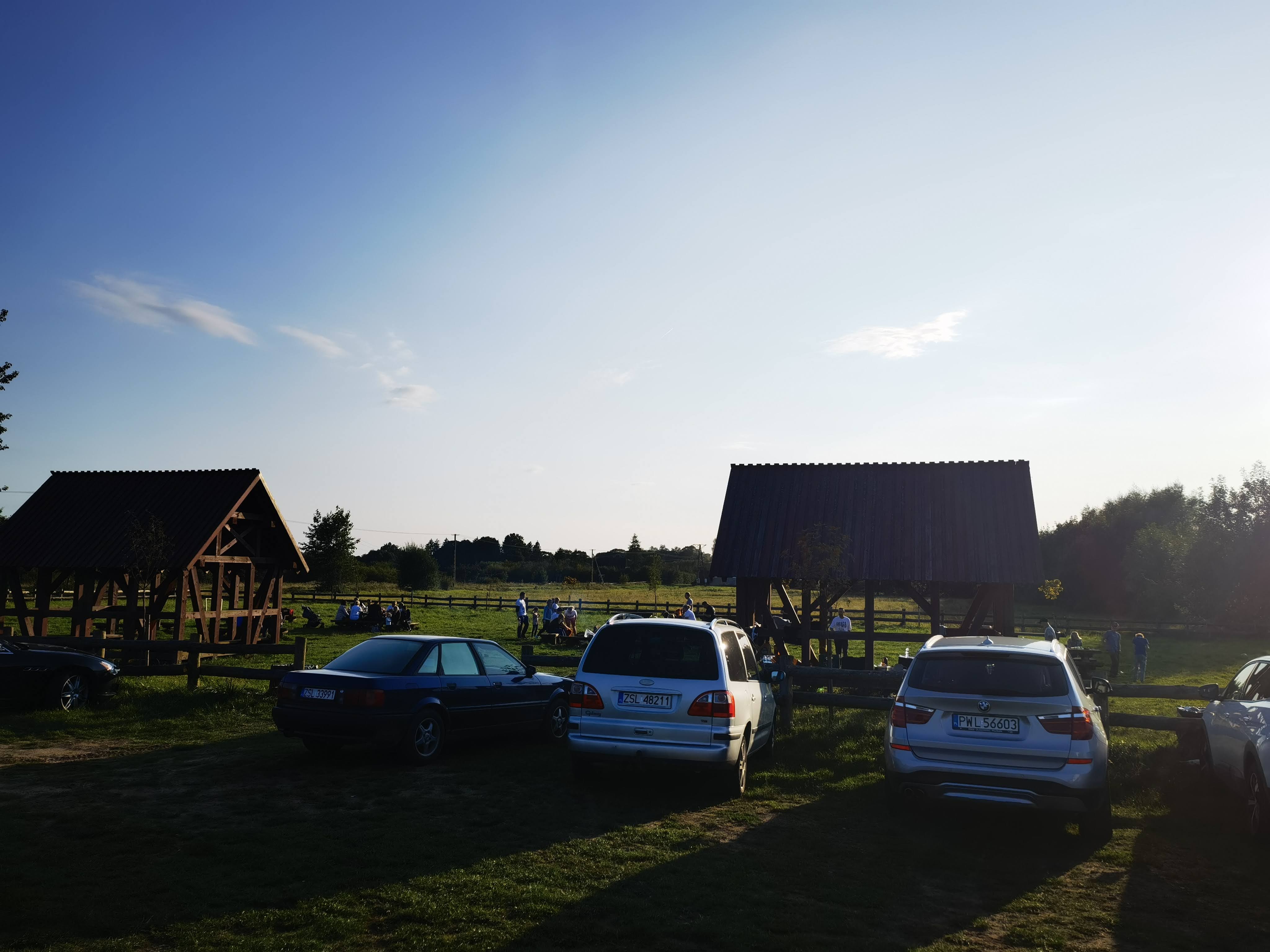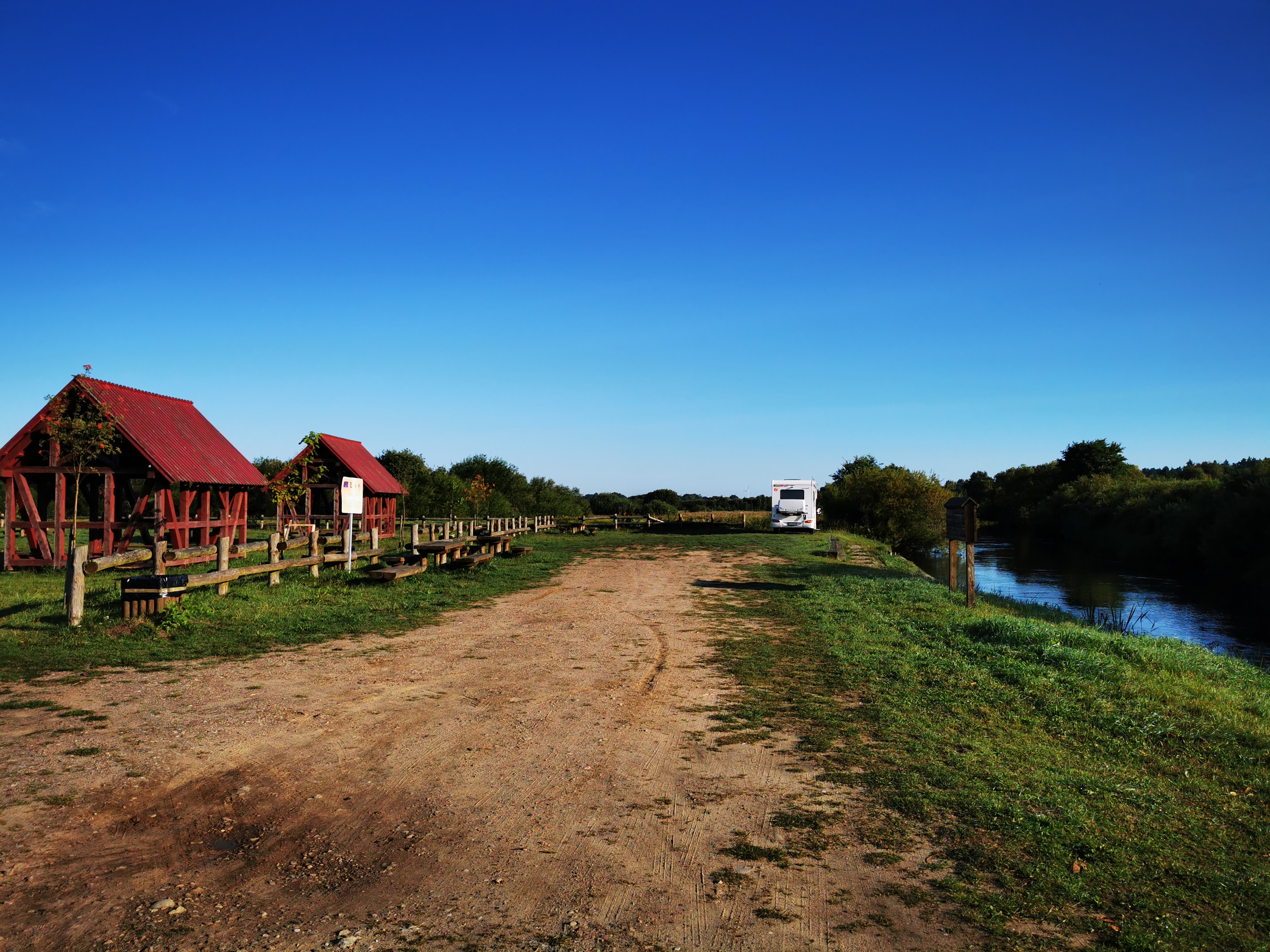 Unser Stellplatz sollte ein Picknickplatz an einem kleinen Flüsschen sein und wir verließen die gut ausgebaute „6“ um die obligatorischen 5-6 Kilometer Holperpiste zu fahren. Der Parkplatz in der Nähe der Ortschaft Nosalin, etwas hinter Slubsk war gut besucht, aber wir drängten uns ganz an den Rand am Wasser, so dass wir nicht allzu viel Parkraum für Einheimische wegnehmen würden. Nachdem wir uns ein wenig umgesehen hatten, stellten wir fest, dass auf dem Picknickplatz irgendwie eine Art Feier oder Geburtstag vorbereitet wurde. Es kamen immer mehr Autos mit Getränken, angespitzten Stöckern (wofür auch immer) und zwei Männer bauten zwei kleine Holztore auf. Zwei Frauen machten einen Grill und einen Smoker an.
