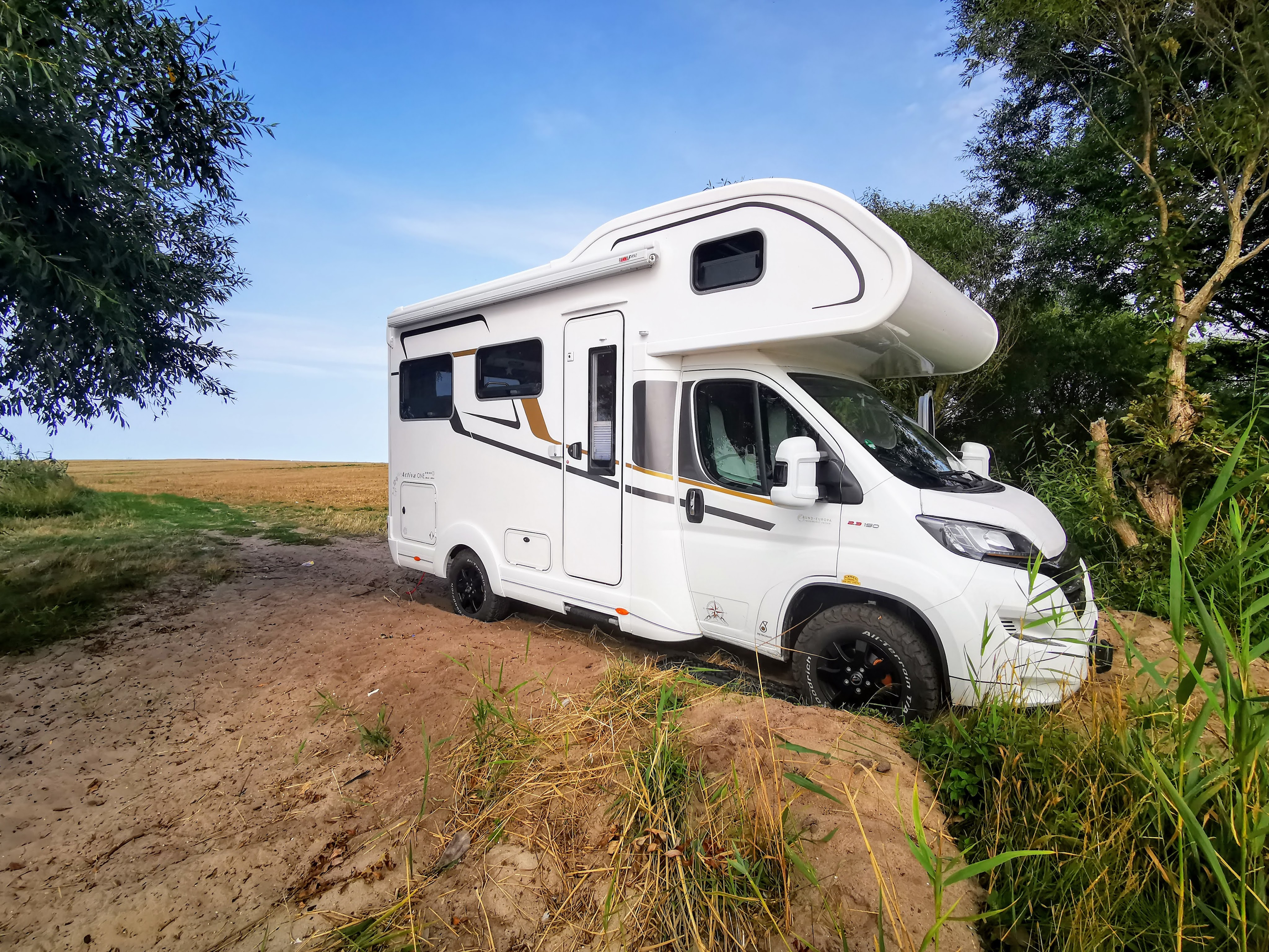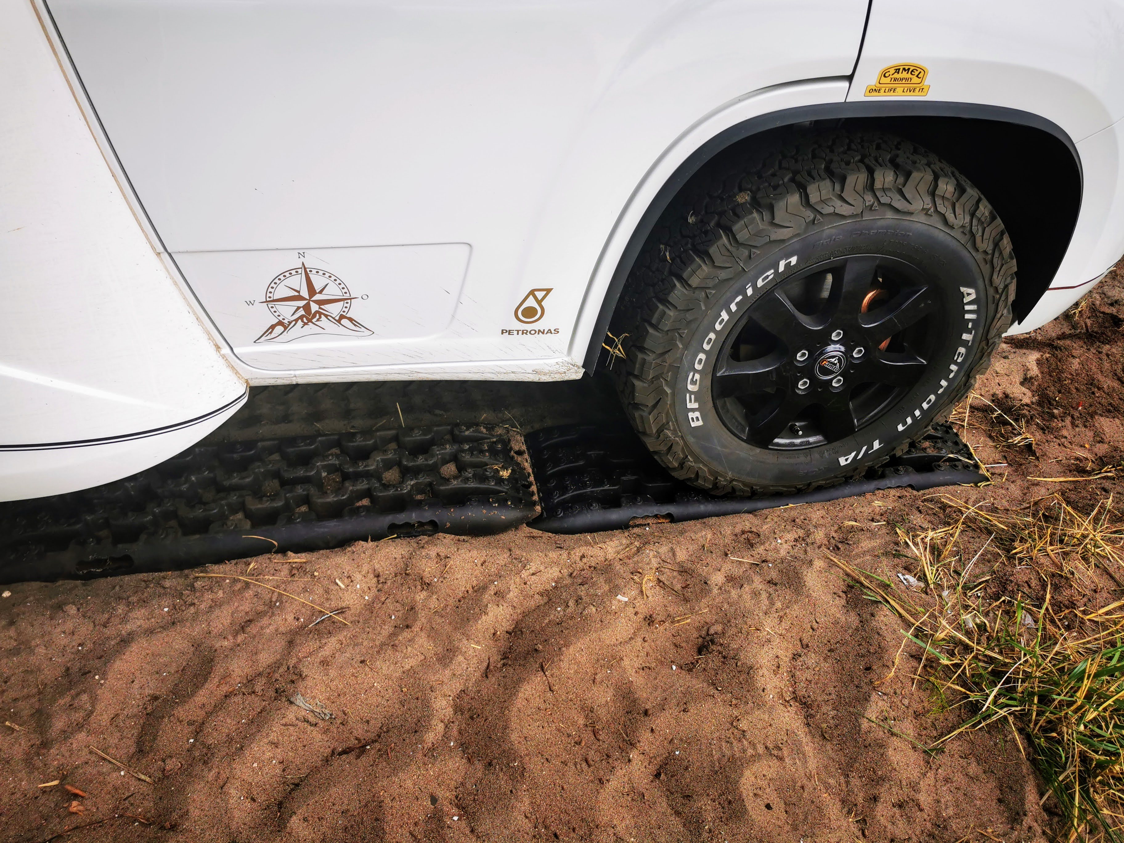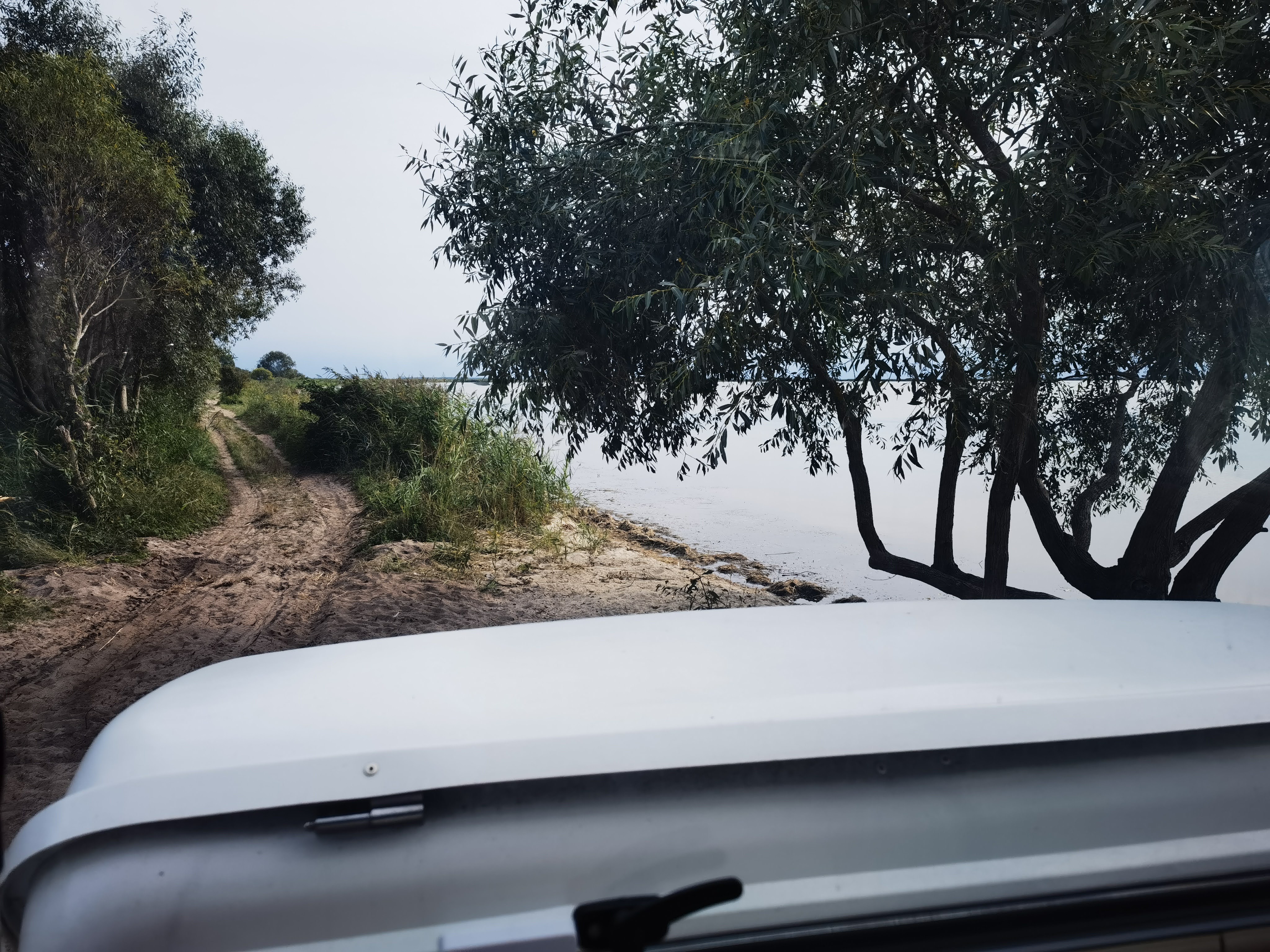Also ging es weiter…Die S3 ist aber noch sehr neu und unsere Navis hatten sie noch nicht auf dem Schirm. Selbst Google und Petal Maps hatten Schwierigkeiten. So irrten wir durch Kreisverkehre, kleine Ortschaften und Unterführungen und kamen schon genervt beim ersten Platz an. Sah nett aus, aber wir hätten es drehen und wenden können, wie wir wollten – gerade stehen könnten wir hier nicht. Also Fehlanzeige. Zweiter Anlauf – hieß: einmal um den See. Die Beschreibung ließ die Hoffnung schon ein wenig schwinden. Sehr sandige Anfahrt. Wir kamen an und hätten vorne auf einem Parkplatz stehen können, aber an den Sandstrand käme man wirklich nur durch losen Sand. Wir gingen also zu Fuß zum Wasser, um die Lage zu erkunden. Das trauten wir uns nicht…. Hier war eine Art Strandbad, es saßen Leute auf Decken, im Sand spielten Kinder, etliche Schwimmer waren zu sehen…. Es gab hier zwar einen Weg, den ich mich getraut hätte anzufahren, aber wie sähe dass denn aus, wenn wir in dieser Kulisse auf einmal mit unserem Reisemobil auftauchten…Also Fehlanzeige. Die nächste Option war ein Platz am Stettiner Haff, den wir eigentlich erst morgen anfahren wollten. Aber nun war es auch egal, es war fast 16 Uhr und nur noch 45 Kilometer bis zum dem Spot. Auch hier sollte es eine spanndende Anfahrt durch sandige Pisten sein…So fuhren wir wieder auf die S3 um weiter in Richtung Norden zu fahren. Nach einer zwanzig minütigen Fahrt fuhren wir ab und bogen in ein verlassenes Industriegelände ein. Nach ein paar Metern kam eine Betonplattenstraße und es wurde wirklich eng… Waren wir hier richtig? Was wäre, wenn mir hier einer entgegen kommt? Klar war, die letzten 3 Kilometer gab es keine Möglichkeit, das Auto zu wenden. Das bedeutet, wenn hier gleich Schluß wäre, dann rückwärts wieder raus… Ätzende Vorstellung. Irgendwann wurde der Weg wieder breiter und wir kamen an einem Feld heraus. Ab hier wurde der Weg auch richtig sandig. Aber irgendwie machbar – dachte ich. Wir fuhren also rein und wir kamen etwa.. 10 Meter…Danach saßen wir fest. Natürlich war mir klar, dass ich nun nicht noch weiter probieren sollte, sondern wir entschieden uns direkt gleich die Sandbleche zu nehmen und rückwärts wieder raus zu fahren. Direkt hier wäre auch ein guter Platz und weiter rein, wäre leichtsinnig gewesen.