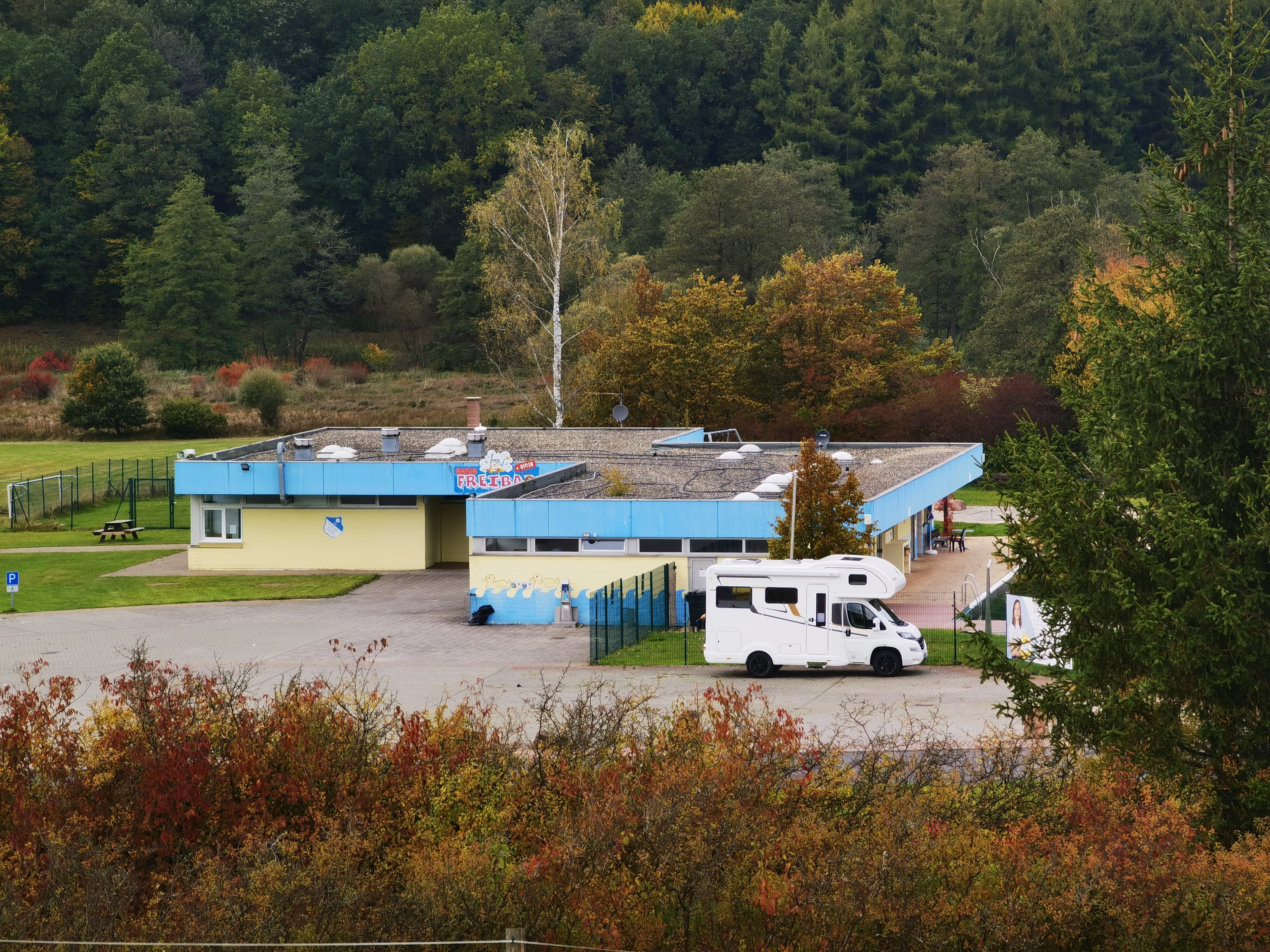 In Ruhe machten wir uns reisefertig und starteten unsere 150km lange Etappe auf A44 in Richtung Kassel, bzw. A7 in Richtung Würzburg / Nürnberg. Wir verließen die A7 bei Bad Brückenau und peilten unseren ersten Spot an. Da während der Reise die Sonne schien, sich aber abzeichnete, dass es heute Nachmittag nicht besonders „einladend“ werden würde, verwarfen wir unseren Plan – in Bad Brückenau für 10€ auf dem „Stellplatz am Schloßpark“ zu stehen und fuhren weiter nach Zeitlofs. Hier sollte es – wieder an einem Sportplatz – einen kostenlosen SP geben. Für morgen ist die Wettervorhersage echt gut angekündigt und es wären von dort aus nur 5 Kilometer Landstraße zu unserem ersten „Allroad-Trail“ auf der Strecke nach Bad Kissingen. Es gab tatsächlich eine Ausschilderung zu diesem SP in Zeitlofs und den Platz gab es tatsächlich auch, allerdings standen hier 25 PKW rund um eine nagelneue Ver-/Entsorgungssäule für Womos auf einem offenbar nagelneu angelegten Areal. Da wir uns nicht zwischen PKW quetschen wollten und auch nicht über die „glatt gezogene Erdschicht“ des neuen Stellplatzes pflügen wollten, suchten wir kurzerhand einen neuen Spot und wurden im 6 Kilometer entfernten Nachbarort Altengronau fündig. Auch hier gab es wieder einen SP an einem Naturbad.