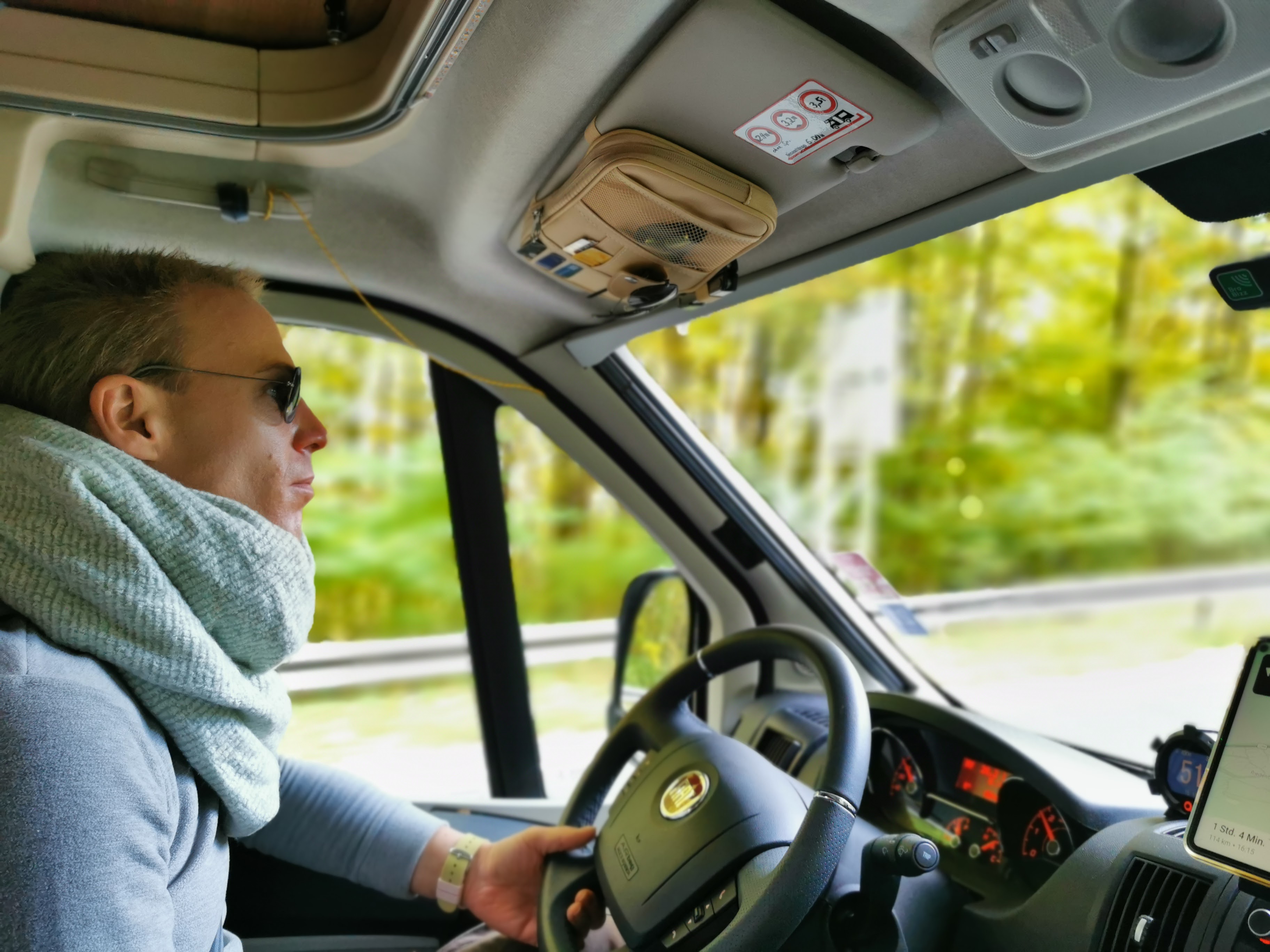 Nach dem Verlassen des Platzes winkten uns aus der Schlange drei Personen zu und wir erkannten die zwei Männer wieder, die uns am Mittwochabend schon auf unseren Activa angesprochen hatten. Sie fragten kurz, was wir vorhatten und wir teilten ihnen unseren Plan mit. Ich fuhr darauf schnell auf den NETTO-Parkplatz und die drei sprangen zu uns ins Mobil. Wir fuhren mehrere verschiedene Stellen und den Tagesparkplatz an, aber auch hier waren die Schlangen vor den Shuttle-Bus-Haltestellen nicht kürzer, als bei der Camp-Area.