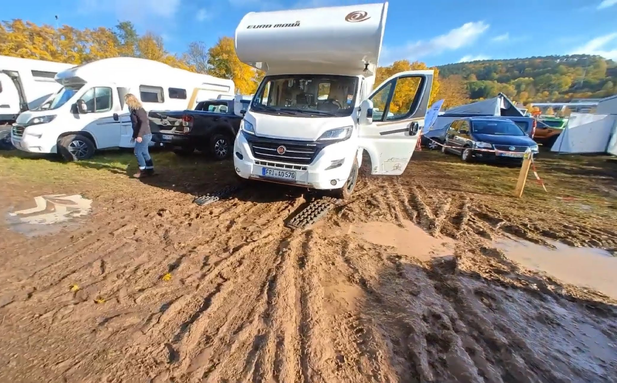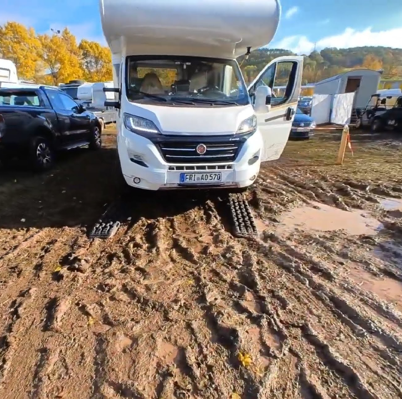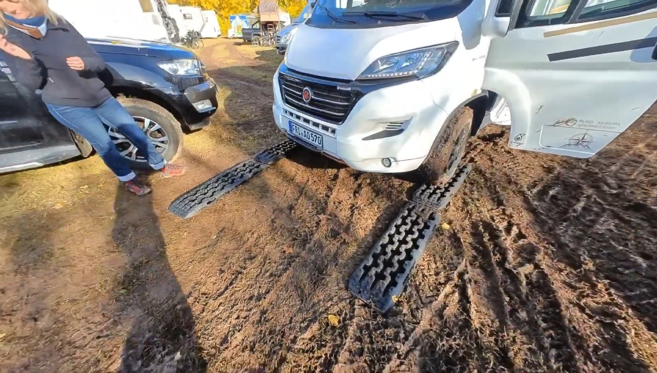 Auf der Hälfte des Weges, den Platz zu verlassen, reichte unser Schwung dann doch nicht mehr aus, ich musste stärker auf das Gaspedal treten und – schwupp – die Vorderreifen drehten beide – trotz eingeschaltetem „Traction+“ durch. Damit wir uns nicht richtig eingraben würden, probierten wir gar nicht erst viel rum und holten unsere 4 Recovery-Boards vom Heckträger und bauten uns in guter Pionier-Art Stück für Stück eine „Brücke“ durch den Schlamm. Es dauerte so natürlich etwas, aber es ging erstaunlich gut voran. Immer auf zwei Boards rauf, dann die frei gewordenen nach vorne tragen und so weiter. Mühsam ernährt sich das Eichhörnchen.