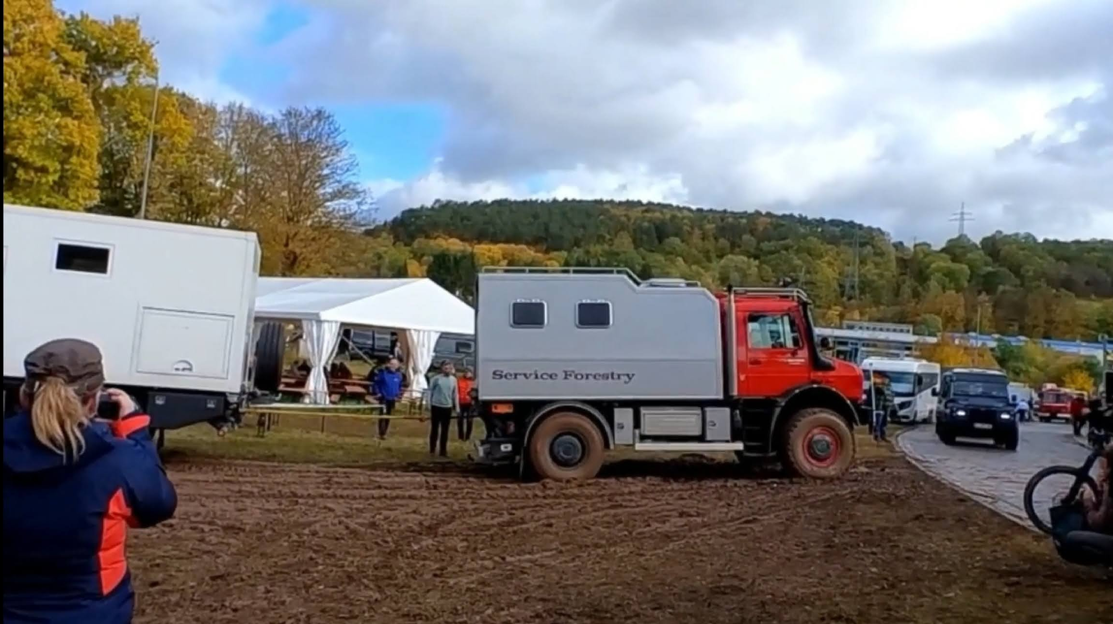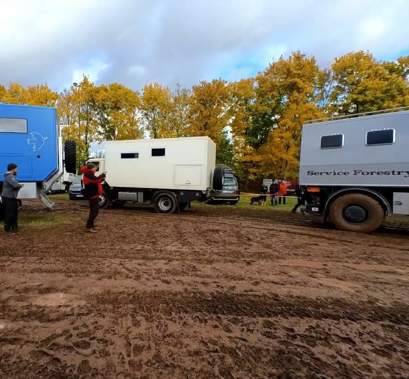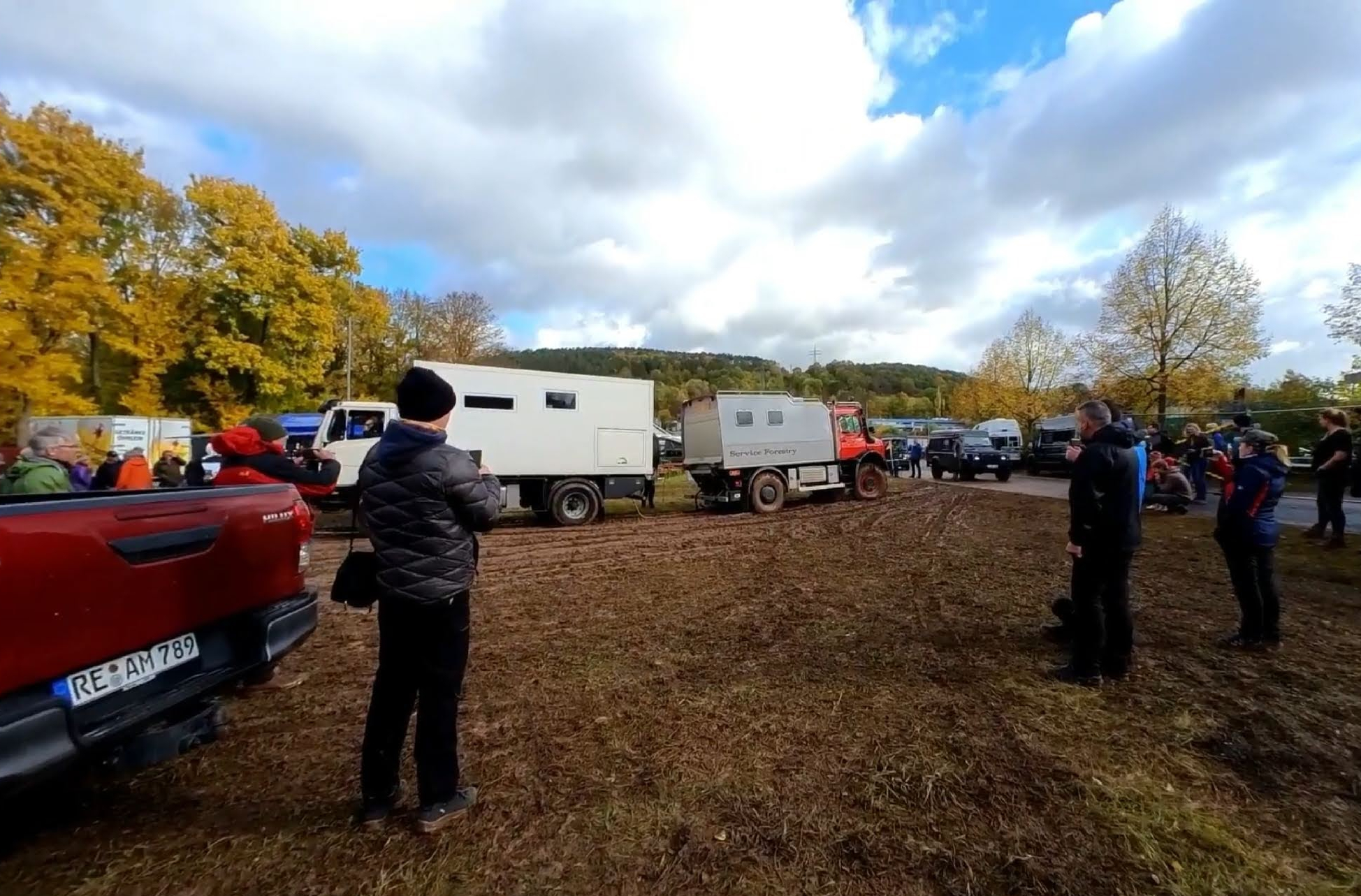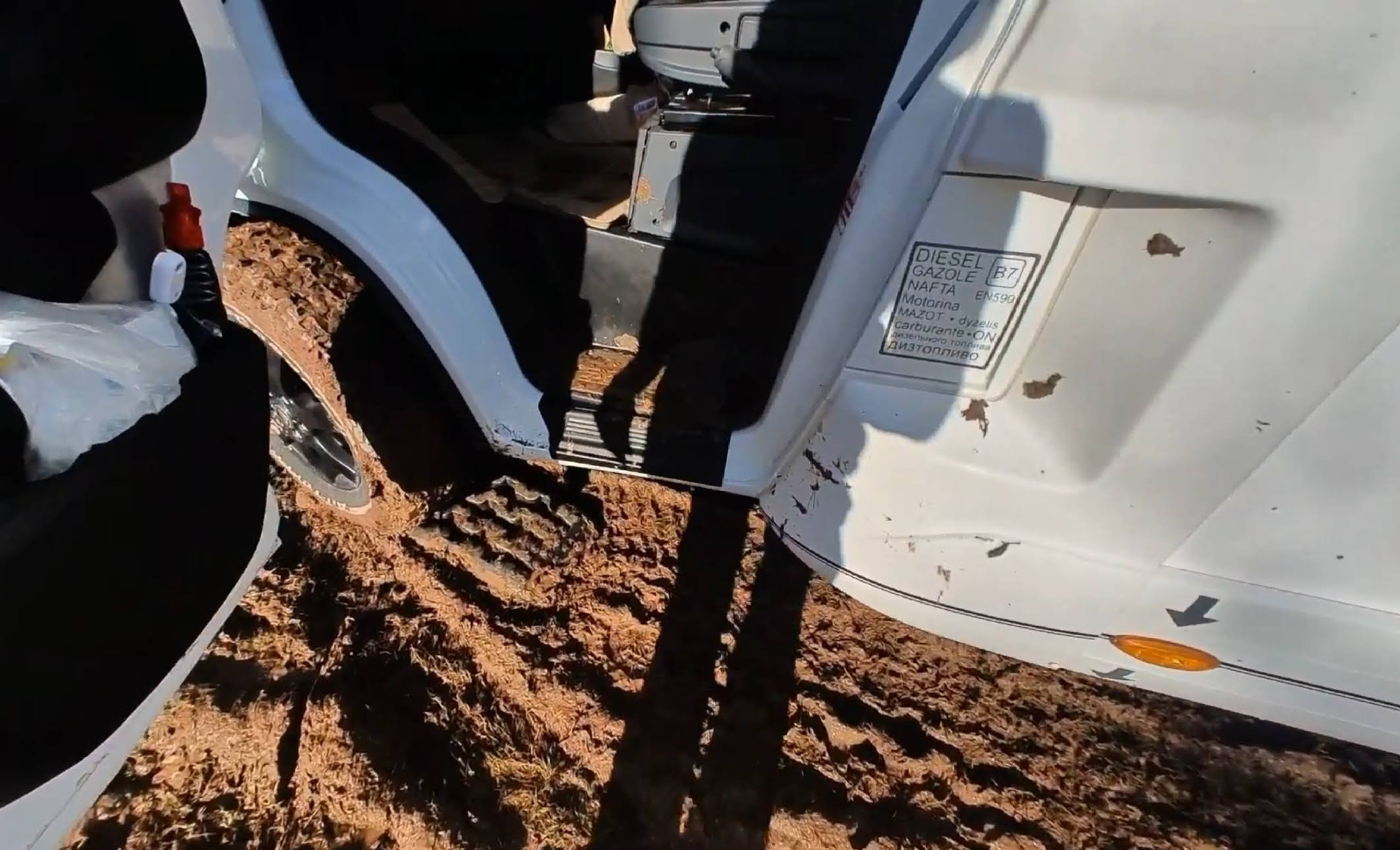 Auf der Hälfte des Weges, den Platz zu verlassen, reichte unser Schwung dann doch nicht mehr aus, ich musste stärker auf das Gaspedal treten und – schwupp – die Vorderreifen drehten beide – trotz eingeschaltetem „Traction+“ durch. Damit wir uns nicht richtig eingraben würden, probierten wir gar nicht erst viel rum und holten unsere 4 Recovery-Boards vom Heckträger und bauten uns in guter Pionier-Art Stück für Stück eine „Brücke“ durch den Schlamm. Es dauerte so natürlich etwas, aber es ging erstaunlich gut voran. Immer auf zwei Boards rauf, dann die frei gewordenen nach vorne tragen und so weiter. Mühsam ernährt sich das Eichhörnchen.