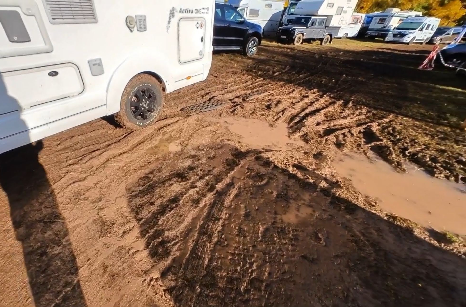 Nach dem Gang zum Netto und dem anschließenden Essen ging ich mehrfach den „Weg“ von unserem Stellpatz zum Ausgang auf und ab. Der starke Regen hatte die Ausfahrt ziemlich aufgeweicht und er war nun stark zerwühlt und rutschig.