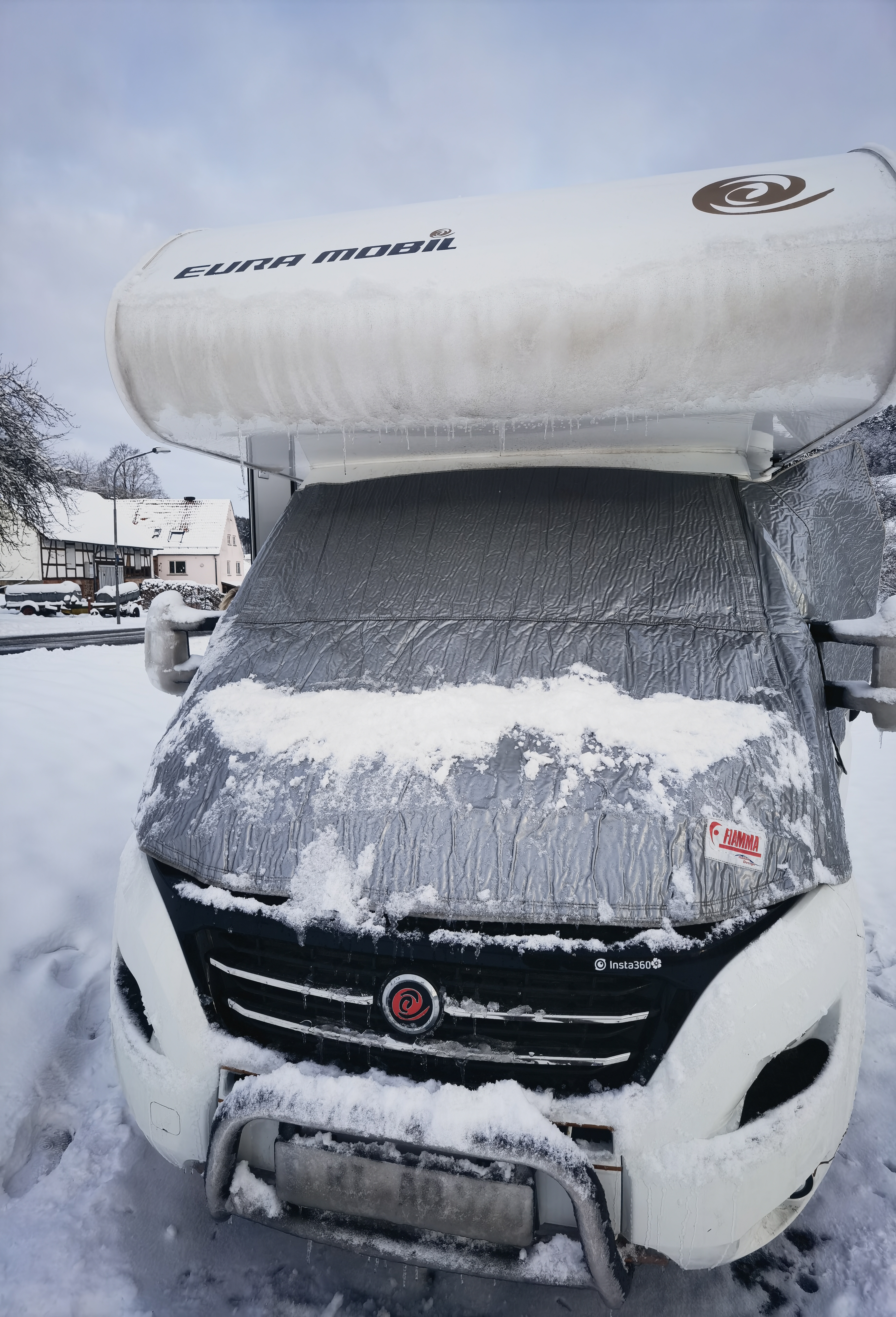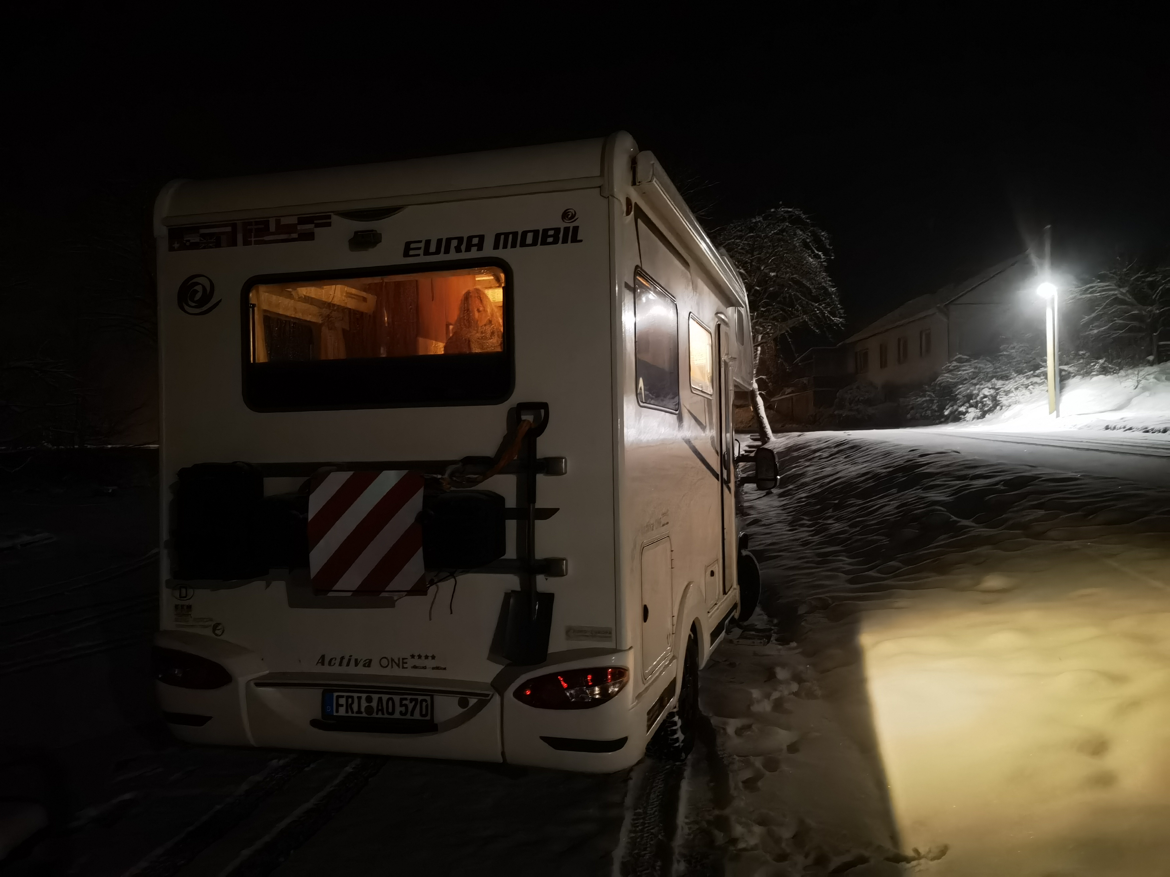 Die Anfahrt des spontan herausgesuchten Stellplatzes erwies sich als nicht ganz einfach, da die Zuwegung durch mehrere kleine Ortschaften führte. Überall lag bis zu 10cm Neuschnee und die Straßen war nicht geräumt. Unterhalb der Burgruine Wallenstein fanden wir ein Plätzchen.