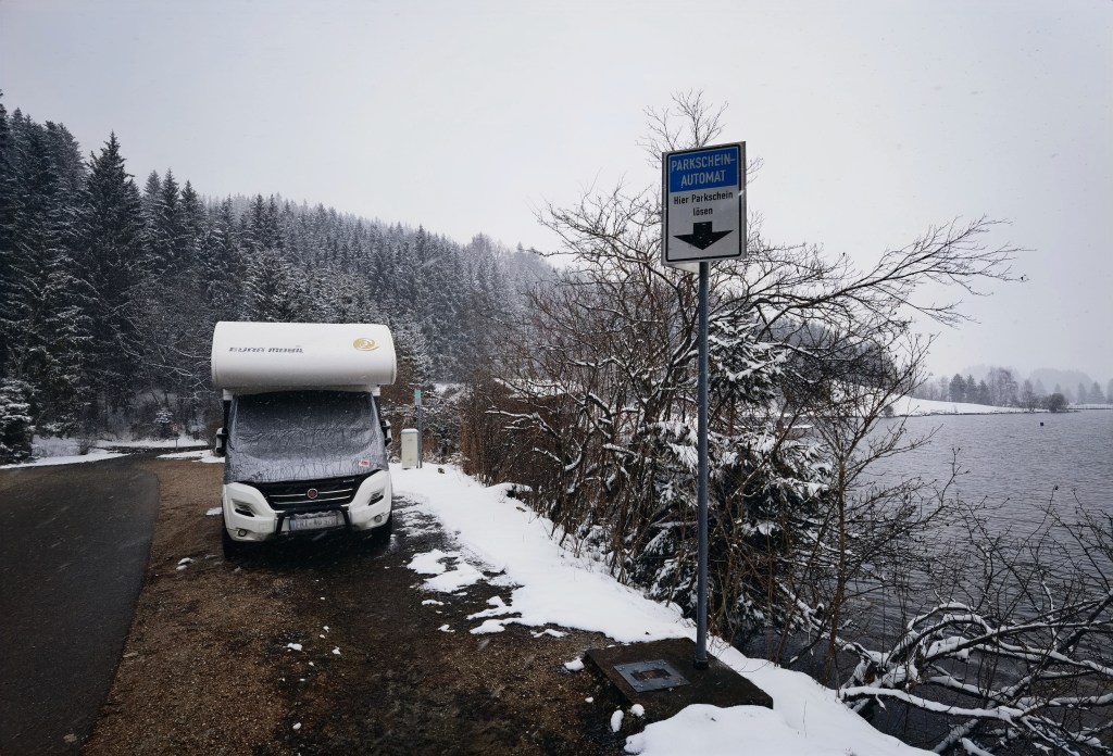 Wir fanden dann nach weitere 1.5h am Badesee „Schwarzenberger Weiher“ ca. 25km vor Füssen einen geschotterten (wobei im Moment: „verschneiten“ ) Parkplatz für uns ganz alleine vor. Wir hatten gelesen, dass Übernachtungen hier erlaubt seien, man aber eine Parkgebühr entrichten muss…
