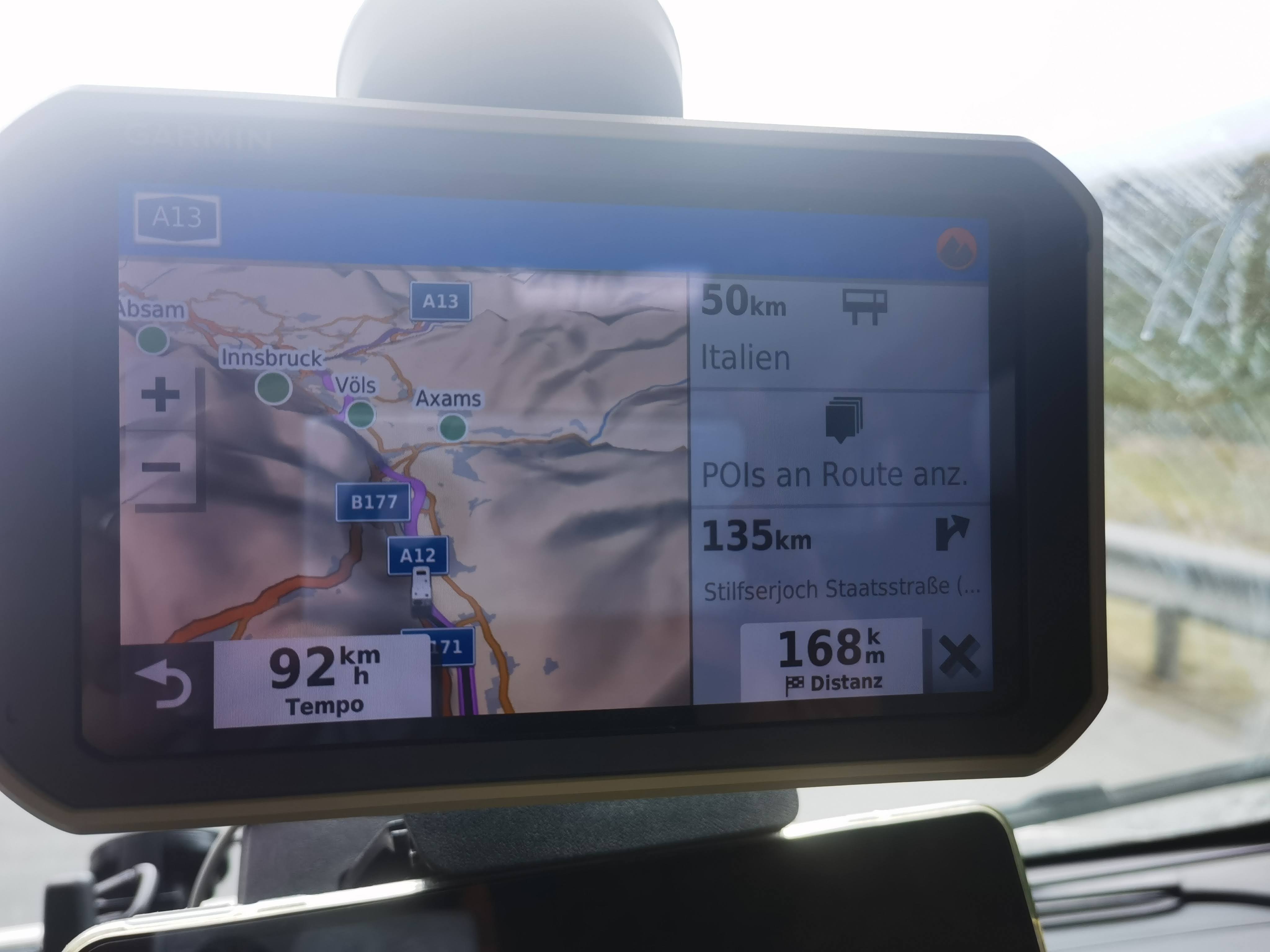 Wir bogen dann auf die B179 – den Fernpass – in Richtung Innsbruck. Auf dem Pass tankten wir noch schnell Diesel und bei der nächsten Station (bei der ersten gab es kein LPG mehr) auch noch den Gastank voll. In Österreich bewegten sich die Dieselpreise ca. 40ct unter dem dt. Niveau. Der kg-Preis für LPG unterschied sich nicht wesentlich. Der Fernpass als Bundesstraße ist top ausgebaut und machte Spaß, diesen „mini-Alpen-Pass“ zu fahren. Als wir nach knapp einer 3/4 Stunde auf der Autobahn in Richtung Innsbruck ankamen war das Wetter nach wie vor wechselhaft und es zog und magisch weiter in Richtung Süden.