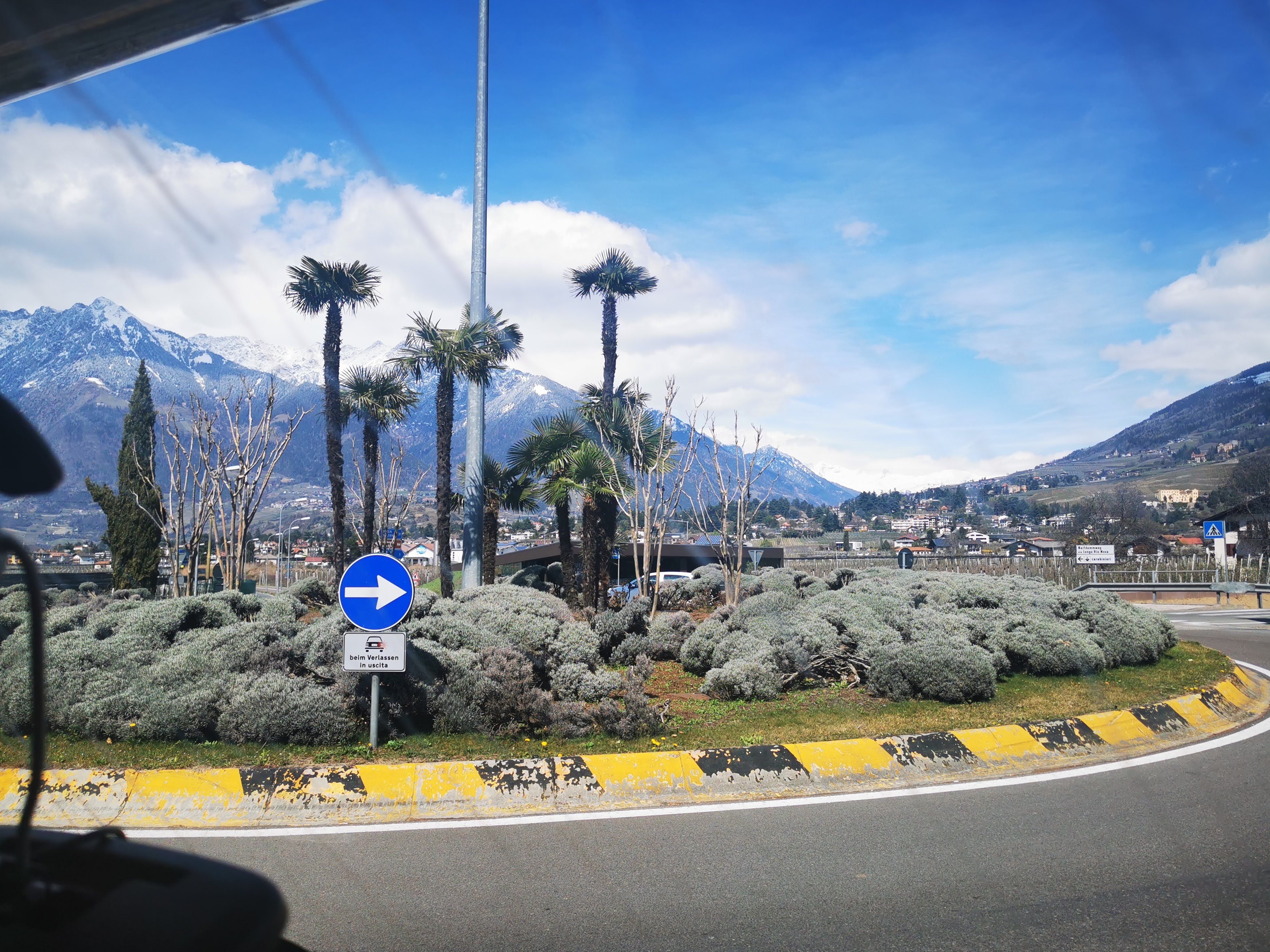 Es war dann aber wieder beeindruckend – kaum lässt man die Landesgrenze hinter sich, steigt die Temperatur am 10 Grad an und die Sonne scheint. Wir fuhren weiter nach Bozen, bogen in der Stadt auf die „Weinstraße“ ab und folgten ihr (sie führt eigentlich nach Süden) in Richtung Nord.