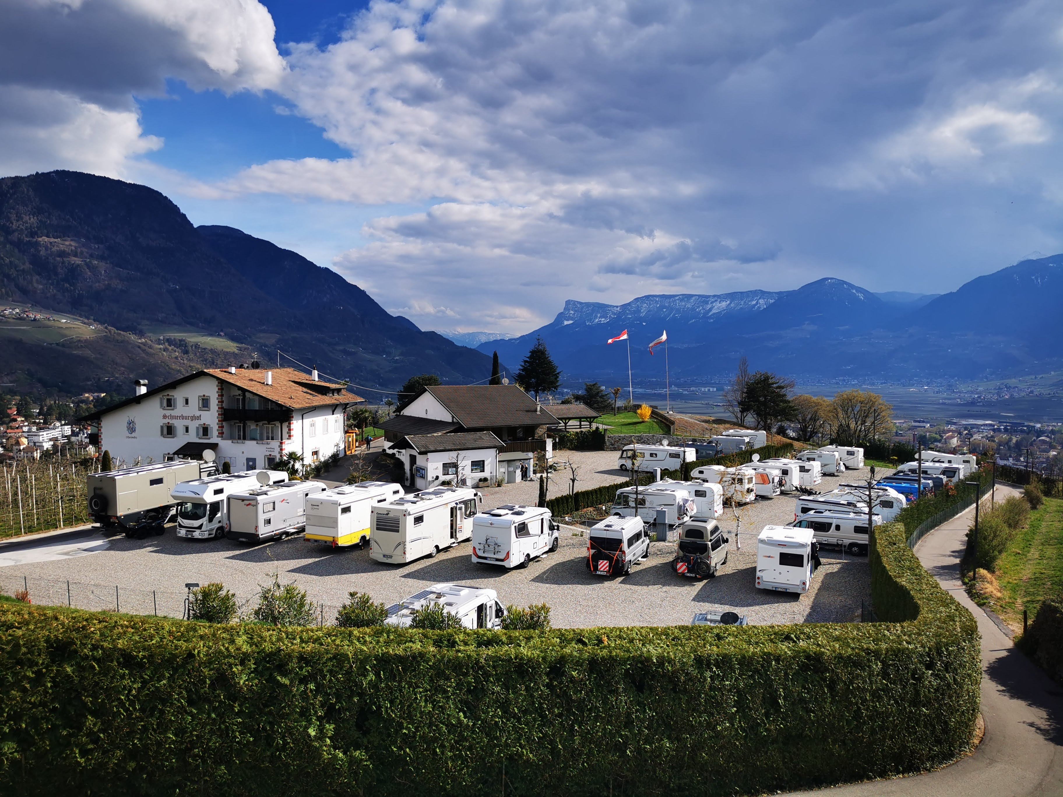 Wir hatten uns für die Nacht einen Stellplatz am Schneeburghof ausgesucht. Dieser liegt fußläufig am Dorf Tirol. Er bietet 60 Mini-Stellplätze für einen Maxi-Preis (30€ inkl. Kurtaxe und Strom). Man steht hier sehr eng – längere Zeit würden wir hier nicht stehen wollen, für eine Nacht wird es gehen…Vor allem, weil wir die beiden Flaschen „Haus-Vernatsch“ auch gleich leer getrunken haben.