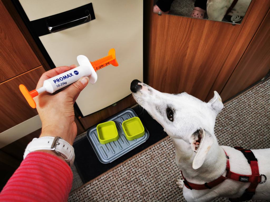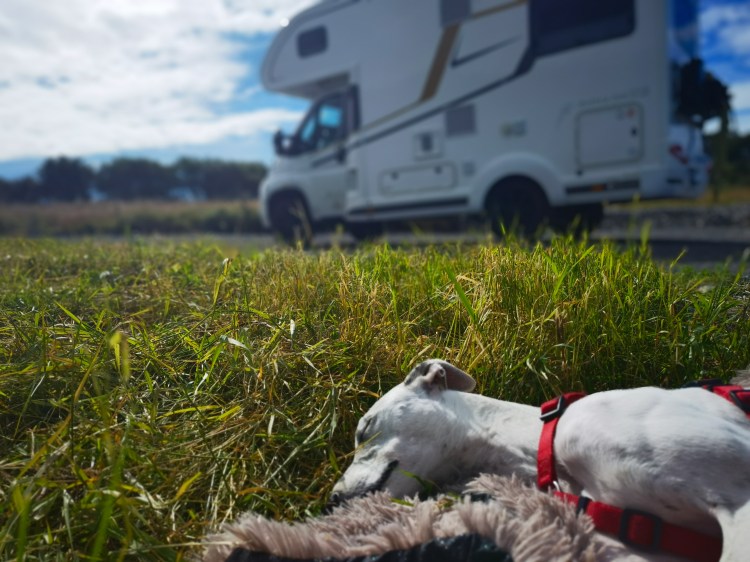 Wir fuhren noch 2 weitere Parkplätze an, alles belegt. Auf dem Viertem gab es die Möglichkeit, über Nacht zu stehen. Zwischen 17 und 9 Uhr sogar kostenfrei… Perfekt, bis neun würden wir weg sein. Wir suchten uns einen Platz, zwei weitere Kastenwagen waren noch da. Wir gingen, da es Solana besser ging und nachdem sie die Kohle und die erste Portion des anderen Präparates zu sich genommen hatte, noch in den gegenüberliegenden Park und wollten noch ein wenig mit dem Ballspielen. Solana spielte wild – so wild, dass die Schleppleine ein ganzes Blumenbeet „zerschredderte“, als sie drüber fegte. Wir packten den Ball weg, Kathleen versuchte, den Schaden zu begrenzen und pflanzte die herausgerissenen Blumen wieder ein.