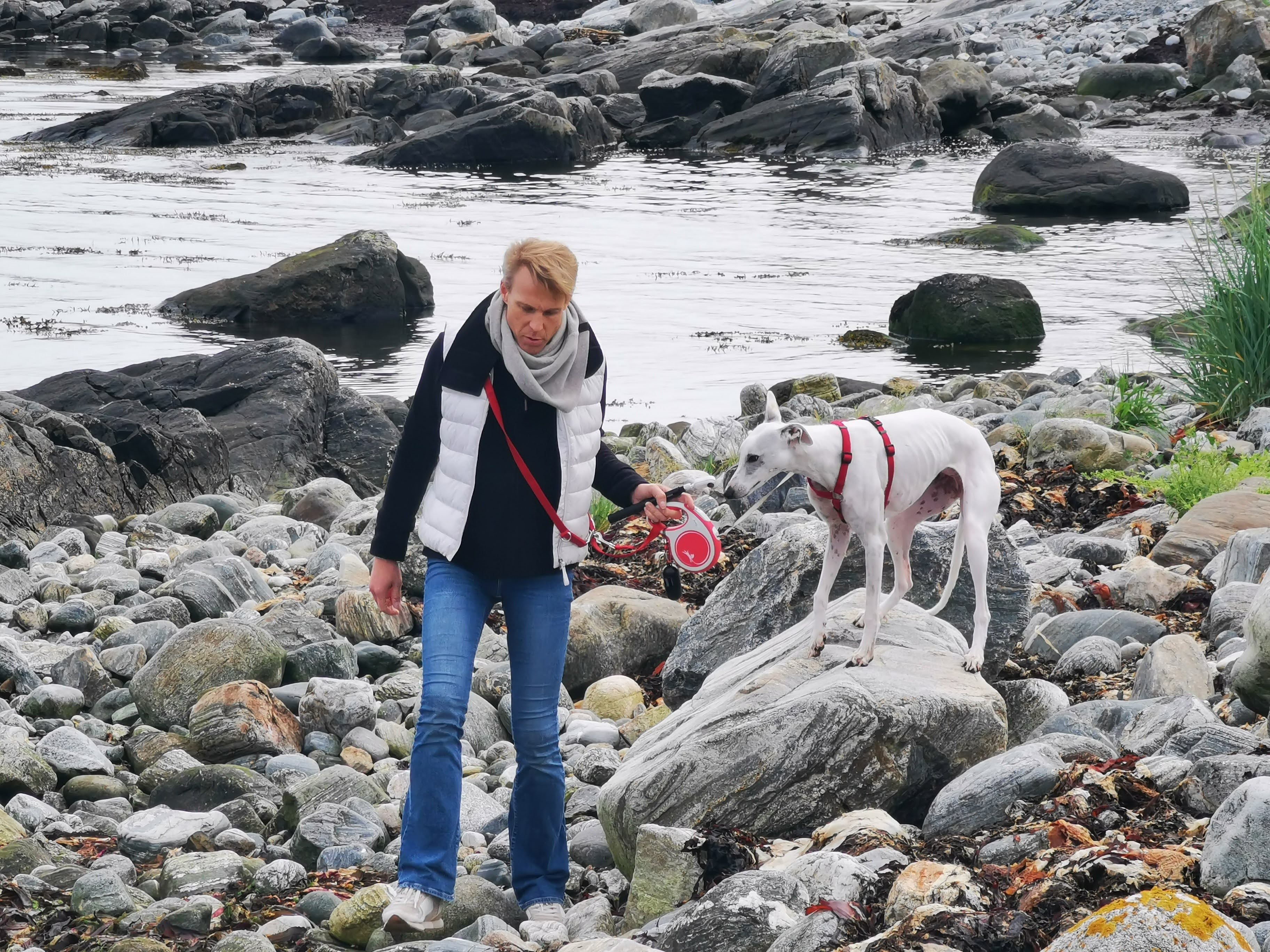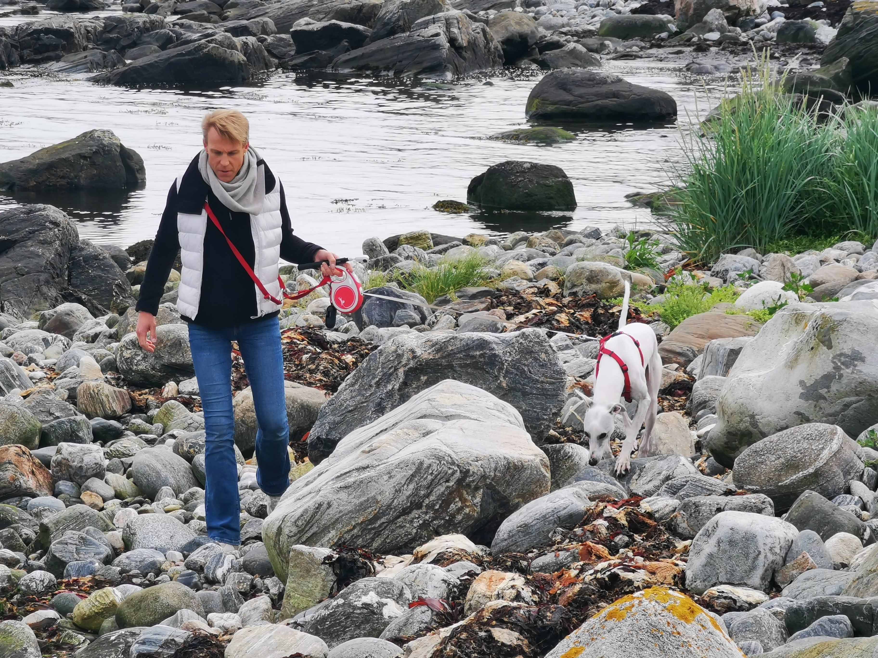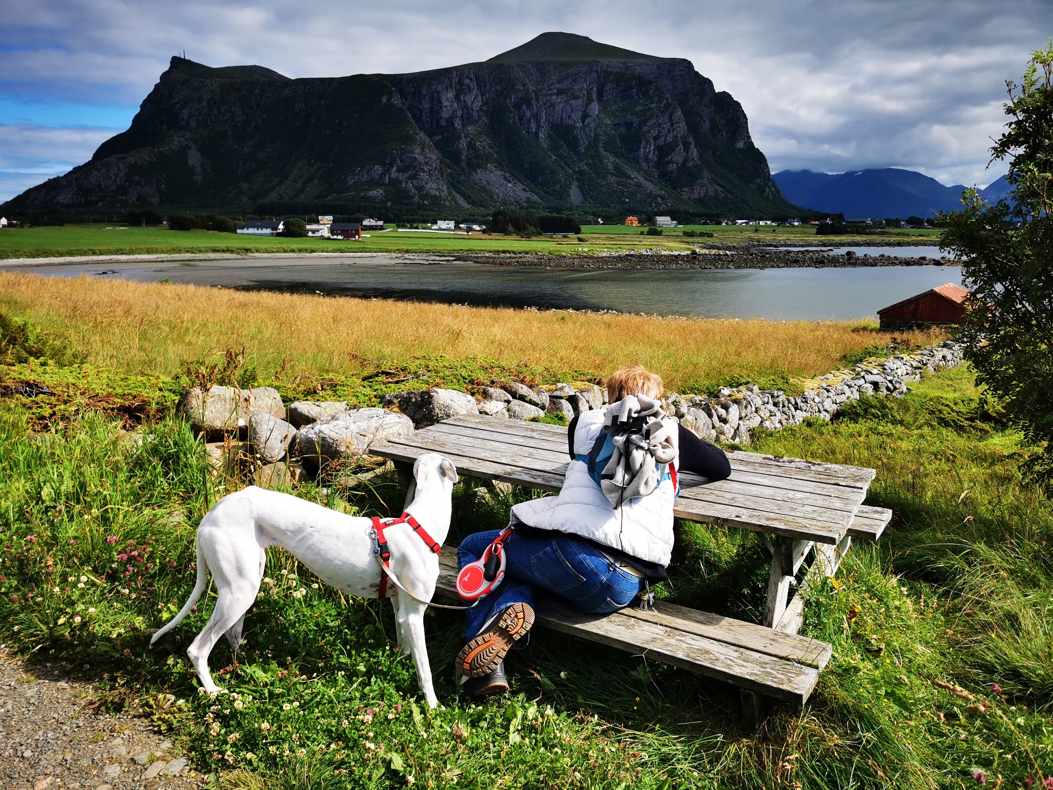 Irgendwann sagte Kathleen, dass sich Solana merkwürdig verhielt – sie würgte und keuchte. Wir versuchten, ihr ins Maul zu schauen, konnten aber nichts entdecken. Auch was sie eventuell aufgenommen hatte, wussten wir nicht…Eine Qualle? Nur Salzwasser?… Wir wollten schnell zum Auto zurück, damit sich Solana etwas beruhigen konnte, aber sie blieb immer wieder stehen und wollte partout Gras und alles, was am Wegesrand auf „Maulhöhe“ war, fressen…. Wir überlegten und schauten im Netz nach, ob es in der Nähe einen Tierarzt gab, der auch noch geöffnet hatte (Mittwochnachmittag ca. 1610 Uhr.)…Perfekt- in Kristiansand gab es eine Praxis, die noch bis 18 Uhr geöffnet hätte. Wir überlegten – da sich der Platz wieder einmal – gut gefüllt hatte, ob wir den Platz aufgeben und zur Praxis fahren, oder ob wir abwarten sollten…Denn eines war klar, nach knapp 2 Stunden, brauchten wir hier nicht wieder aufzutauchen… In Kristiansund gäbe es aber Möglichkeiten und zur Not müssten wir einen bezahlten Platz in Anspruch nehmen. Wir fuhren los….