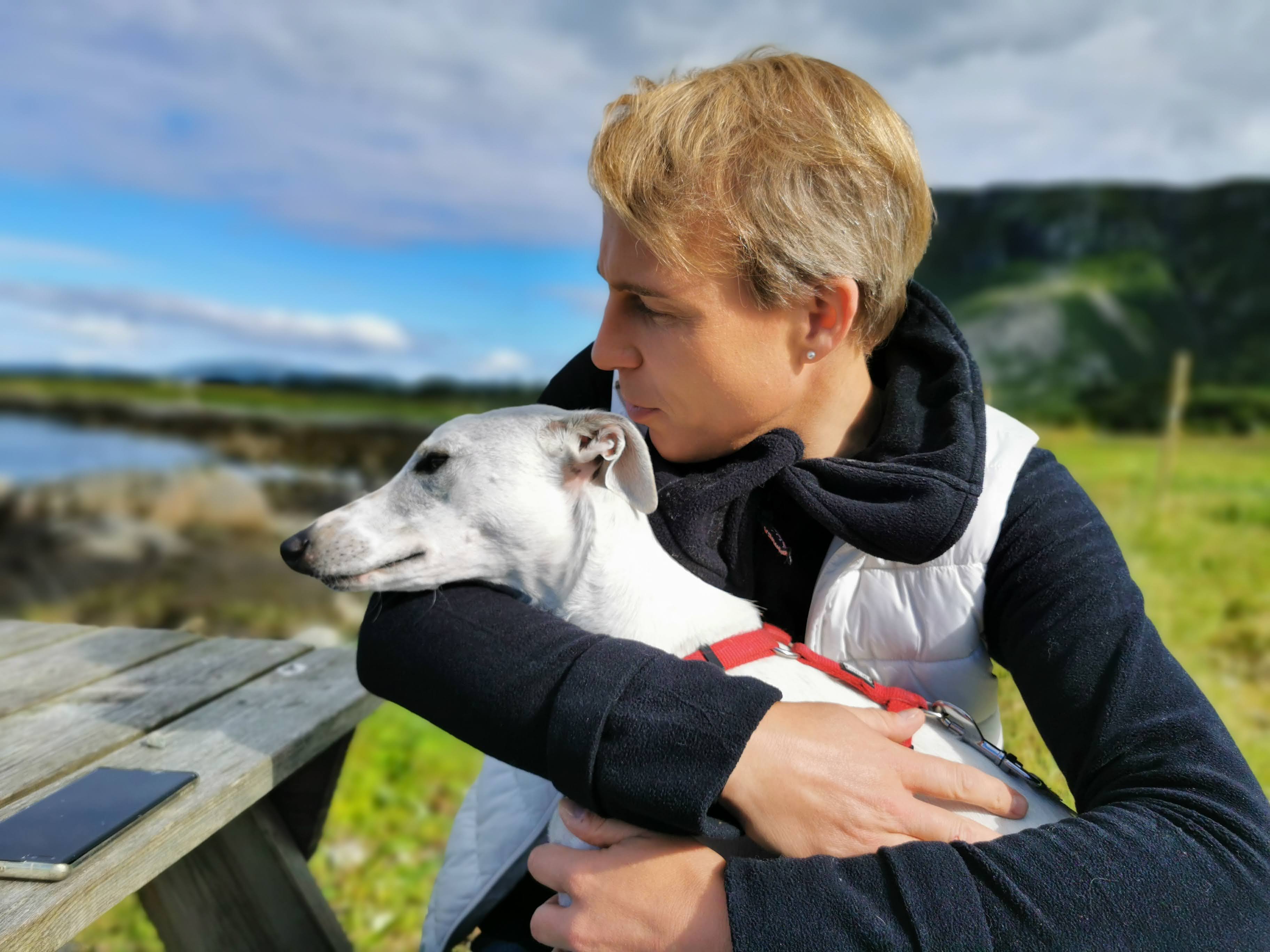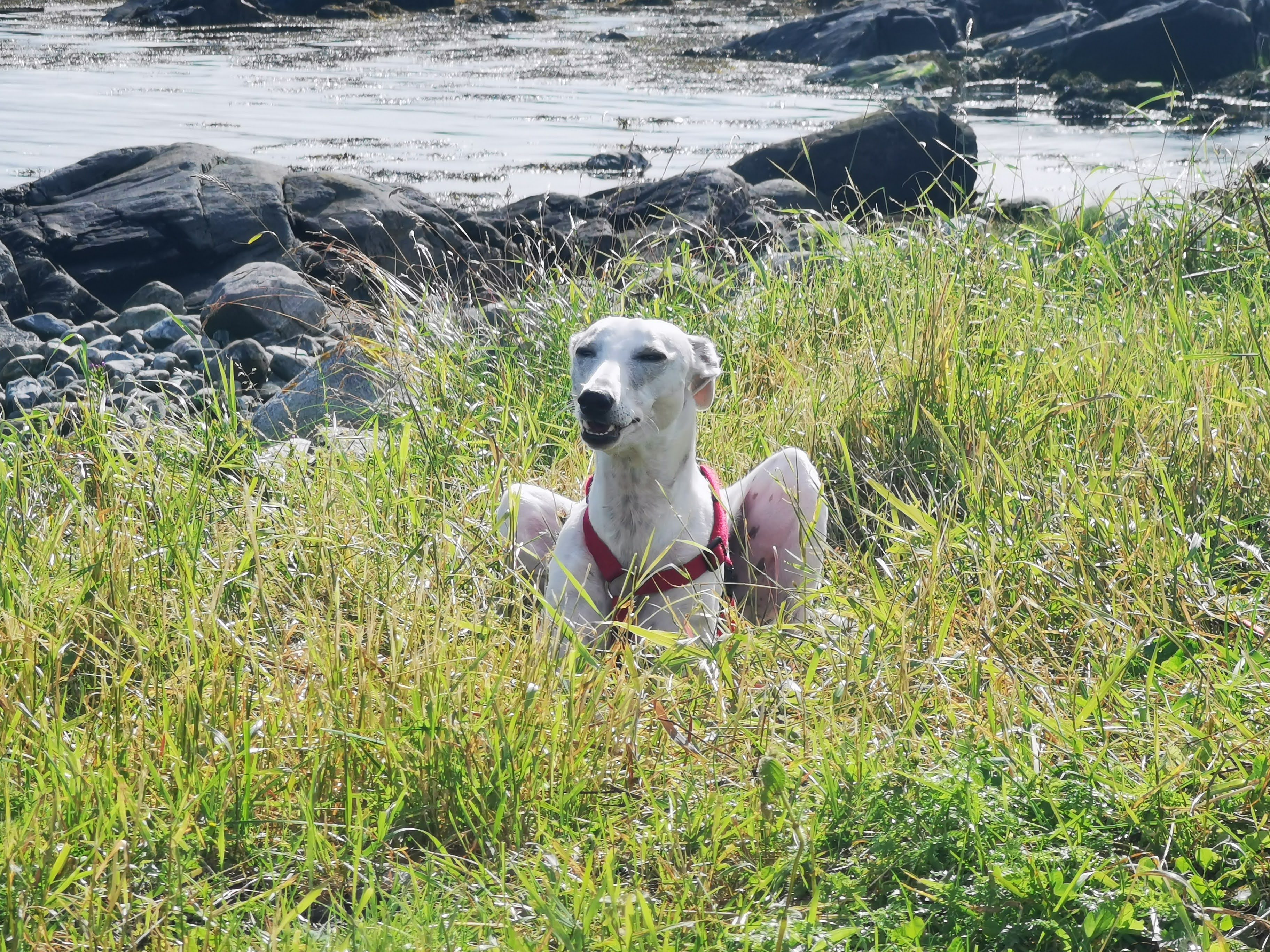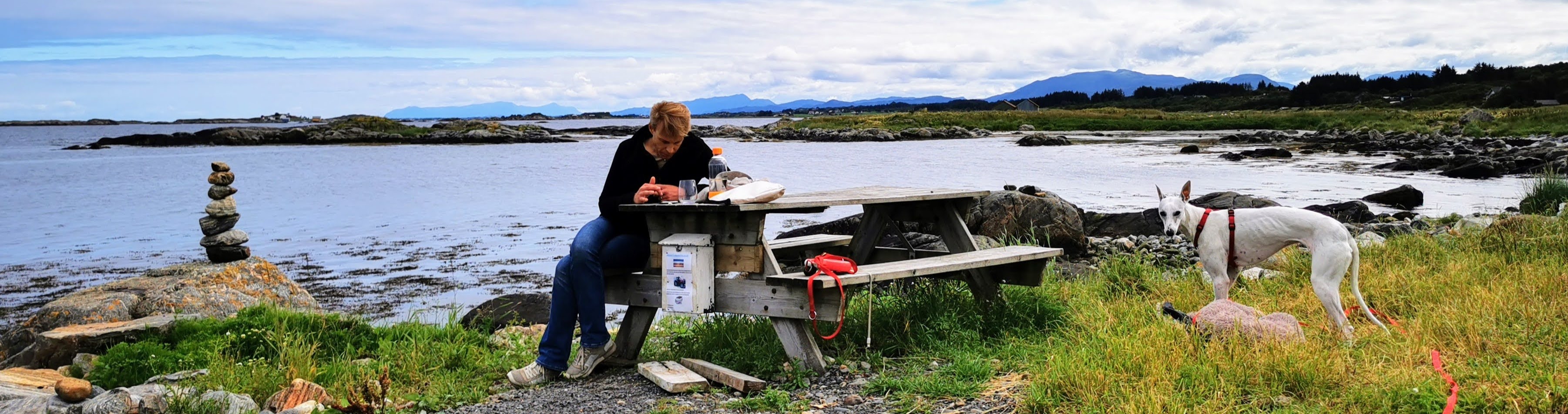 Irgendwann sagte Kathleen, dass sich Solana merkwürdig verhielt – sie würgte und keuchte. Wir versuchten, ihr ins Maul zu schauen, konnten aber nichts entdecken. Auch was sie eventuell aufgenommen hatte, wussten wir nicht…Eine Qualle? Nur Salzwasser?… Wir wollten schnell zum Auto zurück, damit sich Solana etwas beruhigen konnte, aber sie blieb immer wieder stehen und wollte partout Gras und alles, was am Wegesrand auf „Maulhöhe“ war, fressen…. Wir überlegten und schauten im Netz nach, ob es in der Nähe einen Tierarzt gab, der auch noch geöffnet hatte (Mittwochnachmittag ca. 1610 Uhr.)…Perfekt- in Kristiansand gab es eine Praxis, die noch bis 18 Uhr geöffnet hätte. Wir überlegten – da sich der Platz wieder einmal – gut gefüllt hatte, ob wir den Platz aufgeben und zur Praxis fahren, oder ob wir abwarten sollten…Denn eines war klar, nach knapp 2 Stunden, brauchten wir hier nicht wieder aufzutauchen… In Kristiansund gäbe es aber Möglichkeiten und zur Not müssten wir einen bezahlten Platz in Anspruch nehmen. Wir fuhren los….