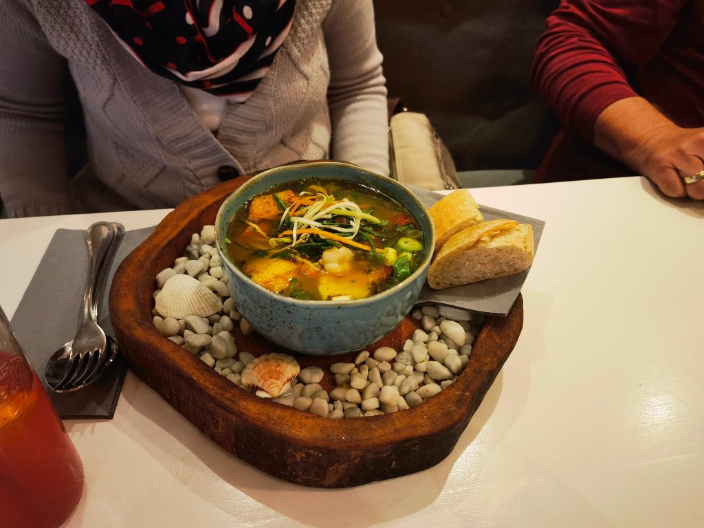 Im Anschluss gingen wir zum Pier 14. Auch spannend… Ich vermutete an der Adresse – ehrlich gesagt – kein Restaurant. Von außen nicht als solches zu erkennen, muss man sich seinen Weg durch Bekleidungsständer und an Regalen vorbei zu einer kleinen Treppe bahnen. Diese führt dann zu einer Ebene, auf der mehrere gemütliche Sitzplätze im „Shabby Chic“-Ambiente zum Verweilen einladen. Die Karte war modern und wir wurden mit tollen Speisen verwöhnt: