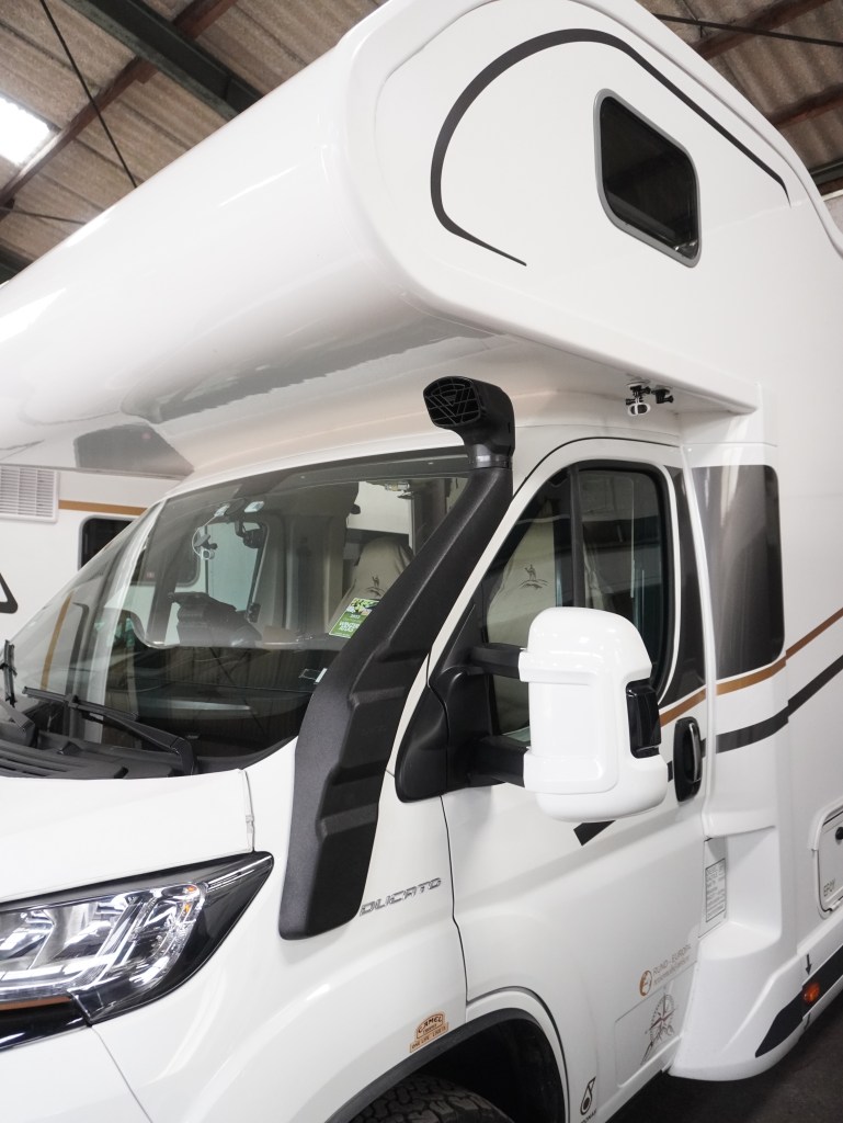 Nachdem die drei selbst sichernden M8 Edelstahlmuttern angezogen waren, schraubte ich den Schnorchel mit den beiden bereits mit Sicherungskleber versehenen, kleinen Schrauben am Winkel an der A-Säule fest und zum Schluss kam nur noch der obere Teil drauf und wurde auch mit einer Schelle befestigt.