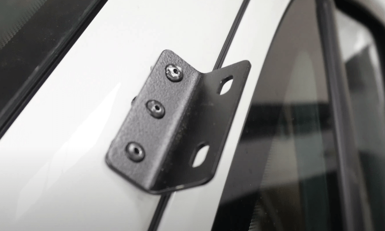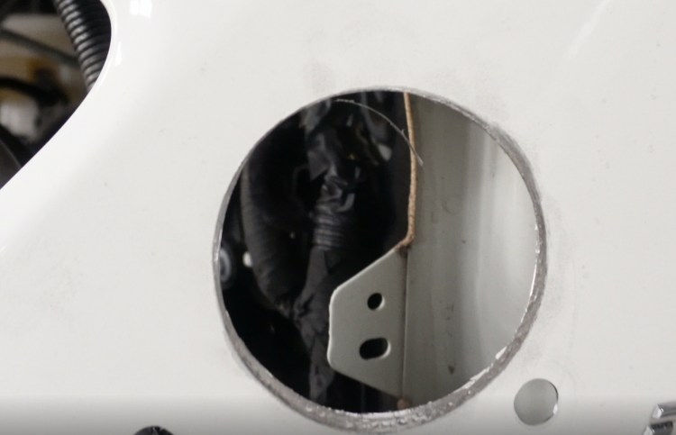 Nach dem Bohren der drei kleineren Löcher und der 86mm Durchführung entgratete ich das Blech und versiegelte es mit Rostschutzfarbe. So konnte dann der Schnorchel provisorisch angebracht werden, damit ich die Anbauhöhe, bzw. die Position des Winkels an der A-Säule anzeichnen konnte. Danach nahm ich den Schnorchel wieder ab und zeichnete die drei Bohrungen für den Winkel an.