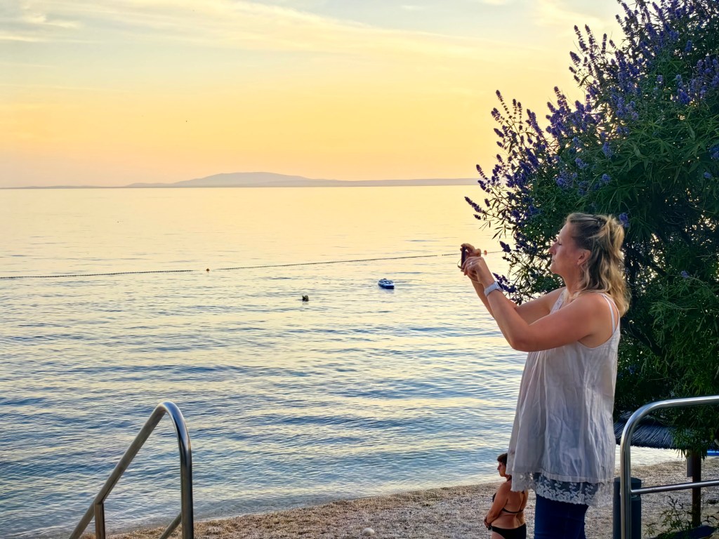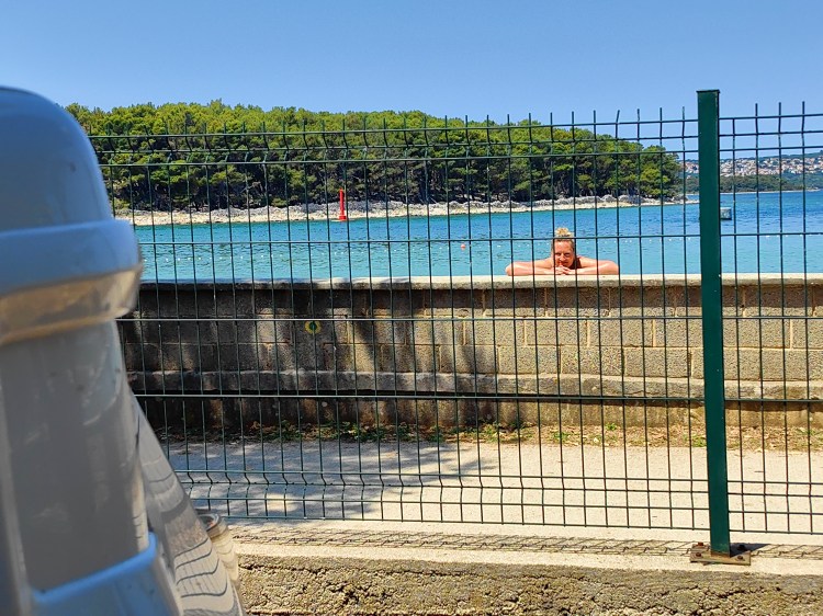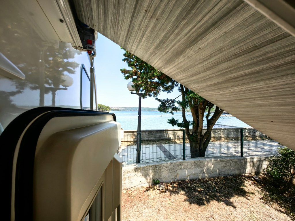 Die Parzelle auf dem Camp Pilar in Punat war wirklich großartig. Allerdings kann man für 55€ die Nacht auch die „basics“, wie Strom, Wasser, Abwasser am Platz erwarten. Der Platz hatte mehrere schattenspendende Bäume, war zu drei Seiten mit Hecken versehen und aufs Wasser, bzw. den „Betonstrand“ konnten wir auch noch sehen.