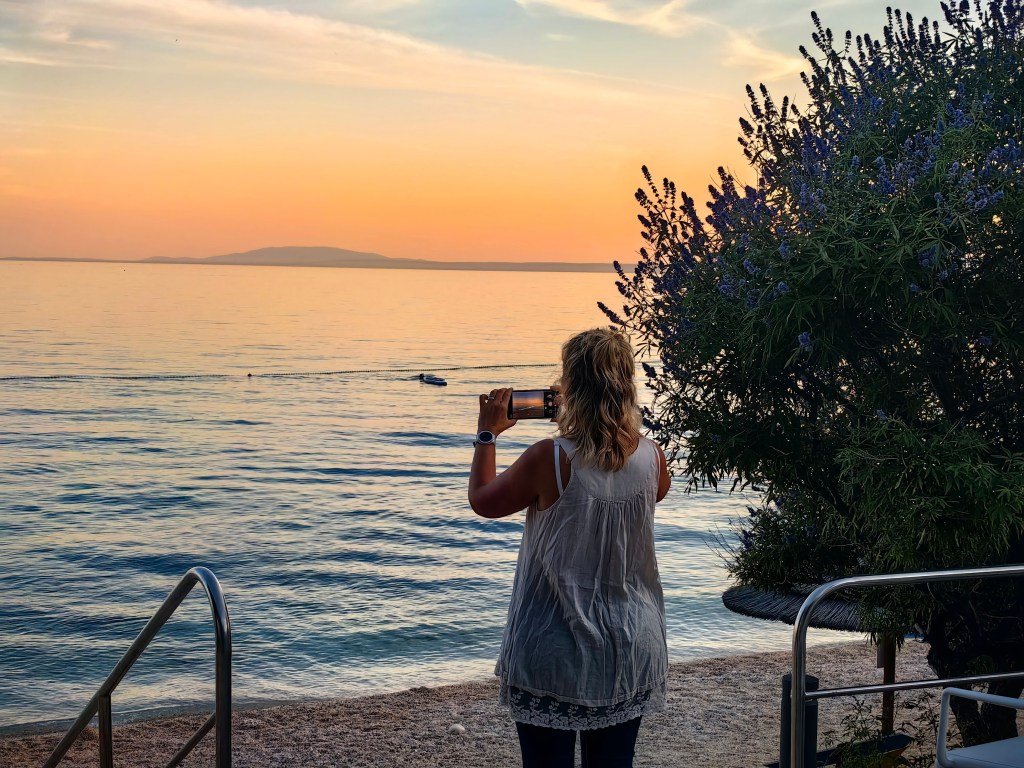 Kate ließ es sich nicht nehmen, den Zugang zum Wasser sofort auszuprobieren und fand auch ein Schild zum Hundestrand. Am Abend mussten wir jedoch feststellen, dass der Hundestrand – ähnlich wie an deutschen Nord- und Ostseestränden – 3 Kilometer von den Hotspots entfernt lag. Wir begaben uns trotzdem auf den beschwerlichen Weg auf der Promenade und fanden an deren Ende auch den besagten Hundeabschnitt. Toll: es gab eine kleine Freilauffläche für Hunde! Schlecht: den Zugang zum Wasser an „Hundestrand“ schafft man nur, wenn Mensch und Tier die Grundausbildung bei den Gebirgsjägern absolviert haben….Von „Strand“ war man da auf jeden Fall weit entfernt.