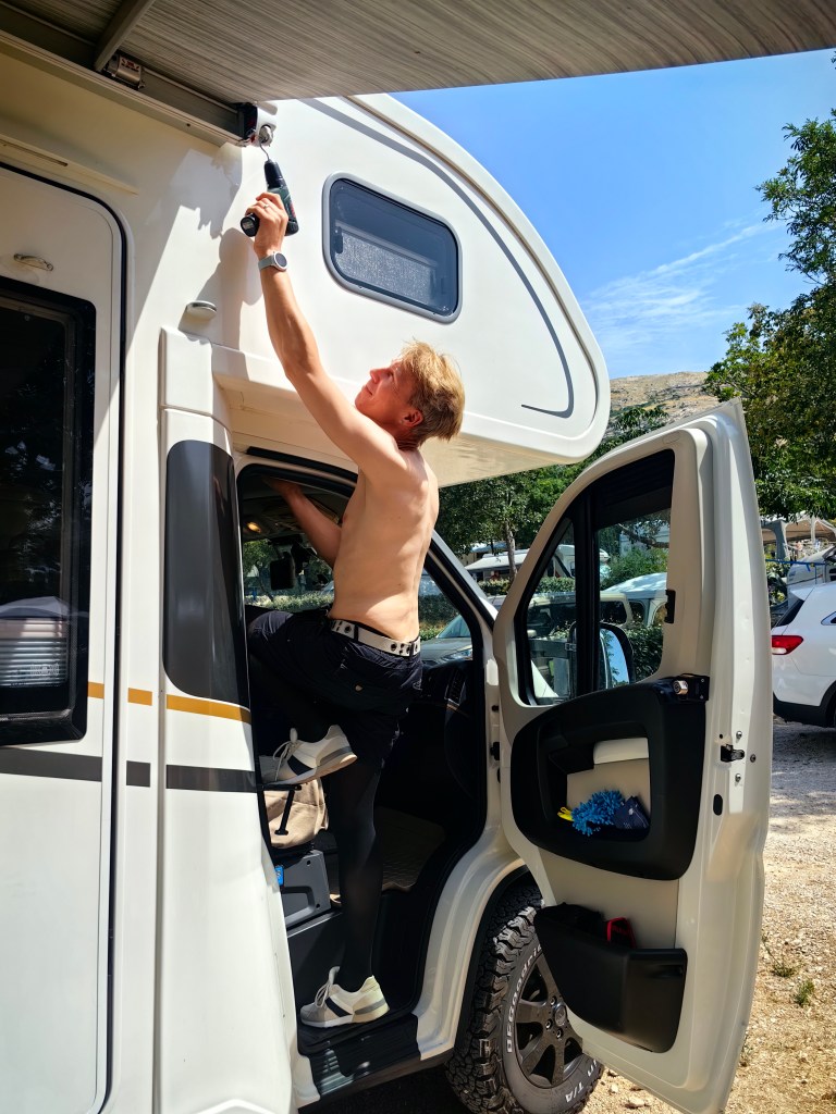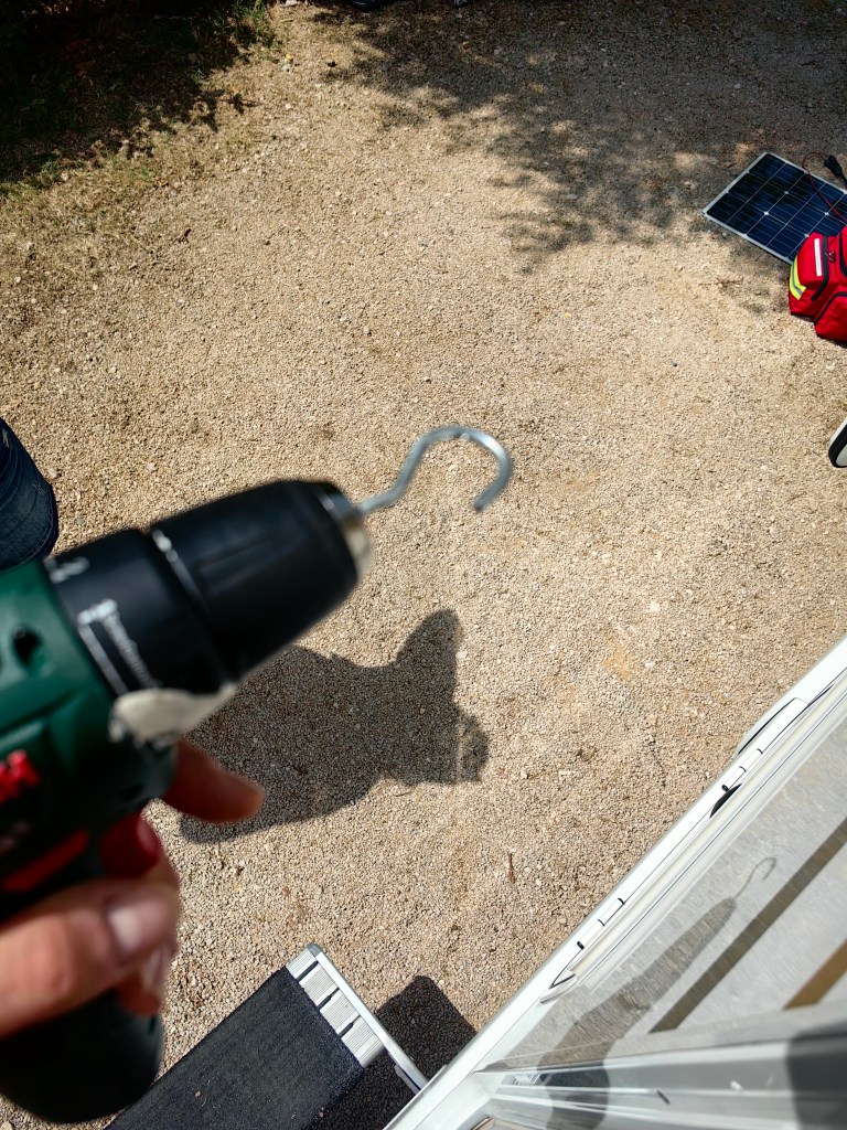Leider hatten wir in Punat die Kurbel unserer Markise vergessen und so war ich doppelt froh, dass ich den Akkuschrauber mitgenommen hatte und noch einen alten Zelthering so biegen konnte, das er passte.