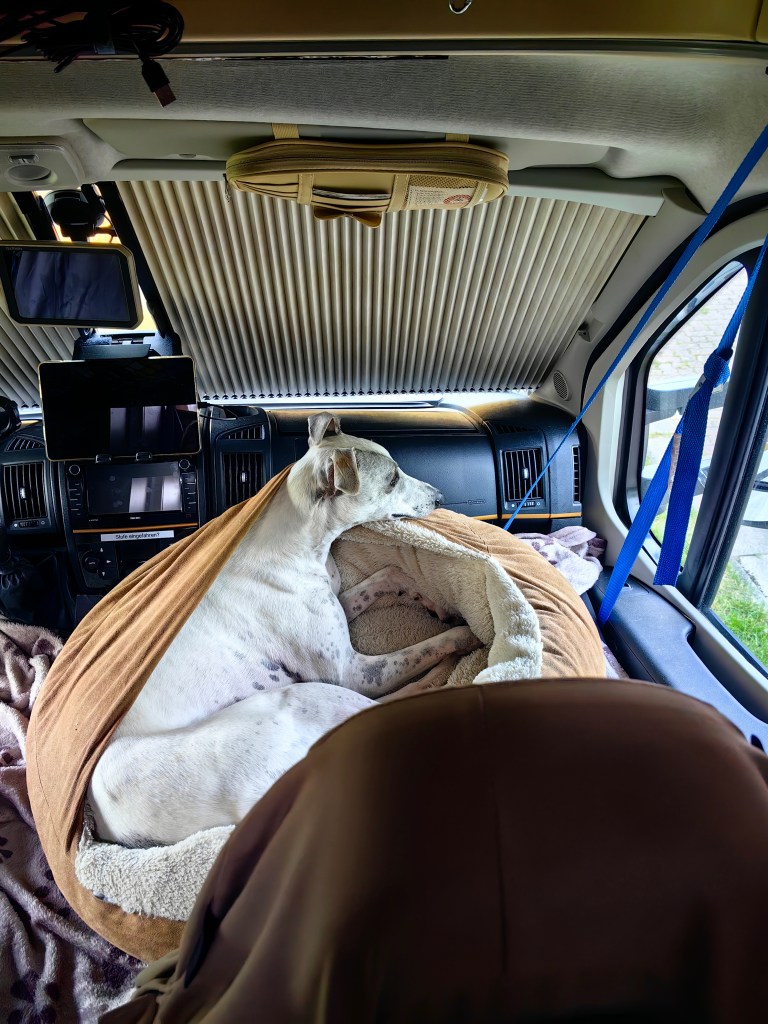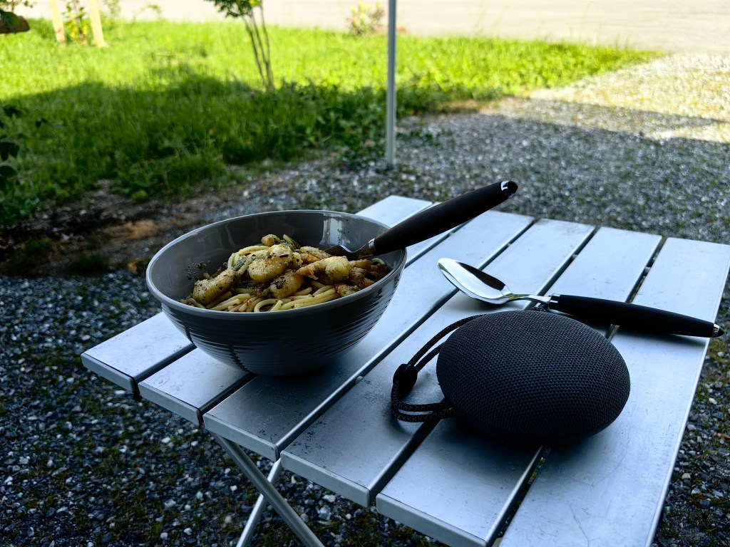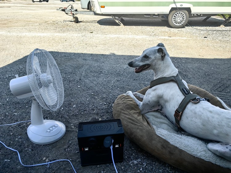 „Gemeinsam!“ – also begab ich mich ohne Umwege zum Parkplatz. Kate und Solana „hingen“ müde im Schatten hinterm Mobil. Ich holte die Powerstation aus dem Mobil, schloss den Ventilator an und erntete direkt ernstgemeinten Lob für meine aufopferungsvolle Aktion.