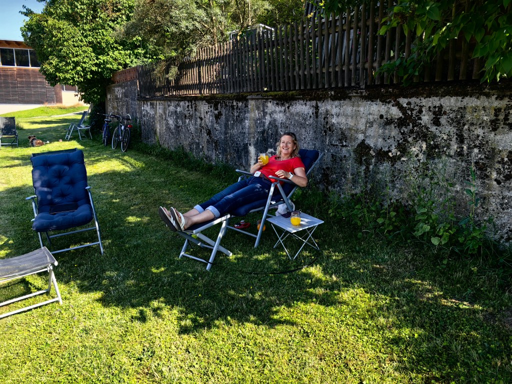 Am nächsten Tag wollten wir bis kurz vor den Chiemsee fahren. Wir fuhren einen Wanderparkplatz an, der uns aber nicht als Nachtlager zusagte und so aßen wir hier nur ein Eis. Kate machte mit Solana einen kurzen „PipiGang“ und ich suchte in der Umgebung einen neuen Platz. Ca 10km weiter war in diesem Jahr ein neuer Stellplatz an einem öffentlichen „Moorbad“ eröffnet worden, den wir ansteuerten. Laut Details im Netz sollte er alle Annehmlichkeiten eines modernen Stellplatzes vereinen und zusätzlich zum Freibad auch noch eine Restauration in der Nachbarschaft haben. Ideal: Das Ganze für 13€.