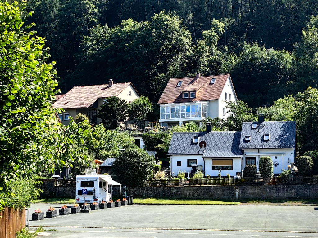 Frische Brötchen gab´s bei Penny und nach dem Frühstück ging es weiter nach Bad Berneck im Fichtelgebirge. Wieder ein ganz wunderbarer Platz. Ohne „Grundgebühr“ – bezahlt wird nur für die Dienstleistungen, die man zusätzlich in Anspruch nimmt (Wasser, Strom). Wie das bei solchen Plätzen jedoch häufig der Fall ist, gibt es bloß 4-6 Stellplätze und 4 sind von „Dauercampern“, die hier quasi „umsonst“ wohnen, belegt. So auch hier: 3 Womo-Besatzungen (mit völlig unterschiedlichen Kennzeichen) schienen schon seit Wochen hier nebeneinander zu stehen und waren mittlerweile gut „befreundet“, was man den völlig sinnbefreiten und belanglosen Gesprächen, die lautstark vor den Autos geführt wurden, entnehmen konnte… Da wurden alte Reisegeschichten erzählt und so mancher Stellplatz total abgefeiert, oder völlig zerrissen… Da es extrem warm (zu dieser Zeit empfanden wir es schon als heiß, aber das sollten die nächsten Tage relativieren) war, saßen wir auf unseren Stühlen im Schatten einer Mauer. Es dauerte nur kurz bis die ersten auch ihre Stühle zu uns stellten und einen Meter neben uns saßen. Dem entzogen wir uns aber schnell: zuerst machten wir noch einen kurzen Gang zur Kneipp-Wassertretstelle und danach (mittlerweile spendete es genug Schatten) verzogen wir uns hinter das Reisemobil.