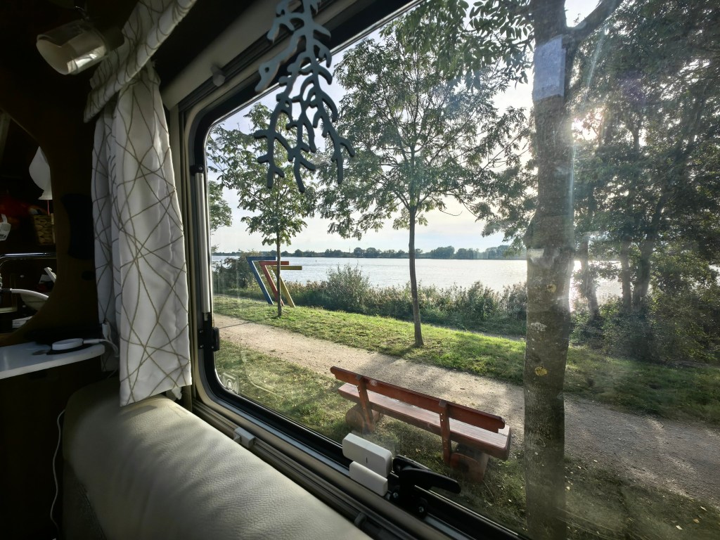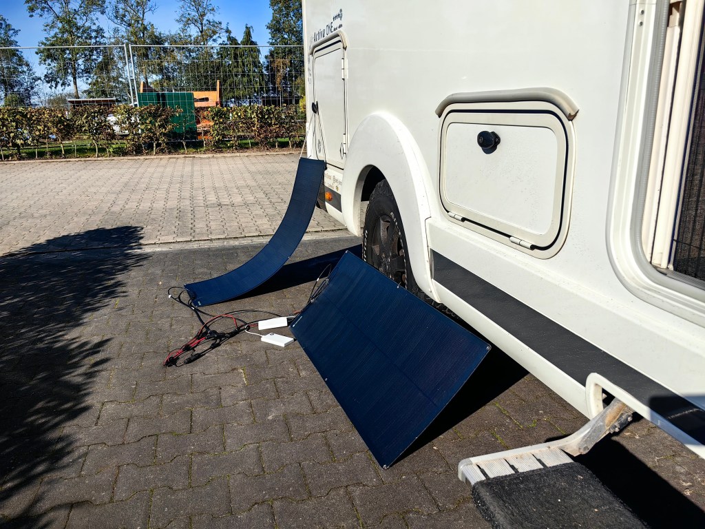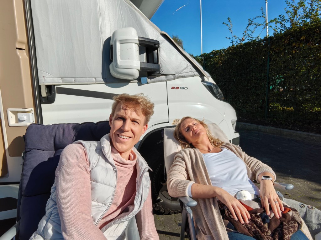 Der Tag war jedoch wesentlich besser als vorhergesagt. Ab 11 Uhr konnten wir in der Sonne vor unserem Mobil sitzen (Jaha – sogar Katie und Per tatsächlich ohne Schal und dicker Jacke!). Aufgrund der ein wenig übertriebenen Stromkosten (1€=0,81kWh) holte ich dann doch noch über Mittag die beiden Panels raus und lud die Bordbatterien und alles was so irgendwie mobil ist mit der Kraft der Sonne..