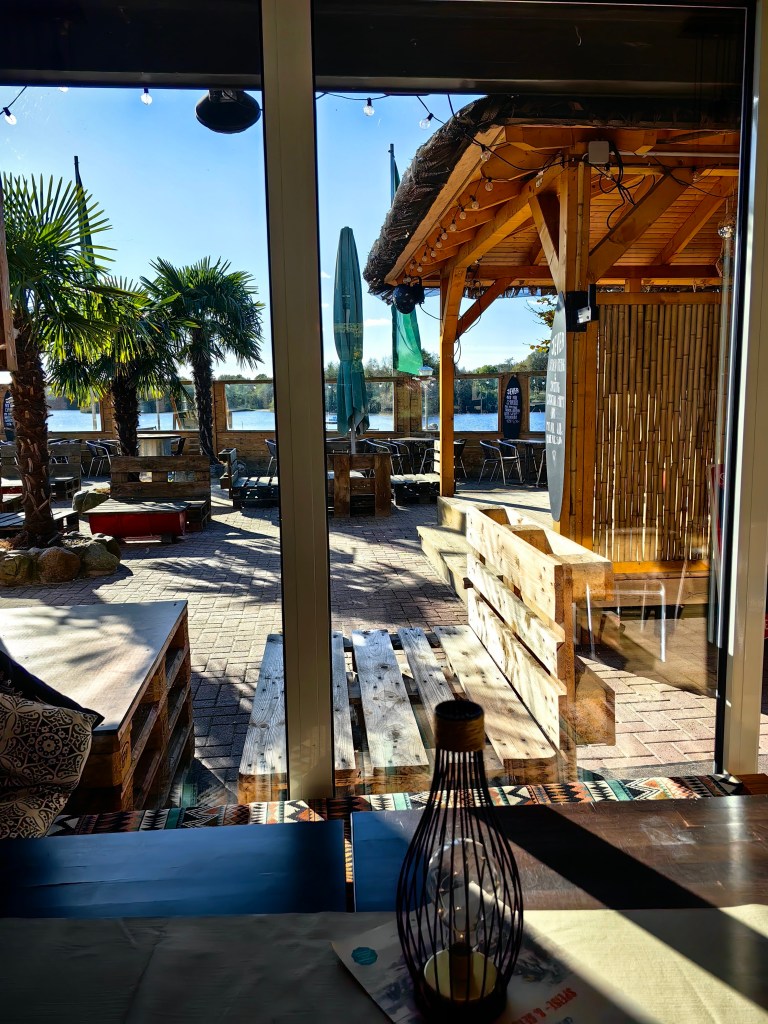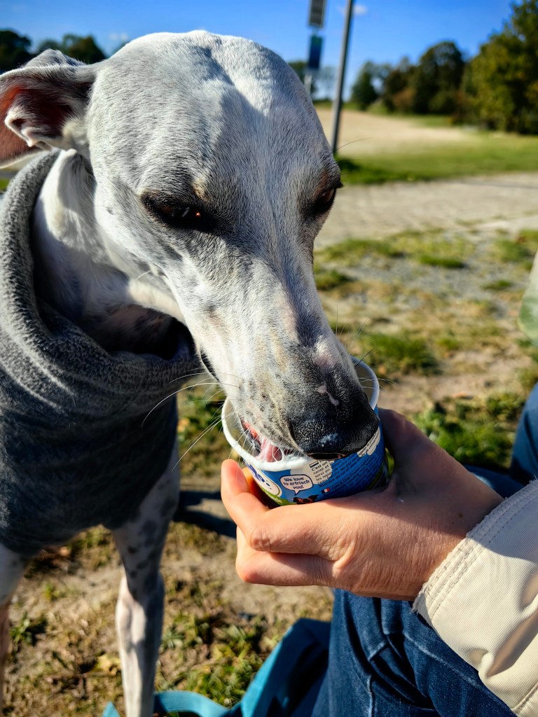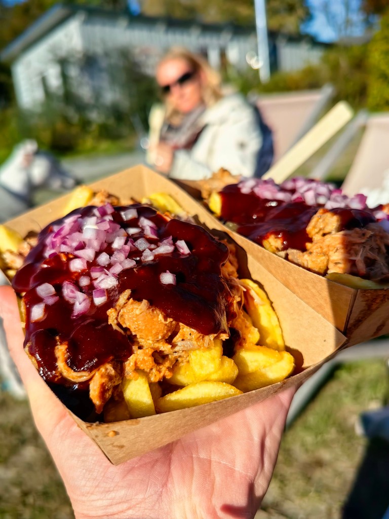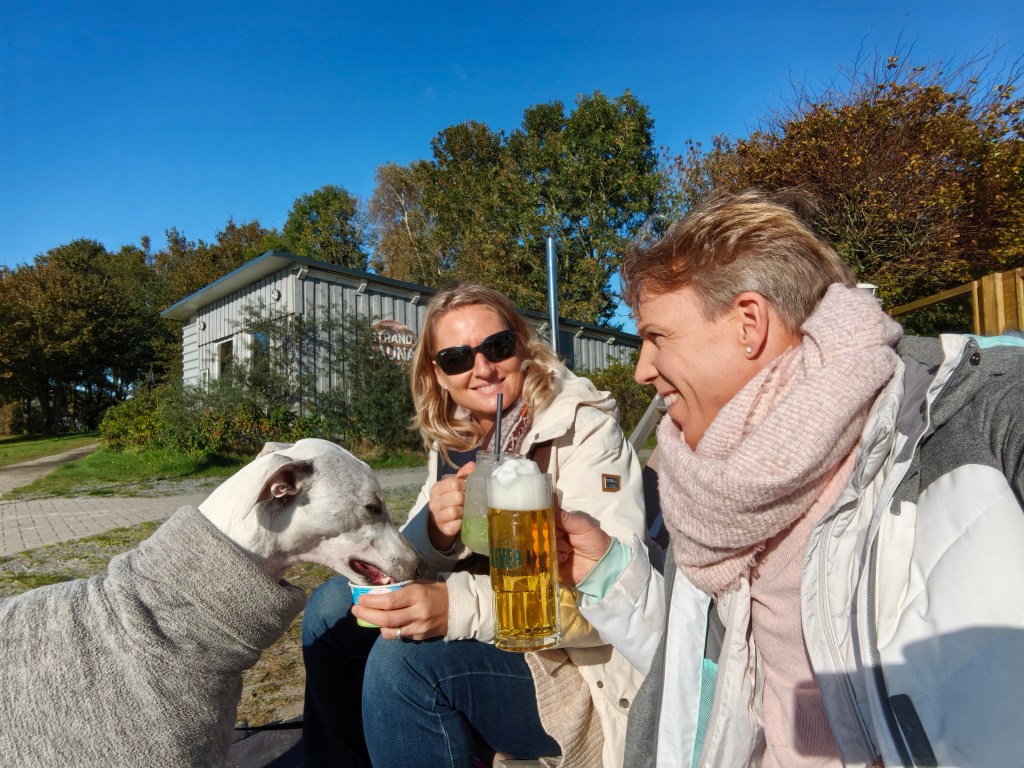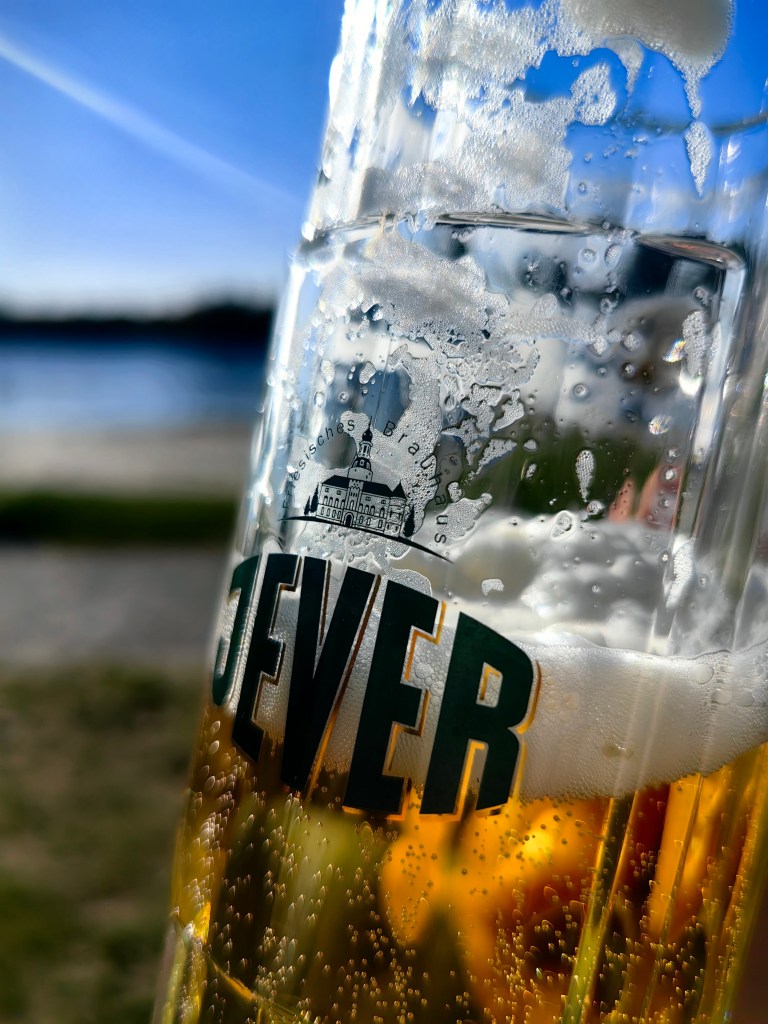 Wir bestellten – mega lecker – zwei „pulled pork boxen“, ein großes Jever und eine „Limette-Basilikum-Limo“. Die Hundedame bekam ein „Shrimps-Ananas Hundeeis“. Dann nahmen wir in den Sonnenliegen Platz und genossen die einfacheren, aber köstlichen Kleinigkeiten.