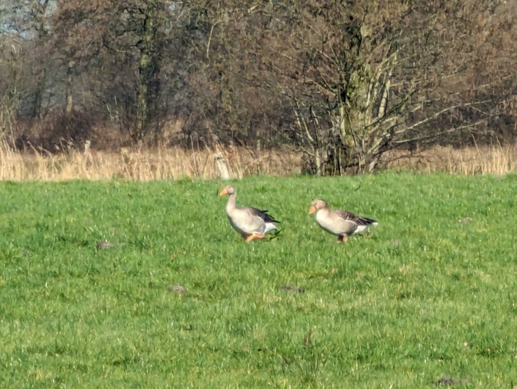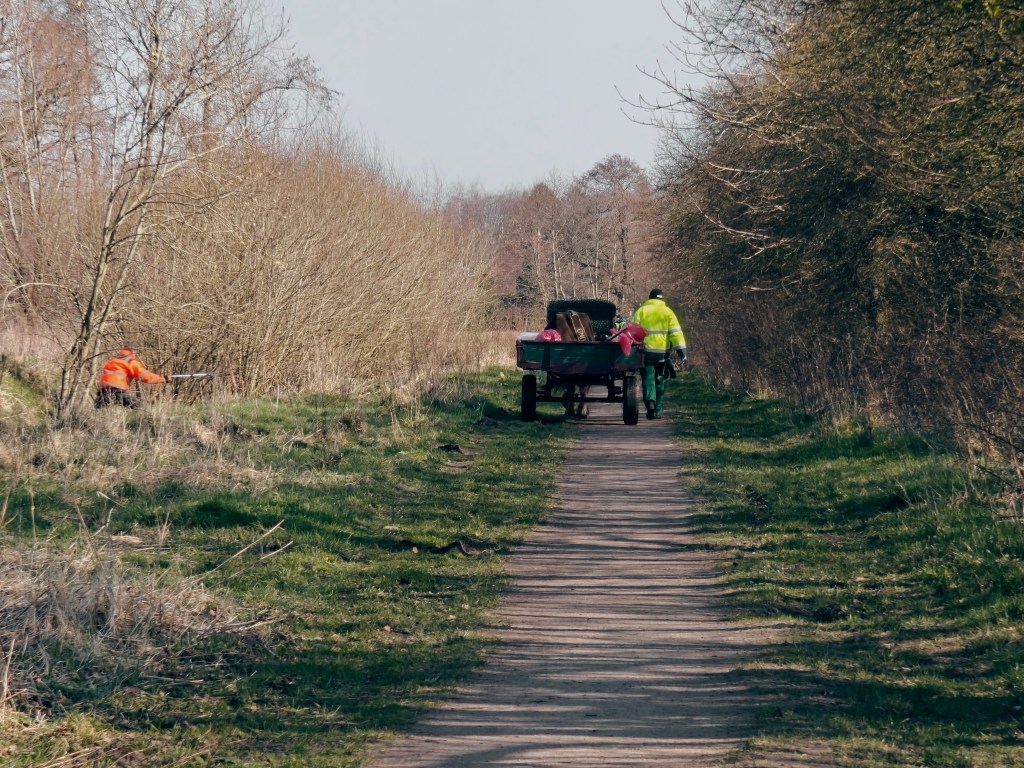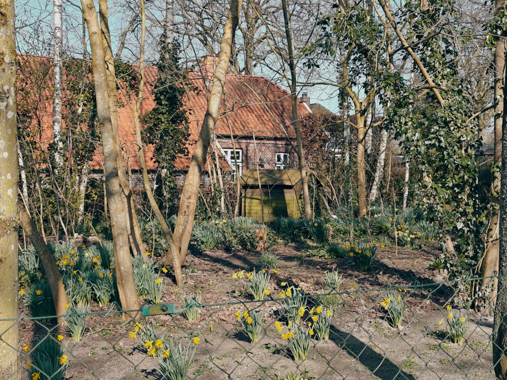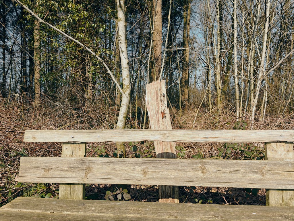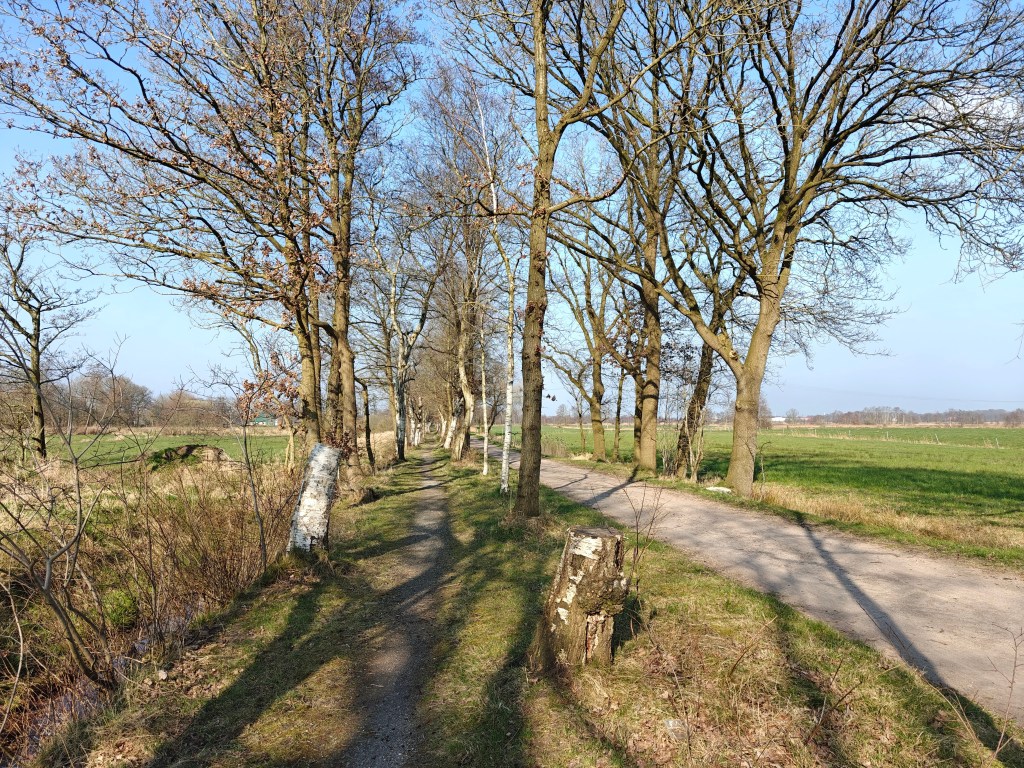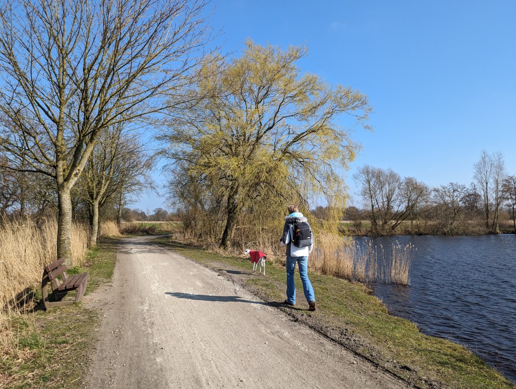 Also starteten wir zu einer kleinen Wanderung um die Seen in der Nähe von Sillenstede. Der Ort war sehr adrett und aufgeräumt. Toll hergerichtete alte Häuser lagen in niedlichen Gärten und die Wege aus dem Ort in die Landschaft waren wirklich schön. Die zwar kühle, aber frische Luft tat uns ebenso wie die Sonnenstrahlen gut. Wir trafen eine Gruppe Anwohner, die gerade mit ihrem Pferdefuhrwerk von einer Müllsammelaktion zurück nach Sillenstede kehrten und freuten uns über die gute Stellplatz- und Ortswahl. Wir liefen zuerst im Uhrzeigersinn um den Sillensteder See, dann ein Stückchen an der Jeverschen Landstraße und bogen dann zum Bösselhauser See ein. Wir fanden etwa bei der Hälfte der Strecke eine abgelegene Bank und genossen während unserer Pause die Sonne am windabschirmenden Waldrand und tranken einen Wein-Schorle.