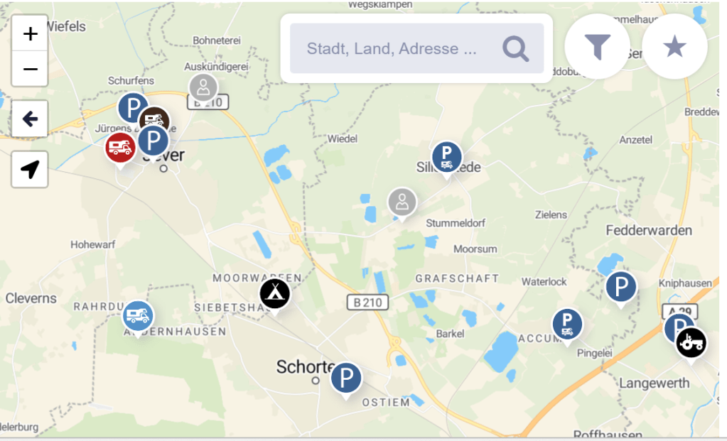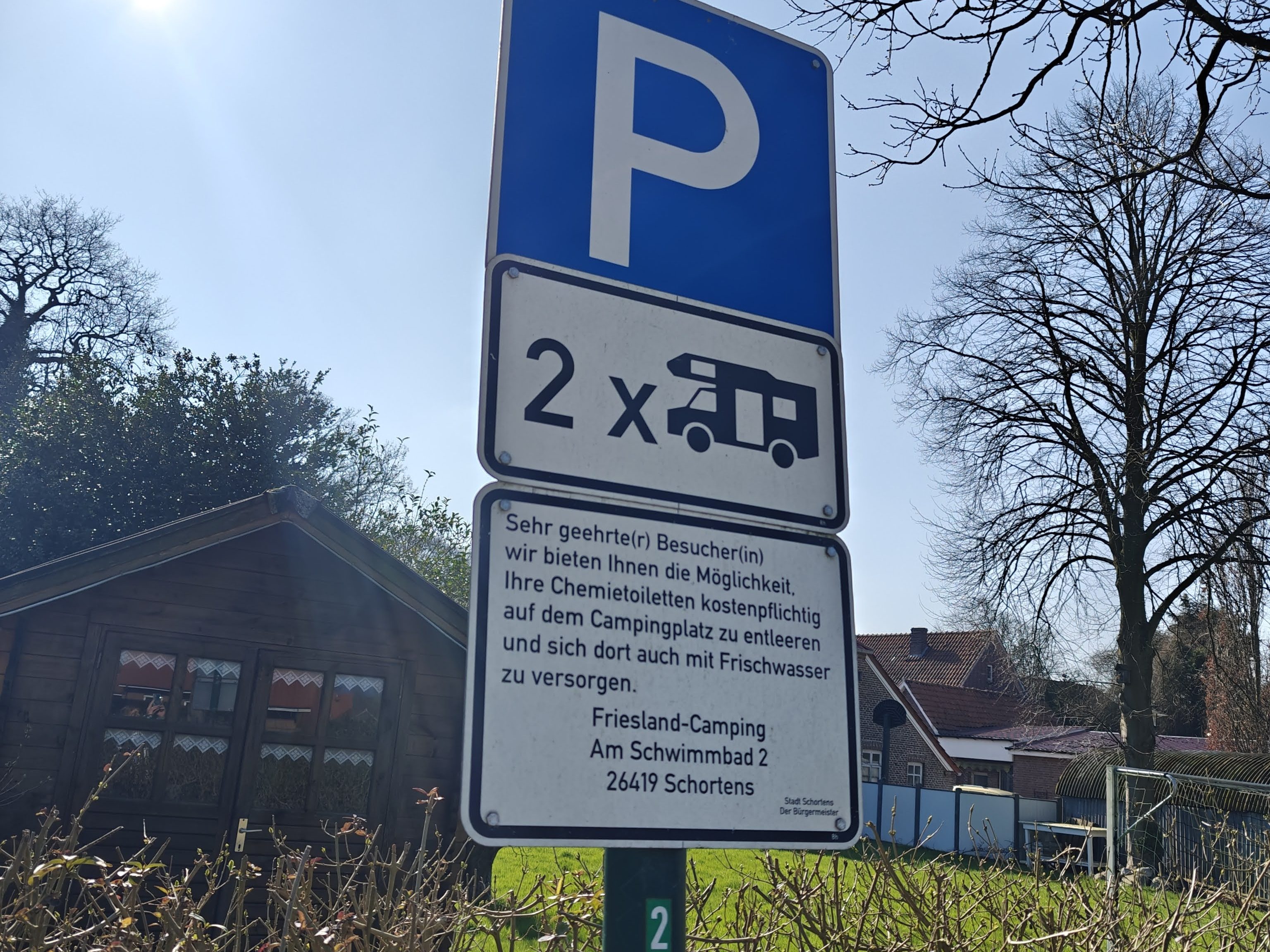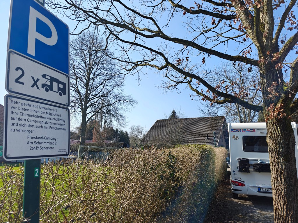 • Die (kostenlosen) Stellplätze bieten keine Ver- und Entsorgung an. Es gibt auf dem Campingplatz in Schorten die kostenpflichtige Möglichkeit, sein Grauwasser / WC zu entsorgen. Eine kostenlose Möglichkeit bietet die Firma „Von der Kammer“ direkt an der Autobahnabfahrt Sande (A29) an.