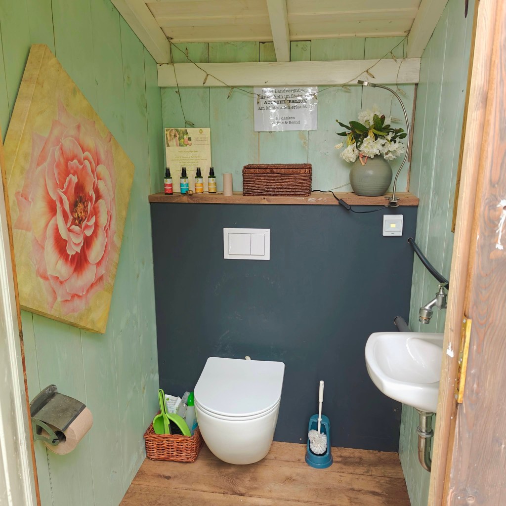 Für Wohnmobil-Reisende ist der Hof ein absolutes Paradies. Im Rahmen des „Landvergnügen“ Programms stehen mehrere Stellplätze zur Verfügung. Die Plätze sind großzügig und auf Wunsch sogar mit Stromanschluss ausgestattet. Auch eine Wasserentnahmestelle findest du außen am kleinen, sehr hübschen WC-Häuschen…