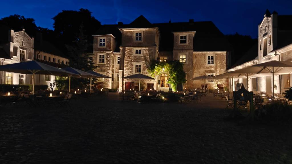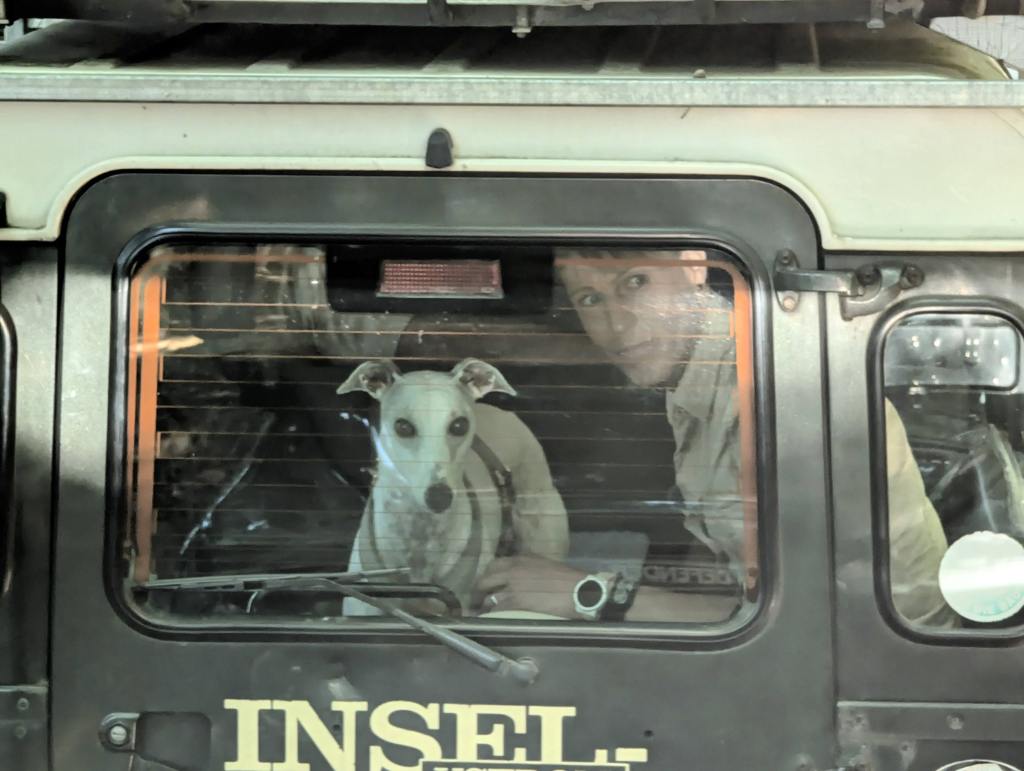 Nachdem wir in Wilhelmshof, kurz vor der kleinen Usedom Fahrrad-Fähre Ostklüne noch in einer „lost place“ Umgebung versucht haben, eine Hunderunde zu laufen, fuhren wir zum „Wasserschloss Mellenthin„. Die nächsten 2 1/2 Tage würden wir hier die goldene Hochzeit von Kate´s Eltern feiern und uns neben dem „Laben“ an den mega-Buffets im Wasserschloss am Samstag auch auf eine „Insel Safari“ begeben.