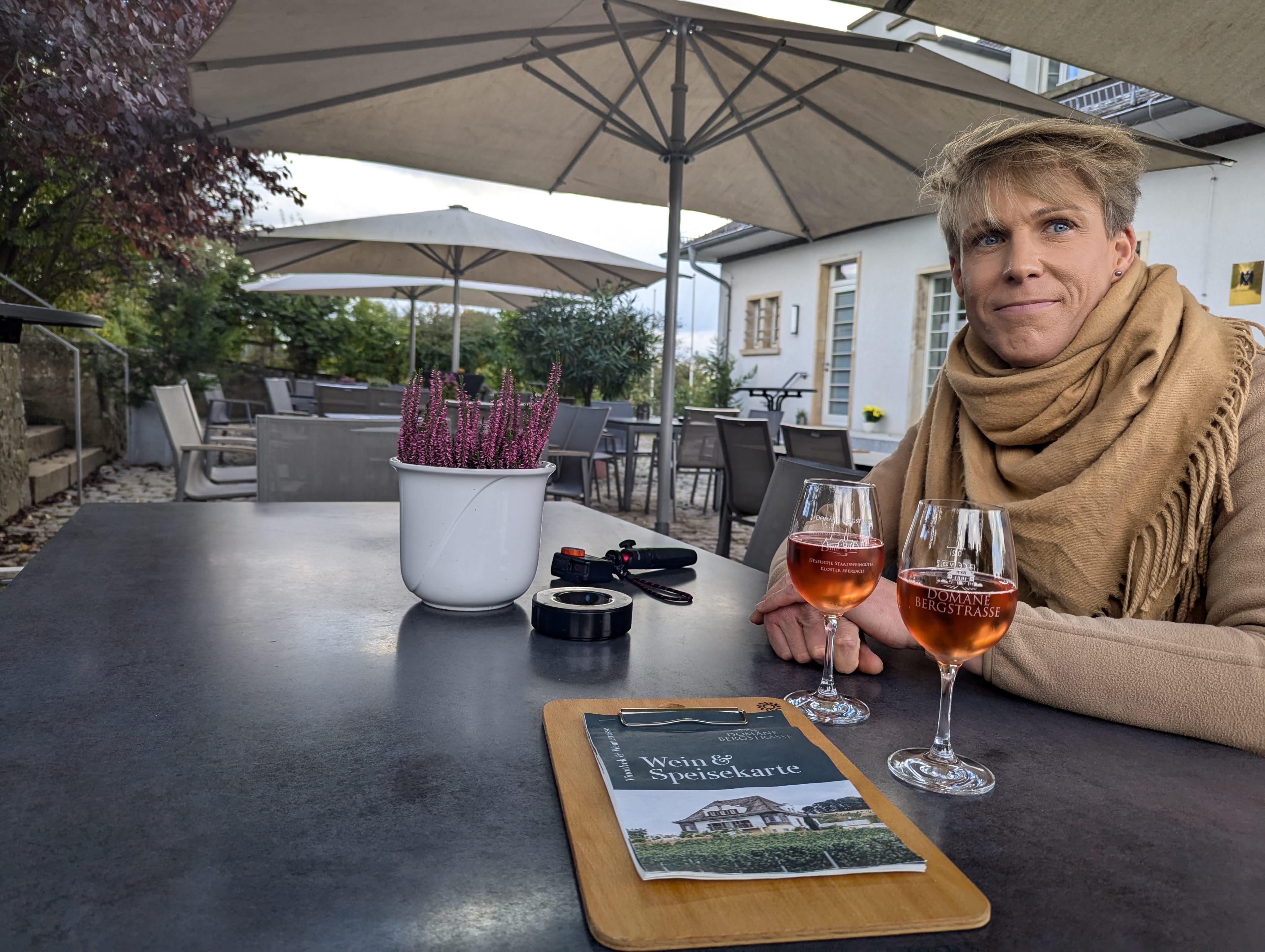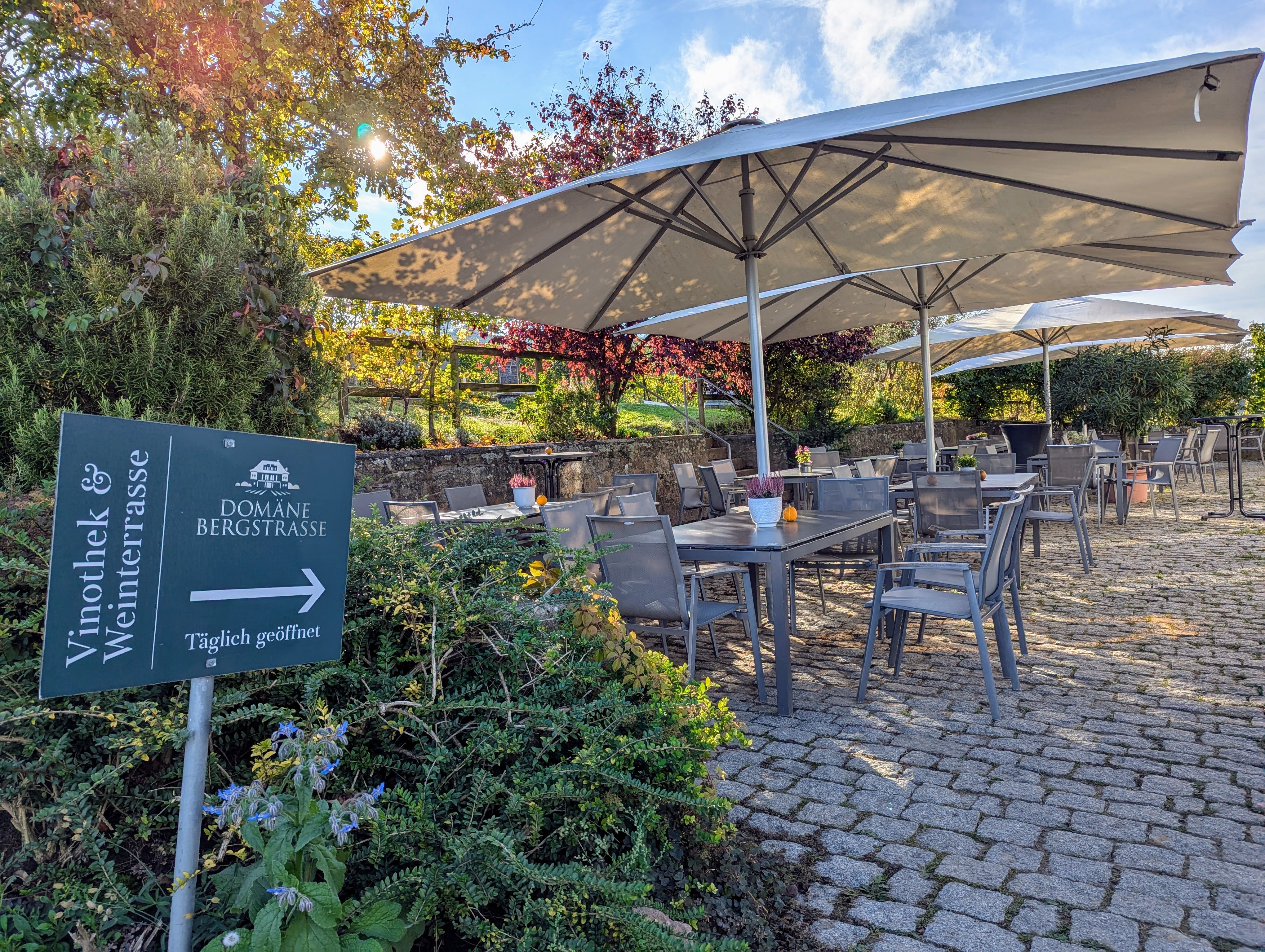 Am Nachmittag kamen wir dann bei unseren Patenkindern (und Eltern) in Gießen an und verbrachten einen schönen Nachmittag und Abend bei einem wirklich guten griechischen Restaurant „Skafos“ – direkt an der Lahn. Am Samstag – am späten Vormittag – verabschiedeten wir uns wieder aus Gießen und fuhren zu den Hessischen Staatsweingütern – zur Domäne Bergstrasse in Heppenheim.