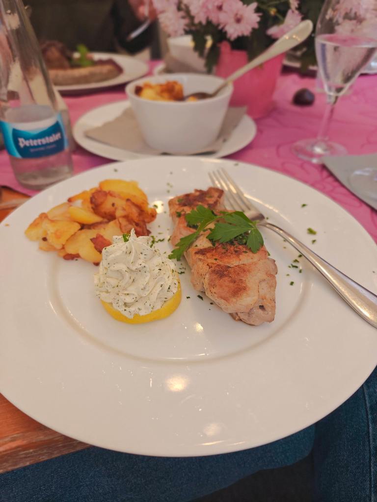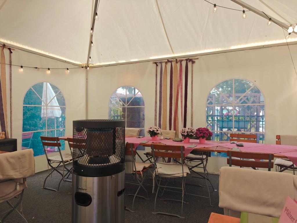 Wir trafen uns also um 1730 Uhr beim „alten Bahnhof“. Wir hatten einen Tag vorher reserviert und waren überrascht: bot man uns doch „lediglich“ einen Tisch im Zelt an. Wir hatten aber ja schon in den vergangenen Tagen mitbekommen, dass die Gastronomie hier in der Pfalz immer gut besucht ist und man besser keinen „spontanen“ Besuche planen sollte.